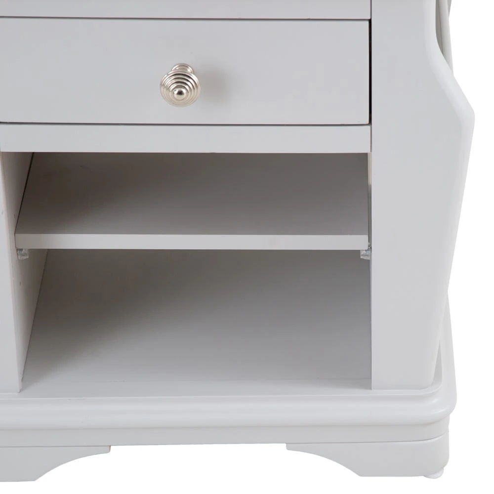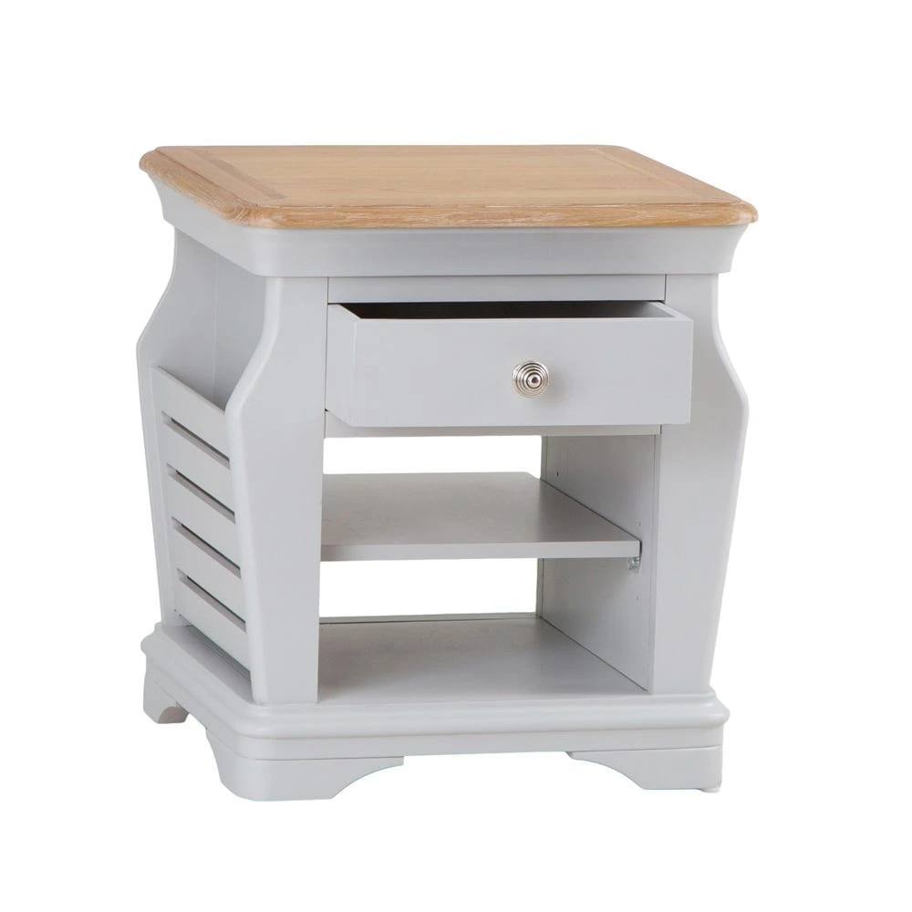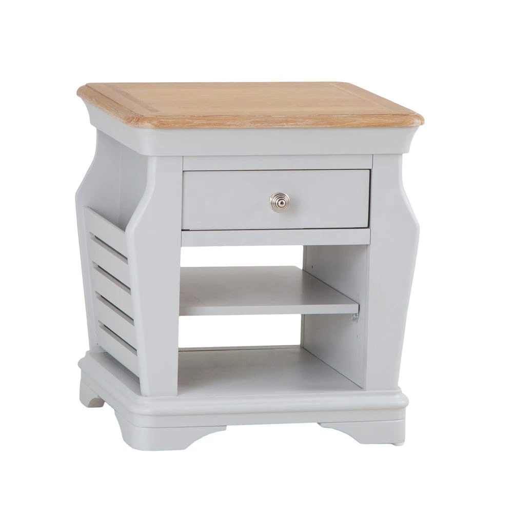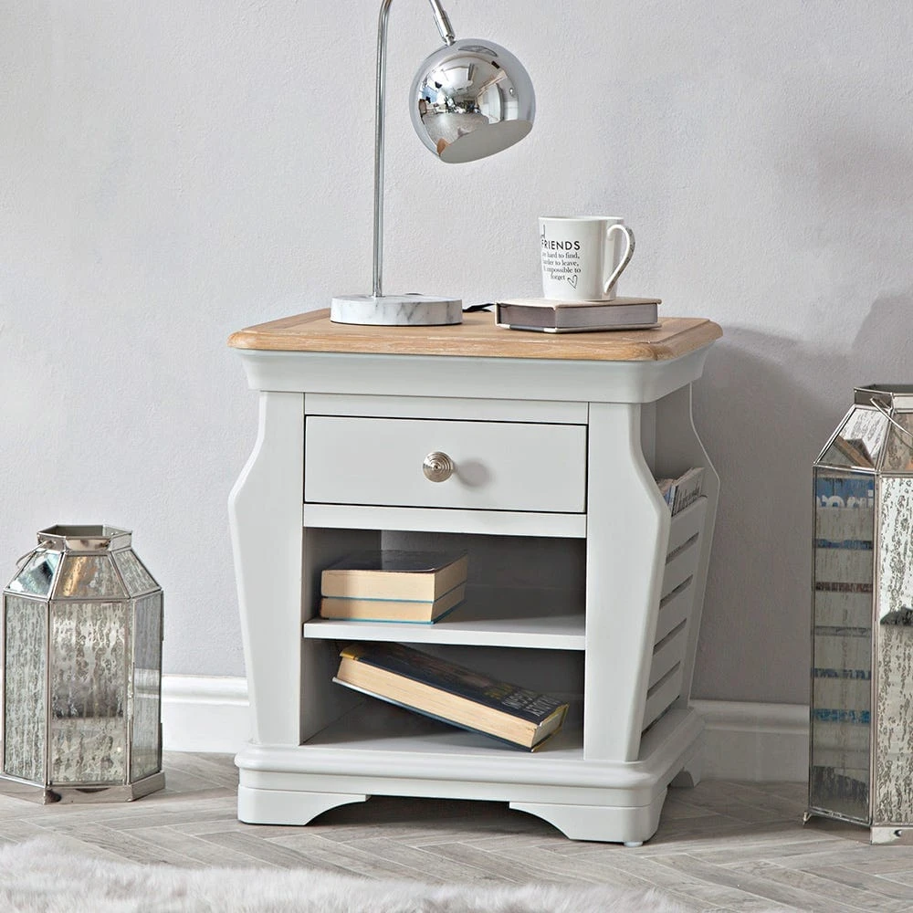The trendy Ashbourne grey painted lamp table with magazine holder lights up just about any room – it’s neat and compact, and bookended by two sublimely practical magazine holders.