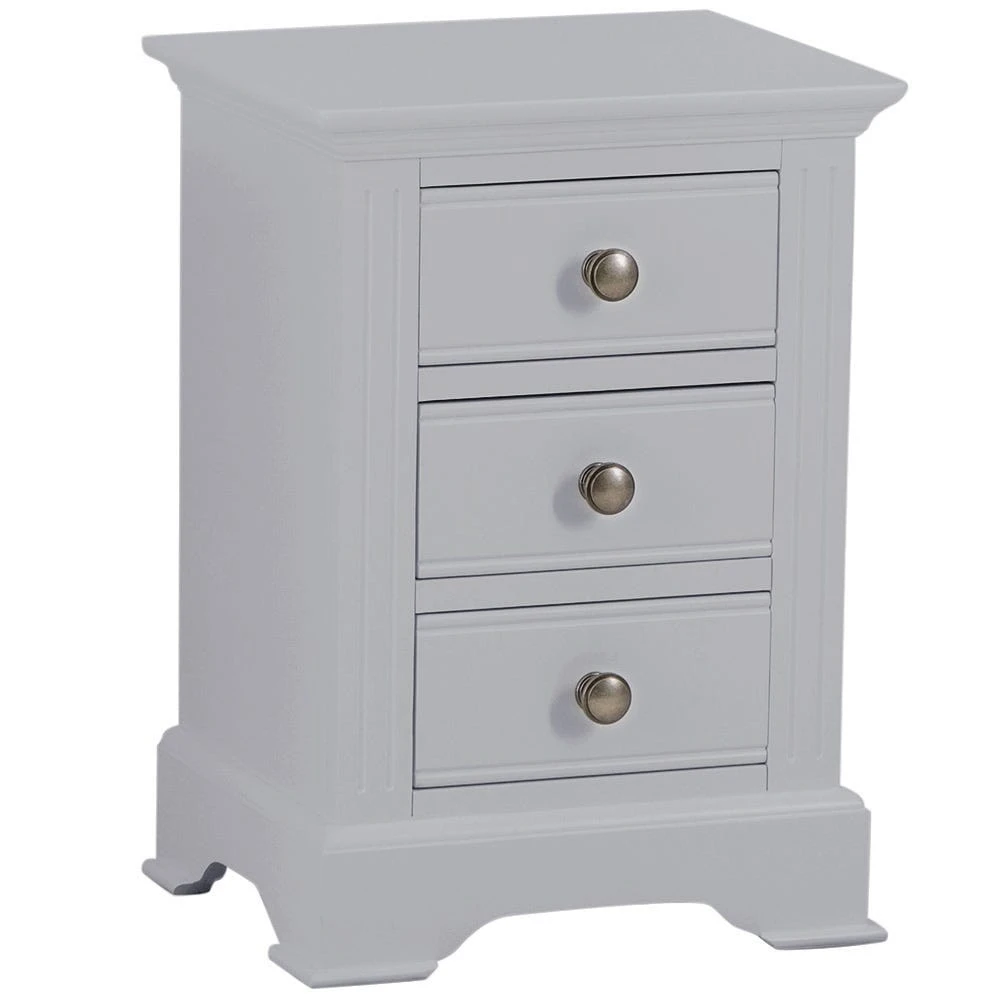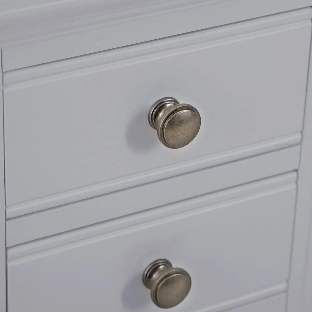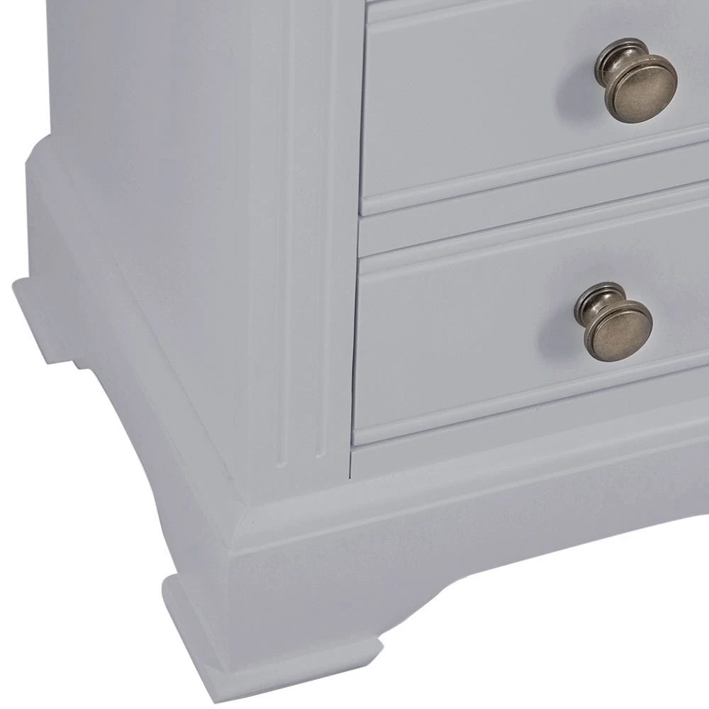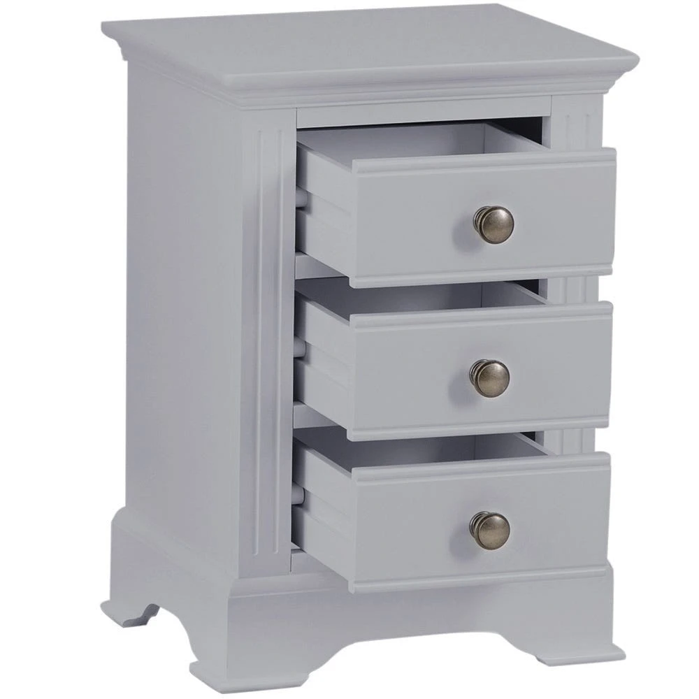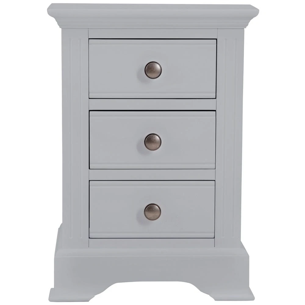 With the rounded corners on its top surface, you’ll be protected if you ever accidentally stumble into it. This bedside table’s sculpted cornice detailing and elegant pewter handles are perfectly offset by a grey finish which adds a softness to your bedroom furnishings. Use the trio of 20cm wide drawers for storing everything from pyjamas to paperbacks.