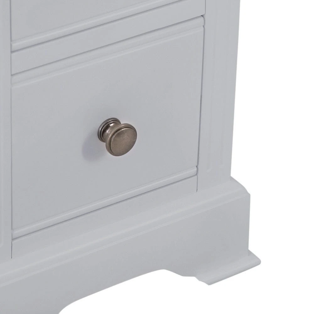 The round pewter handles catch the lamplight beautifully. The ornate cornice detailing and subtle indentations of this bedside table suggest artisan sophistication, all finished in the signature soft Banbury grey that brings a dash of calming cosiness into your bedroom.