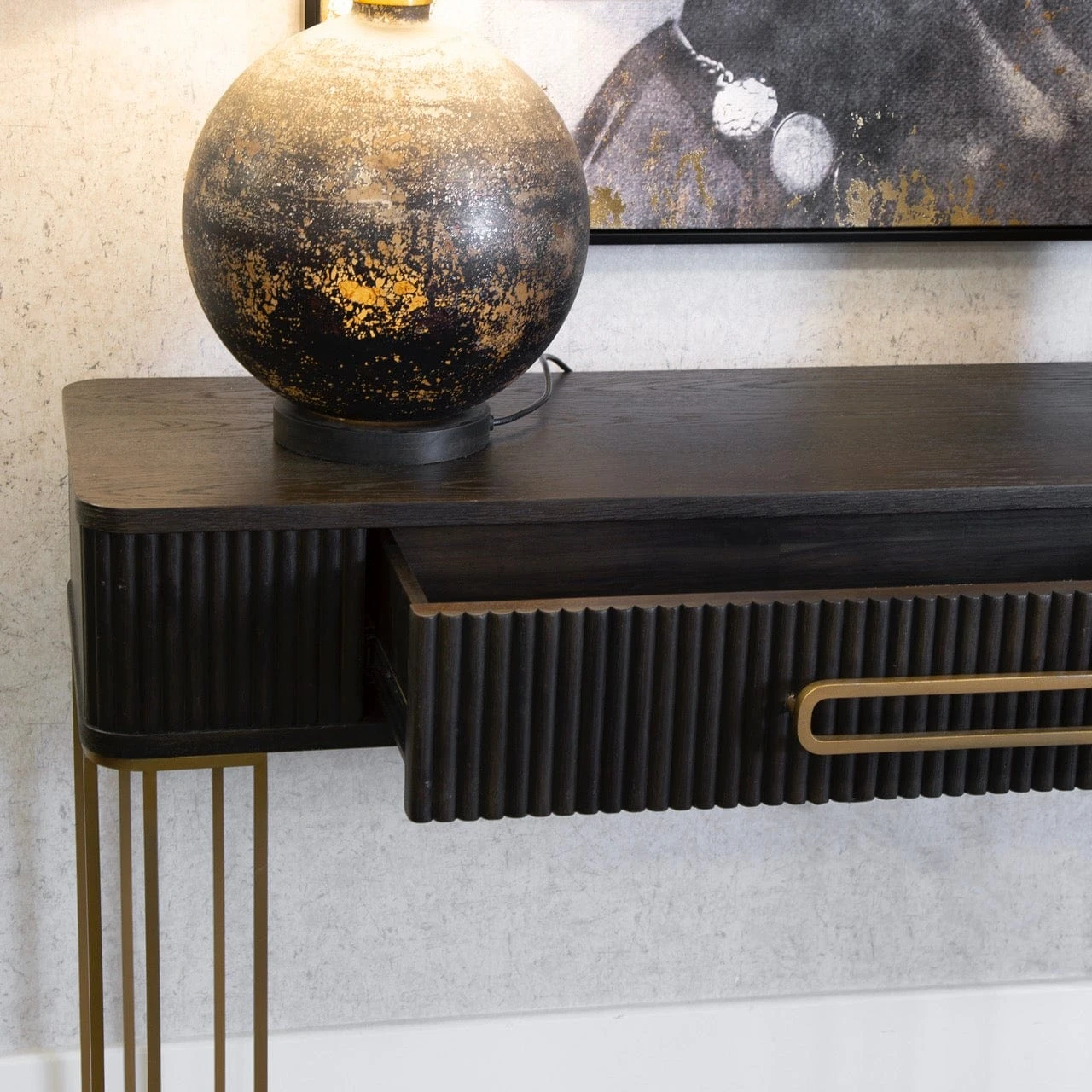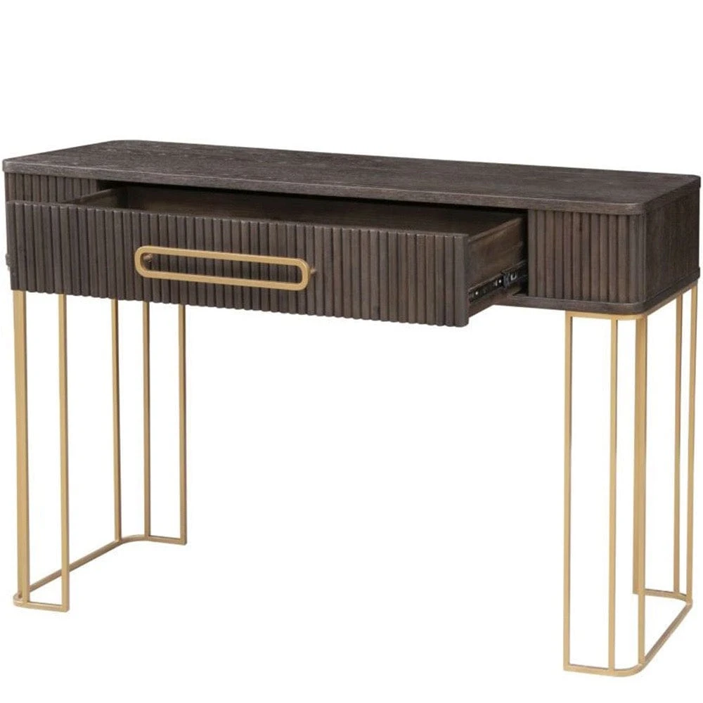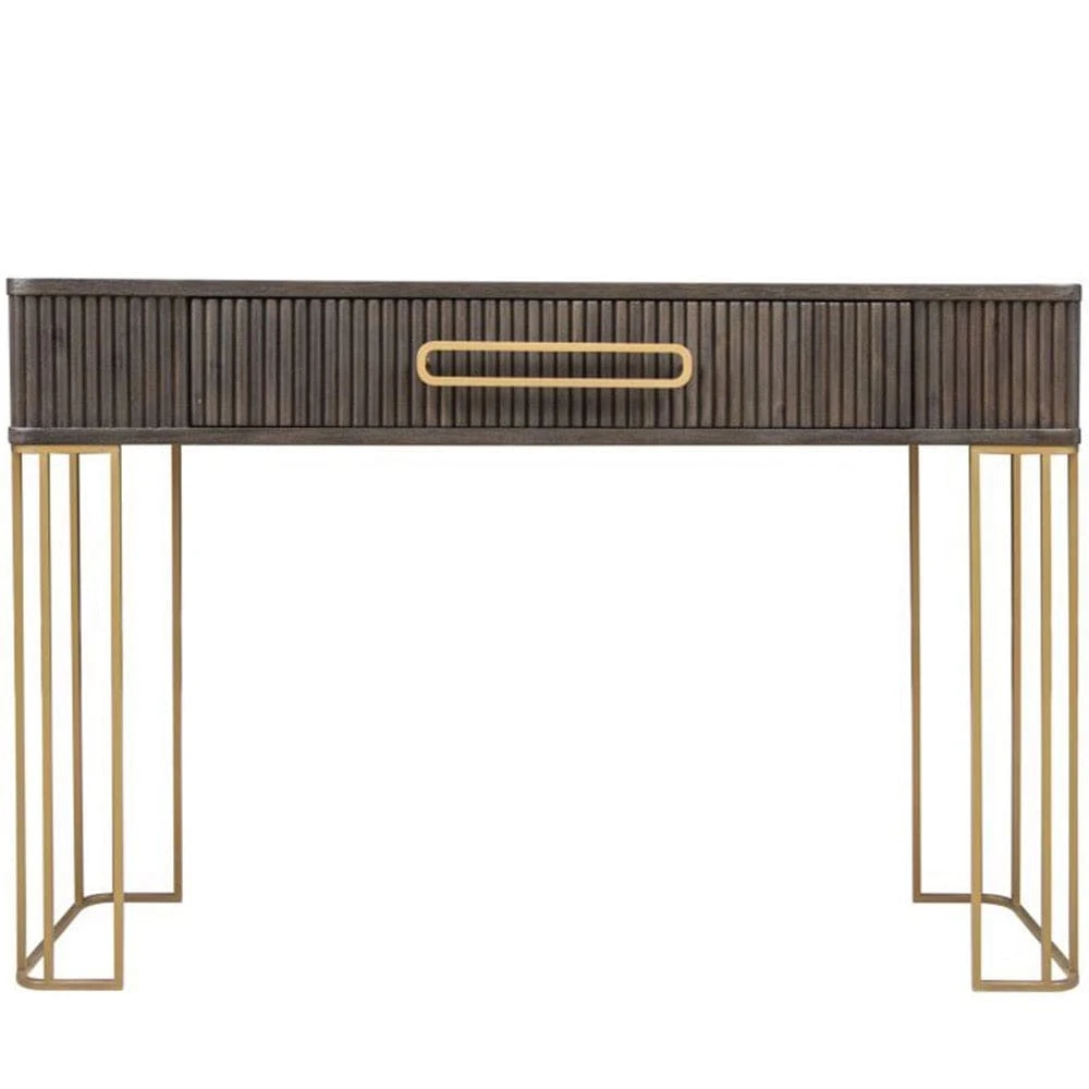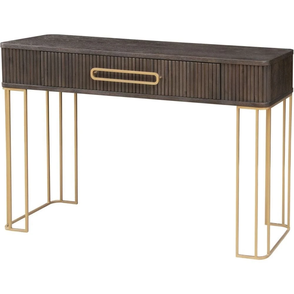Elevate your living space with the Bergamo Oak Console Table! This large yet stylish statement piece features dark oak with chic gold accents, one drawer, and enough room to store all your knick-knacks. This Console Table is large enough that it can double up as a desk. Winner!