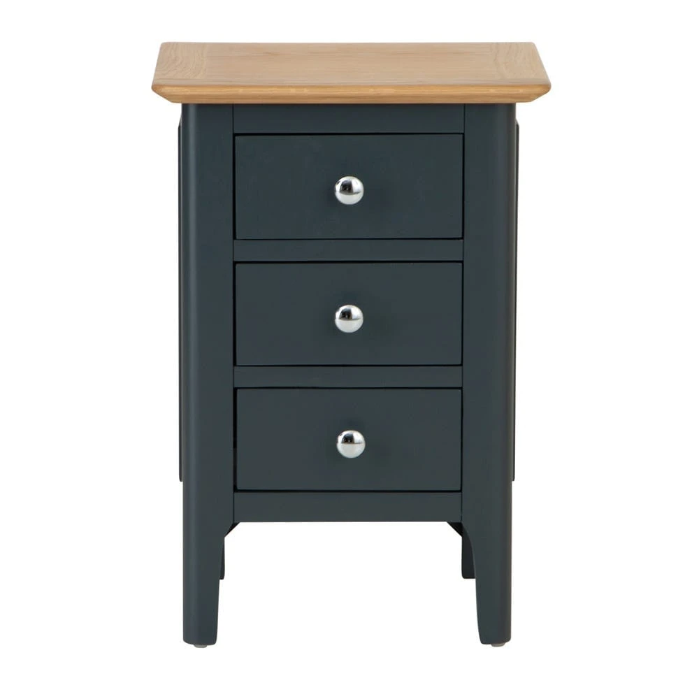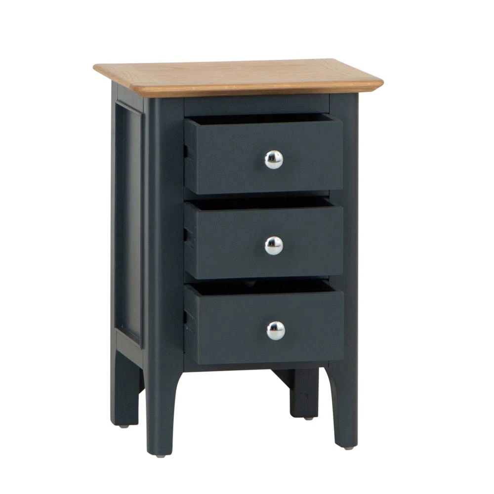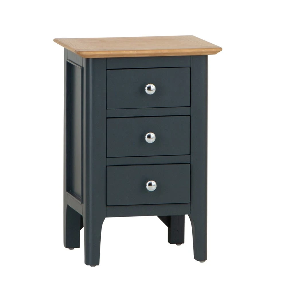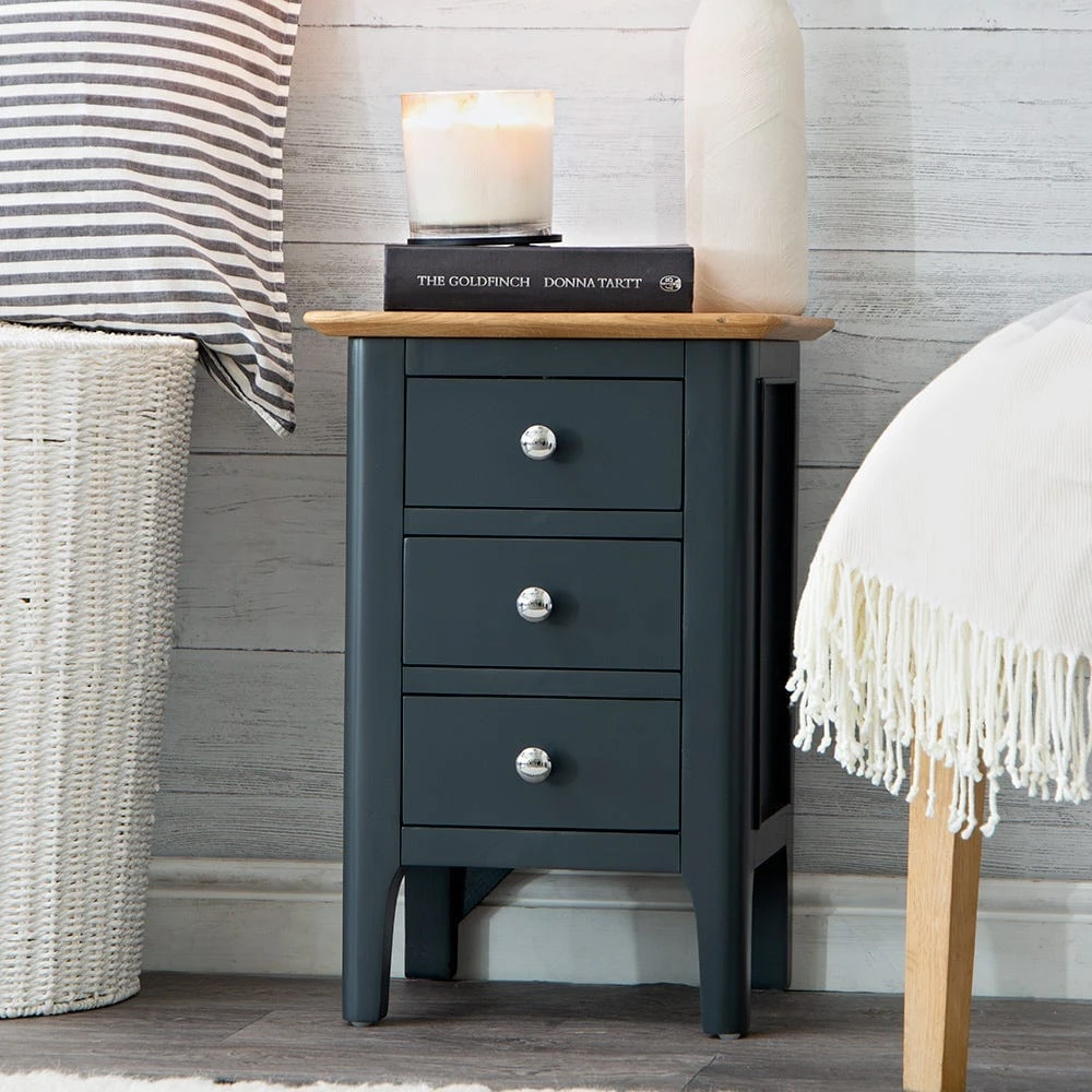 Small but mighty, the Bergen blue painted oak small bedside table sits comfortably next to your cosy bed.