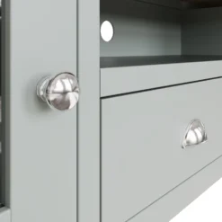 Its sleek symmetrical design is pleasing to look at and enhanced by the finer details, such as the shiny chrome handles and gorgeous oak top surface. Finished in a subtle stone shade, the cupboards and drawers make an attractive storage spot for all your glasses and corkscrews.