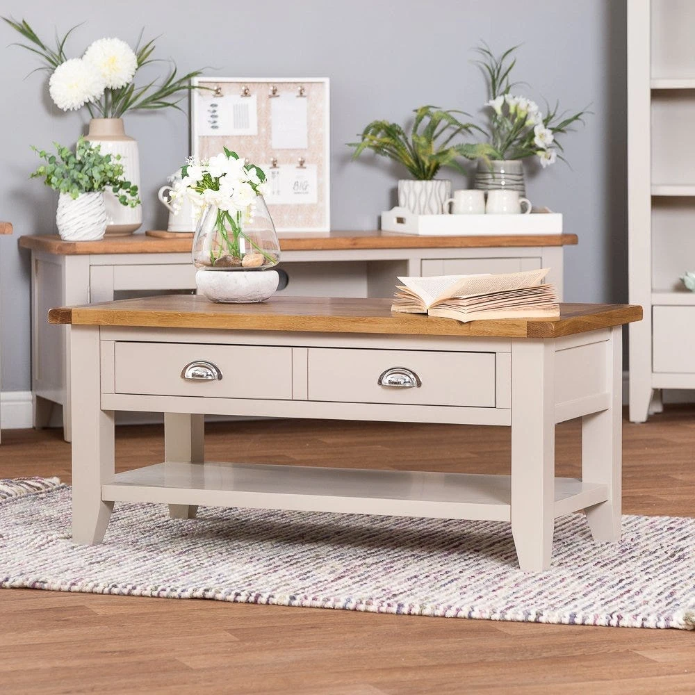 Someone put the kettle on – time for a sip of something warm and comforting. For a fitting centrepiece for your comfy living space, it doesn’t come much better than the Chester stone painted oak coffee table with drawers.