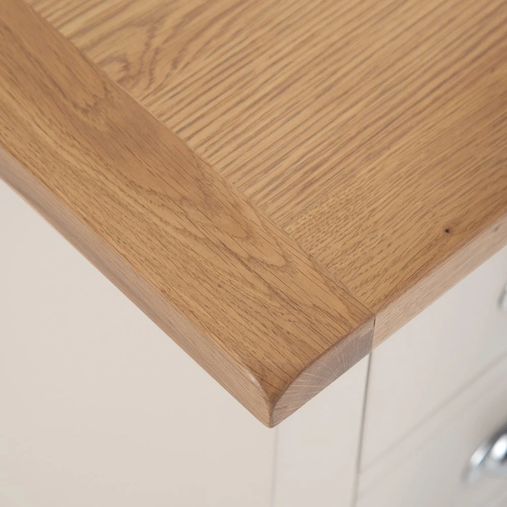 The chunky farmhouse frame is offset by contemporary chrome handles and an appealing oak wood top. The soft hand painted grey finish ties the whole modern-meets-classic look together.