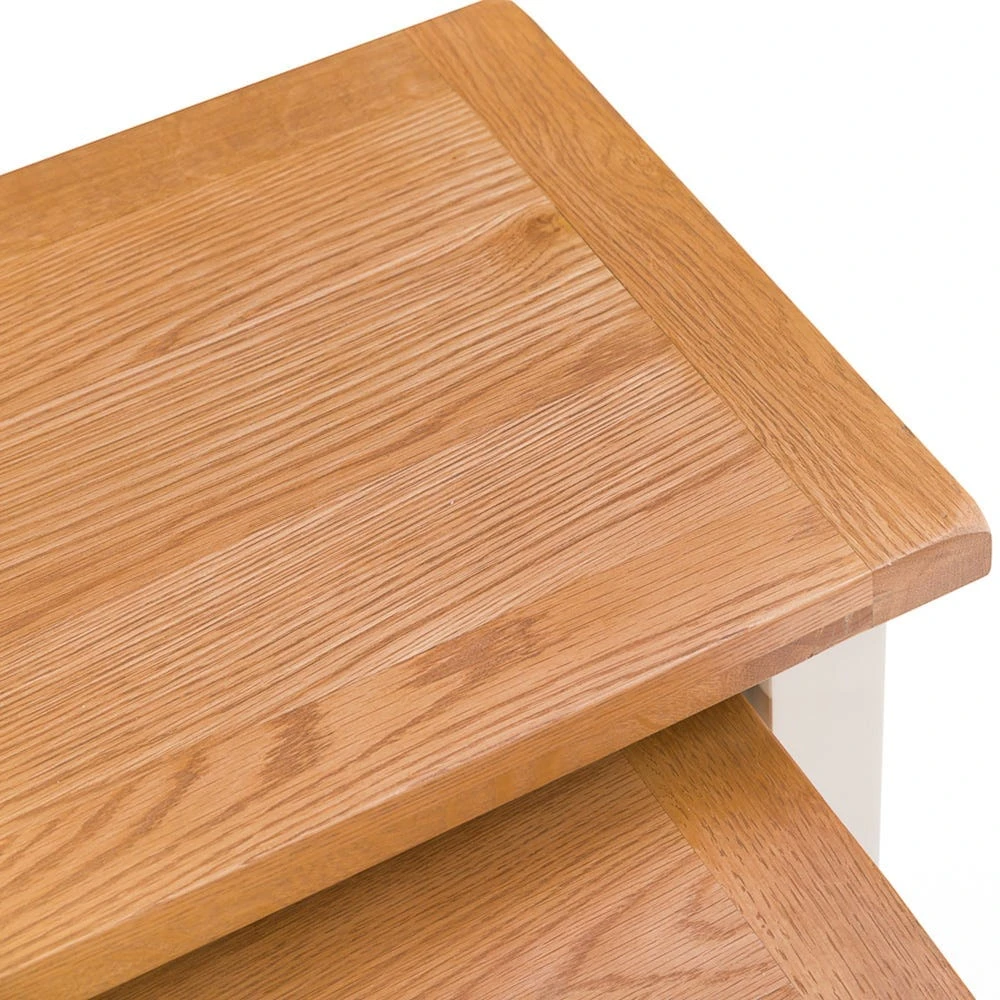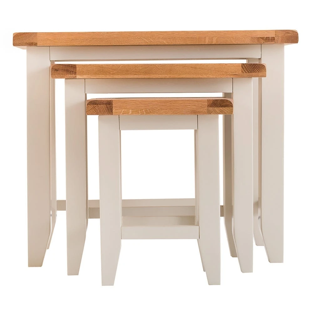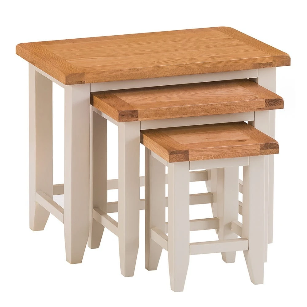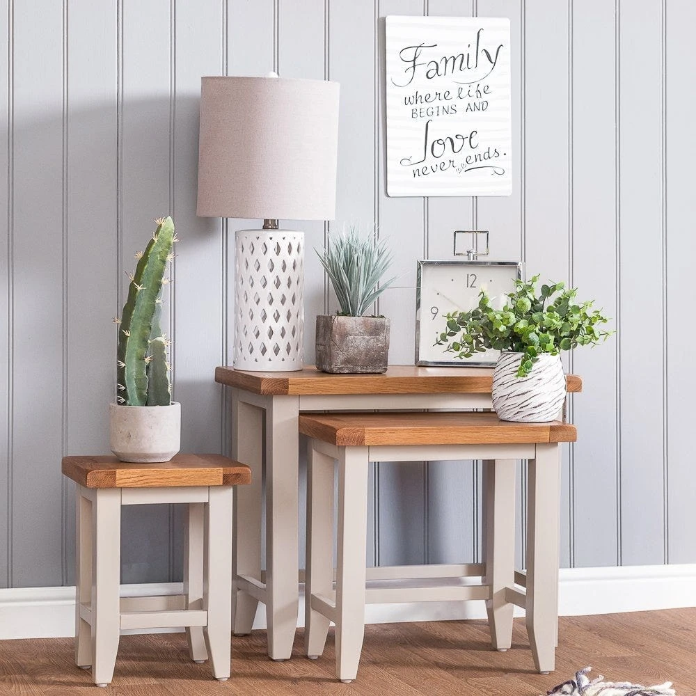 Arriving fully assembled and ready for you to use, you’ll instantly add convenient surface space to your home with the Chester stone painted oak nest of three tables.