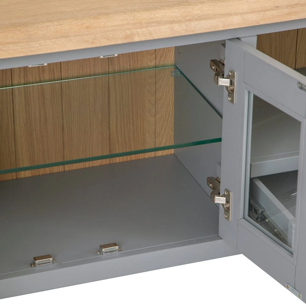 The chunky oak top gives a gorgeous view of the wood grain underneath the light whitewash, which is further accentuated against the storm grey colouring of the rest of the piece. Pairing perfectly with the