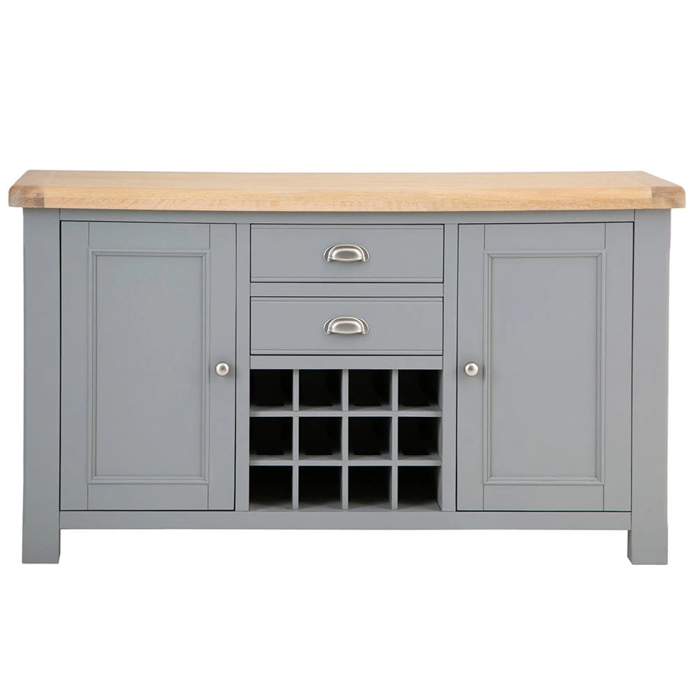 Set centrally between the cupboard space and below the drawers, for an even symmetry, the wine rack allows you to display your bottle collection or just keep something nice to hand. Topped off with a chunky oak countertop, you get the full visual effect of this wood coming through the light whitewash that boldly contrasts with the colouring of the rest of this storm grey sideboard.