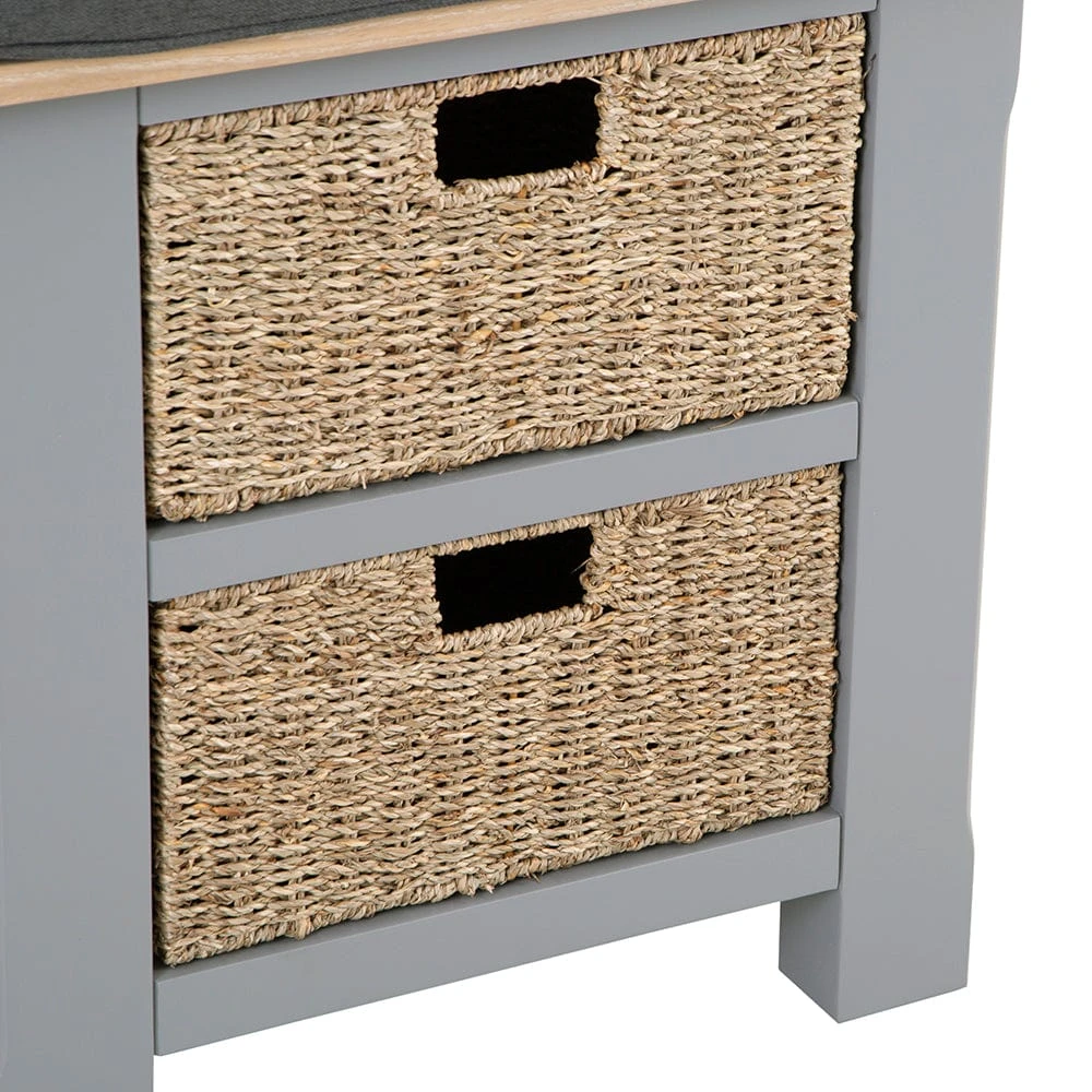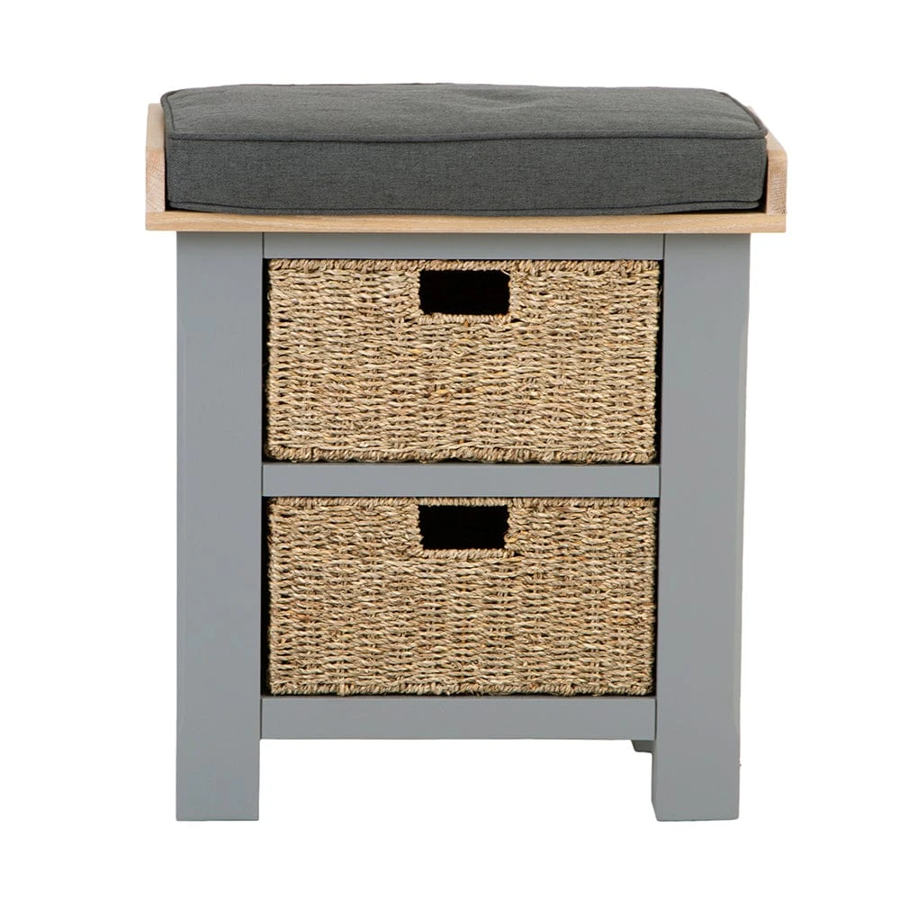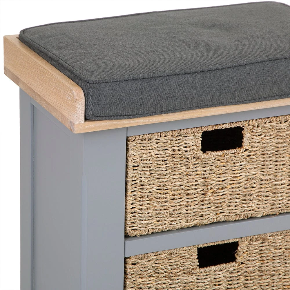 With a whitewashed oak top to offer a sturdy surface, it is padded for a comfortable seat, whilst the two seagrass weave baskets below add another dimension to it, so it becomes more than just a hallway bench seat. Acting as pull-out draws they allow you somewhere to put shoes, scarves or whatever other outerwear you wish to keep organised in your hall bench with storage. The storm grey finish gives a grown-up air to the wood grain and fits in with almost all design styles for an ideal addition to your hallway or house entrance.