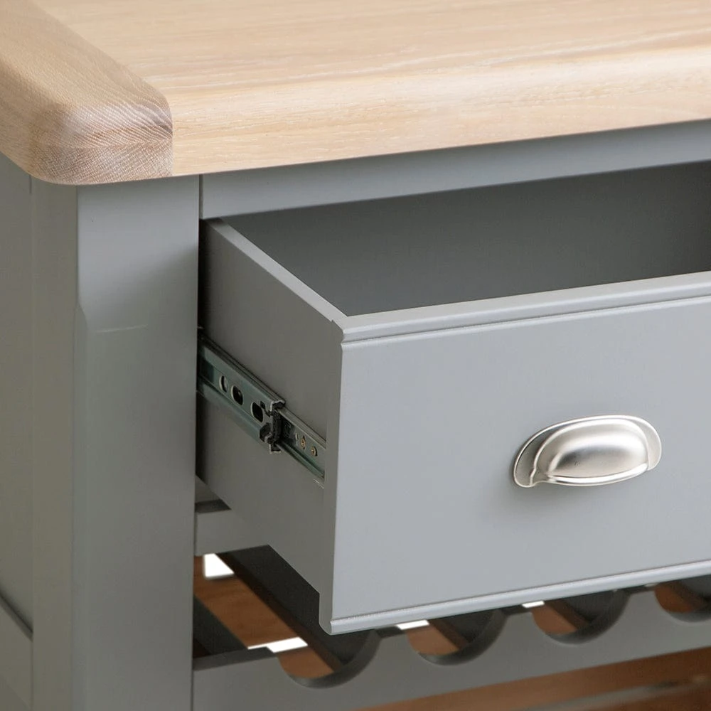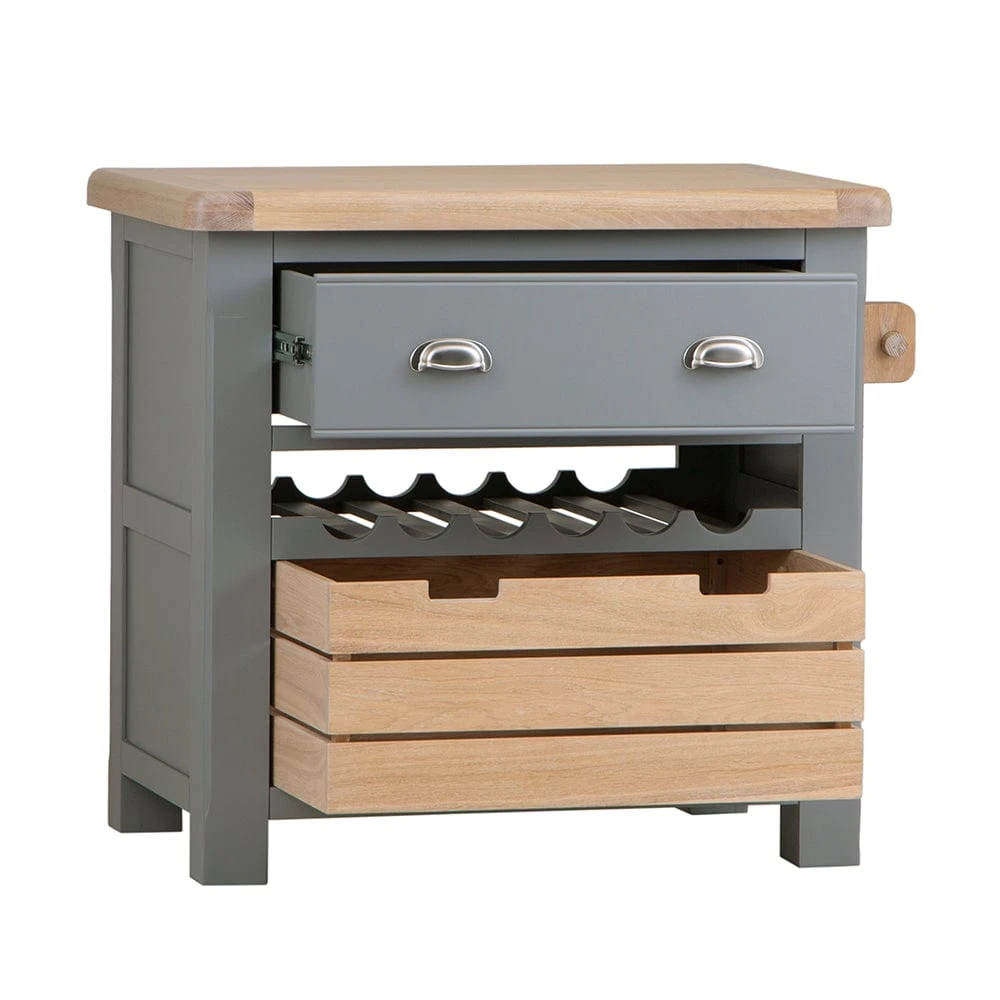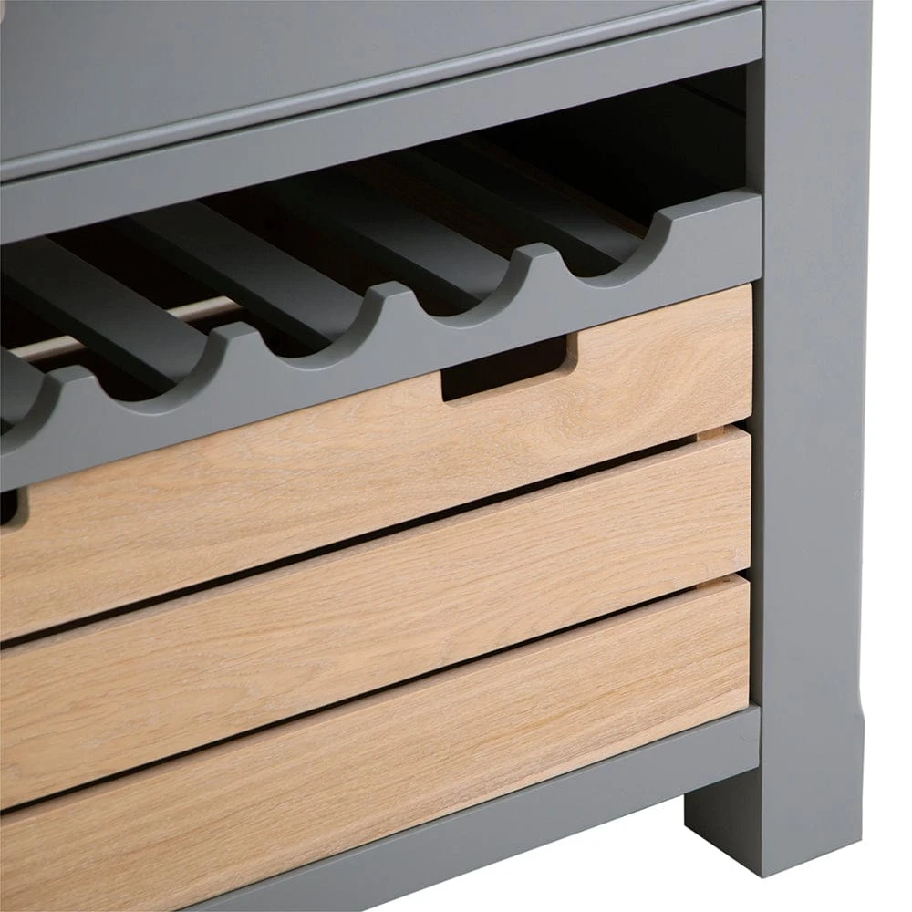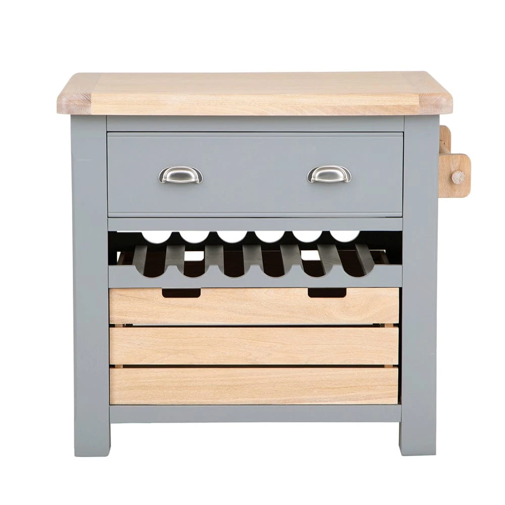 With a crate-style storage section at the bottom of the unit, you can keep cookware neat and tidy, whilst the wine rack above it allows you to keep a collection of bottles on display and ready to go for when guests drop by. With another draw on top, featuring chic cup-shaped handles, spoons and spatulas can be easily kept within reach for when you need them most. Cultivate an atmosphere of serenity in your kitchen with this perfect asset for storage and socialising.