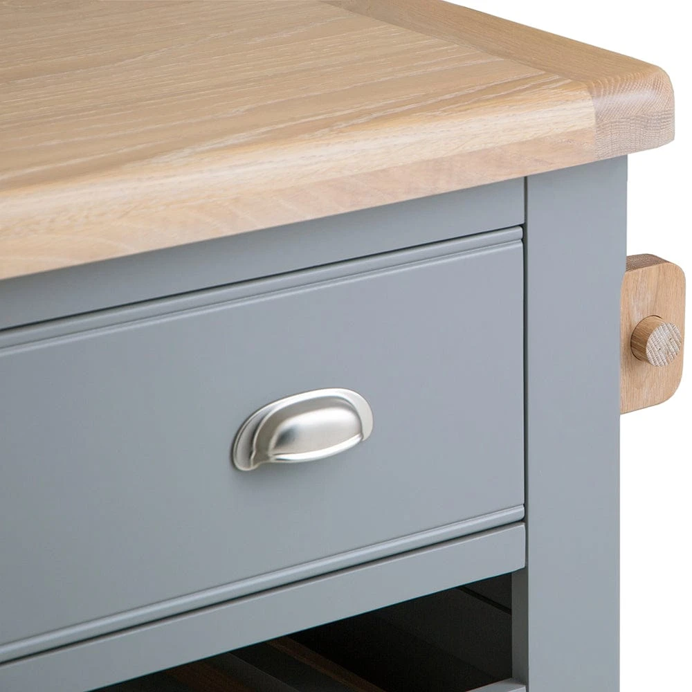 An elegant island of calm amongst stormy settings, this small kitchen island brings the central haven you need to your cooking space. The storm grey colouring and whitewashed tops of chunky oak, with rounded edges, are evocative of the dramatic Dorset coastline. The island itself provides a point to prepare food, pour a glass of wine, or just gather around on a night in.