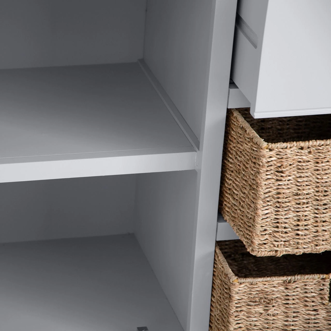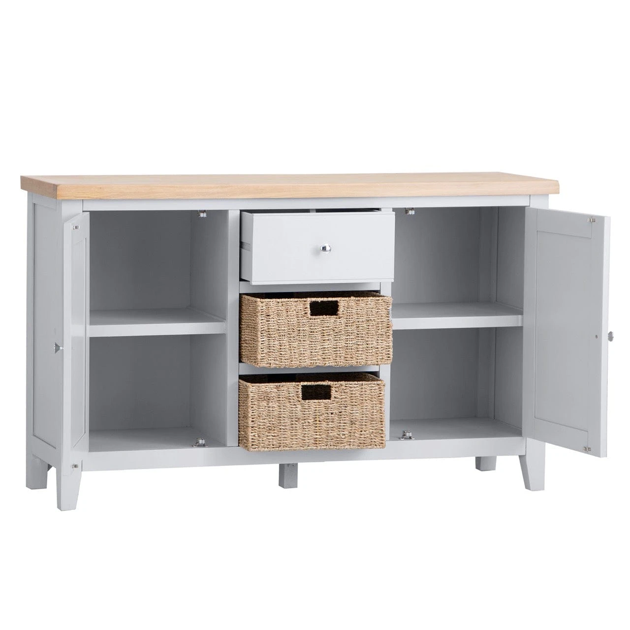 Radiating elegance and practicality, the Eaton Grey Painted Oak 2 Door Large Sideboard featuring Wicker Baskets is an ample storage solution that emanates class and style. A soft, dove grey sideboard, its neutral palette allows it to complement most decors, be they contemporary or classic in design. Two large cupboards, a drawer and two wicker baskets give you plenty of room for your keepsakes whilst still offering up a durable and delightful piece of furniture.