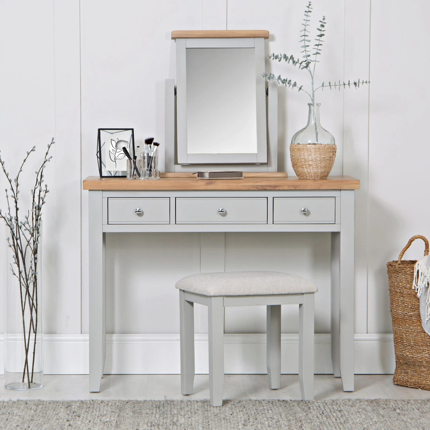 so that you can get a vanity table with a mirror that matches, this dressing table mirror is as exquisite as it is practical. Â A classic piece of furniture, the limewashed trim adds character to the neutral dove grey tone to give a suave and sophisticated look to any room.