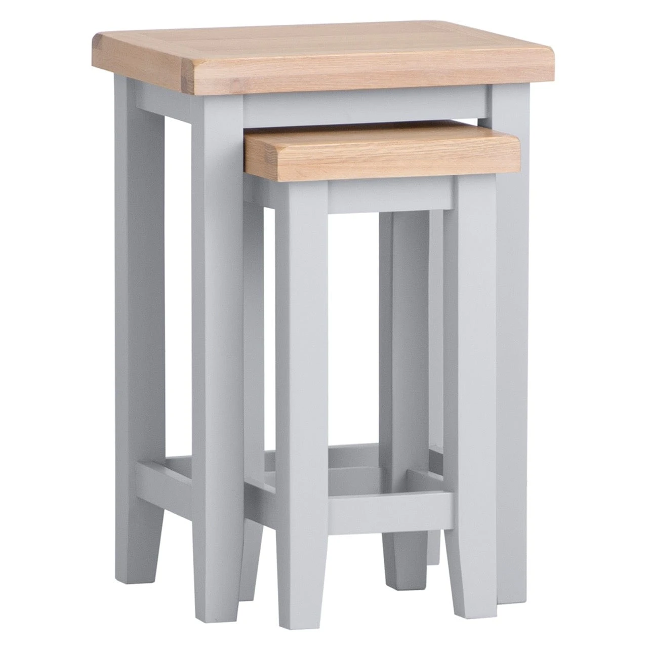 Discover the versatile and charming Eaton Grey Painted Oak Nest of 2 Tables, with meticulous craftsmanship, and a soft grey shade that complements almost any decor these tables are the epitome of functional elegance.