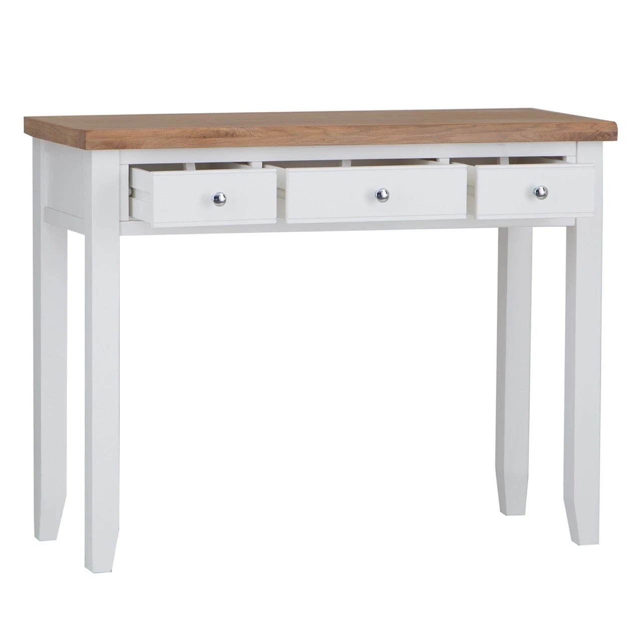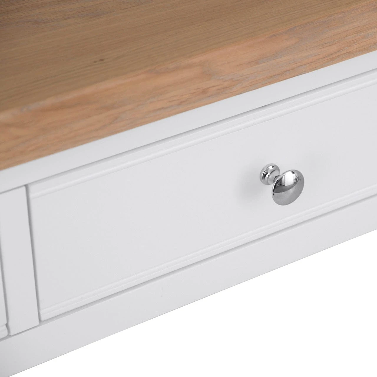 This Eaton White Painted Oak Dressing Table is luxury craftsmanship at its finest. Its sleek, white painted frame is accented with a lime washed top for an understated yet elegant touch. Enjoy the distinguished beauty of this piece in your bedroom or dressing area.