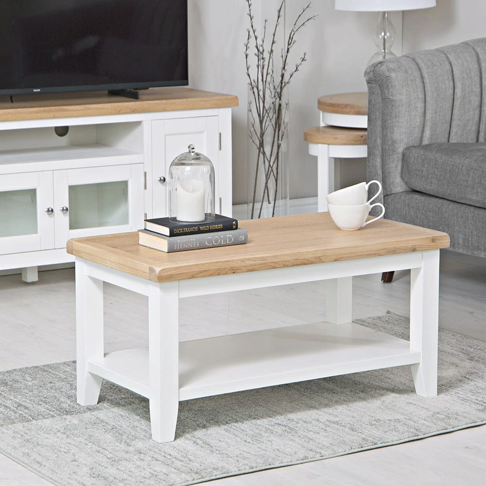 A charming yet functional centrepiece for your living space, the Eaton White Painted Oak Small Coffee Table brings a sense of timeless style to your home. With an elegant white finish that matches any décor, this coffee table with storage offers you a focal point to gather around as well as somewhere to keep remotes, magazines, and coffee table literature.