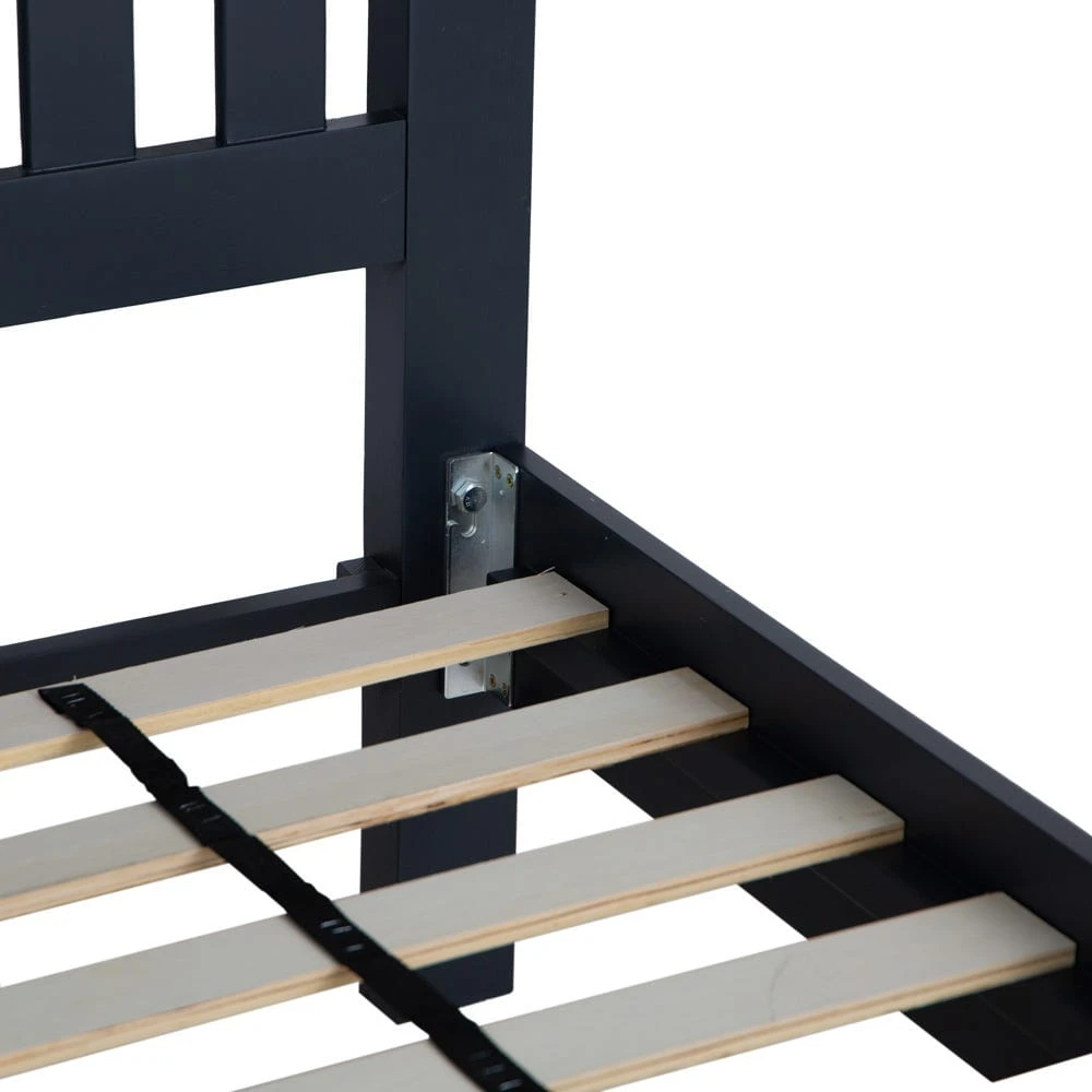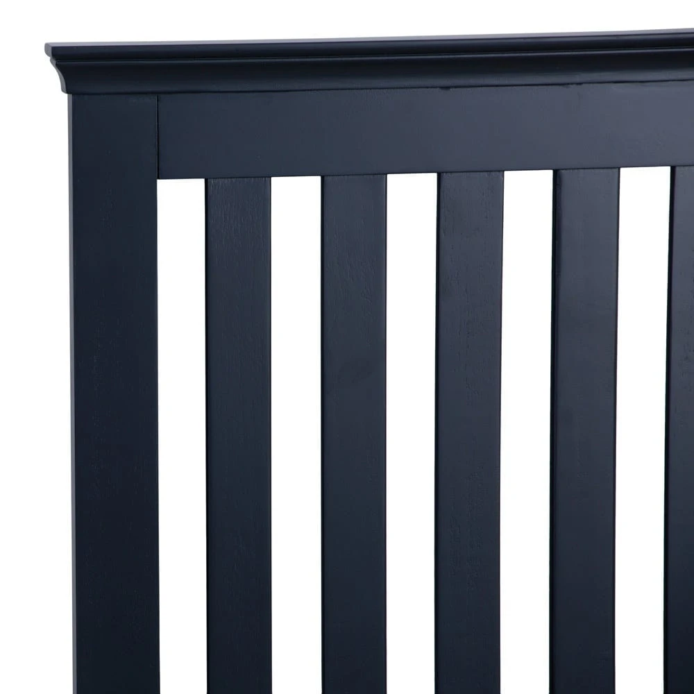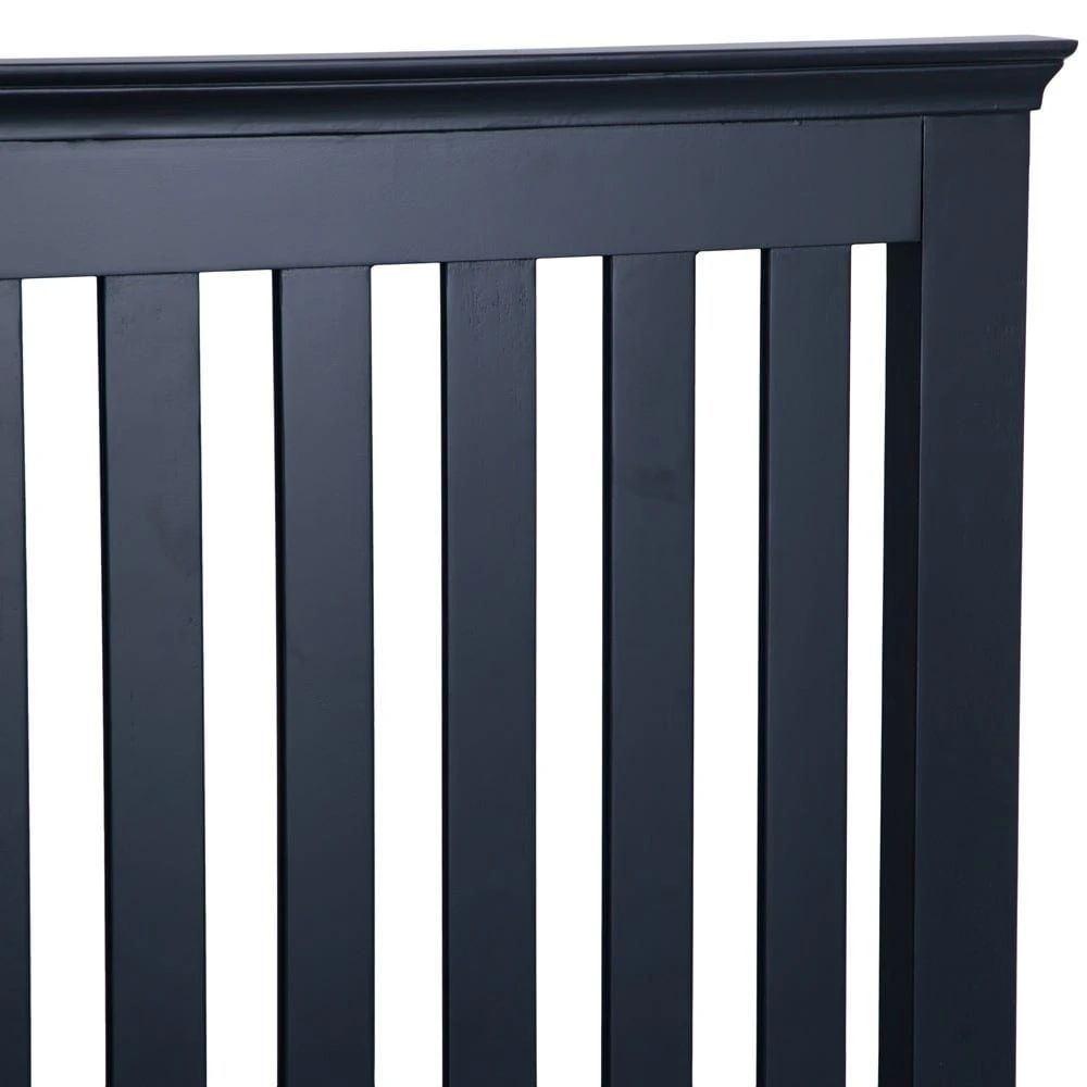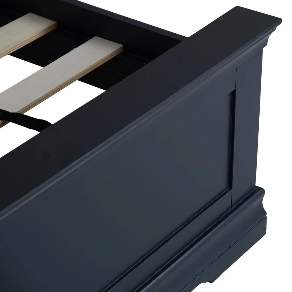 Solidly stood upon bracket feet, both the headboard and footboard are topped with sculpted cornice detailing. This bed frame has the look and feel of a bespoke Edwardian or Georgian piece of furnishing. The slatted headboard stands 128cm high and makes for a fitting bedroom centrepiece, especially when lined with a row of supple cushions. Dress your bed up with bright white bedding to make the deep grey colour of this bed frame stand out brilliantly.