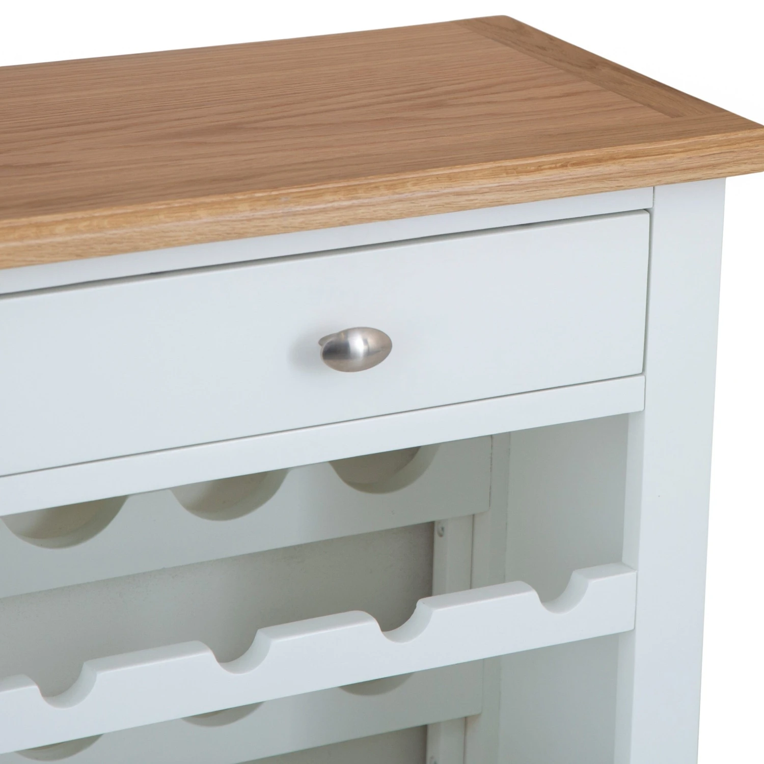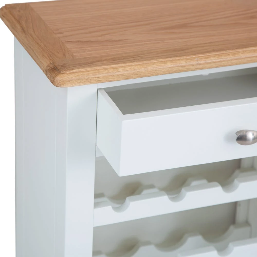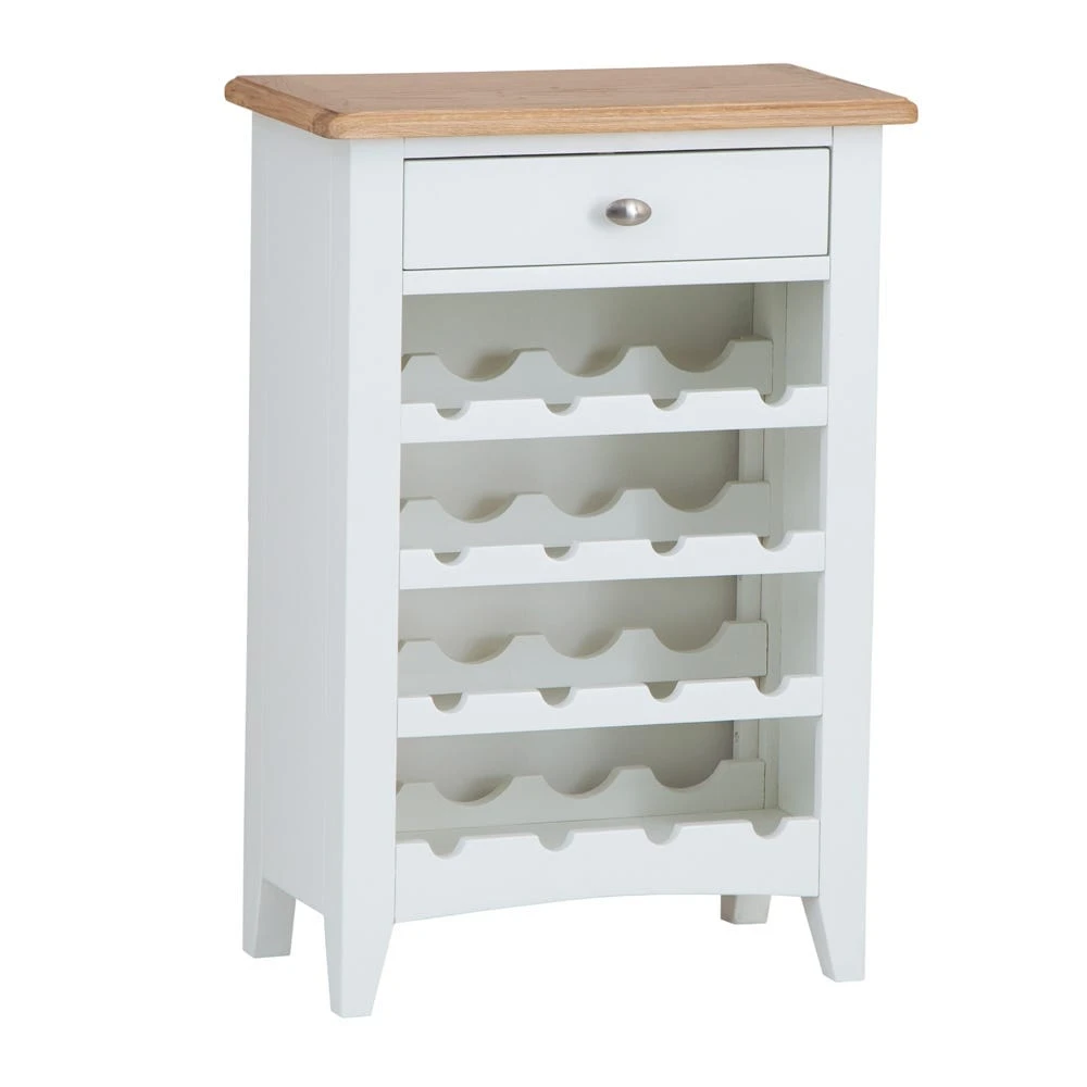 Turn your wine collection into a talking point with this elegant Gloucester white painted wine cabinet. Its pine frame is painted in our signature pure white, which contrasts with the oh-so classy natural oak top to enhance your dining, kitchen or living space. Sturdy shelves keep your very best bottles stored in a horizontal fashion, just like any true connoisseur.