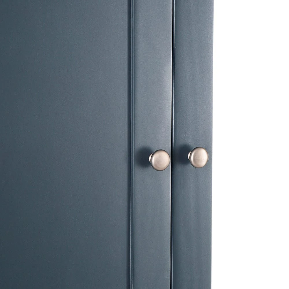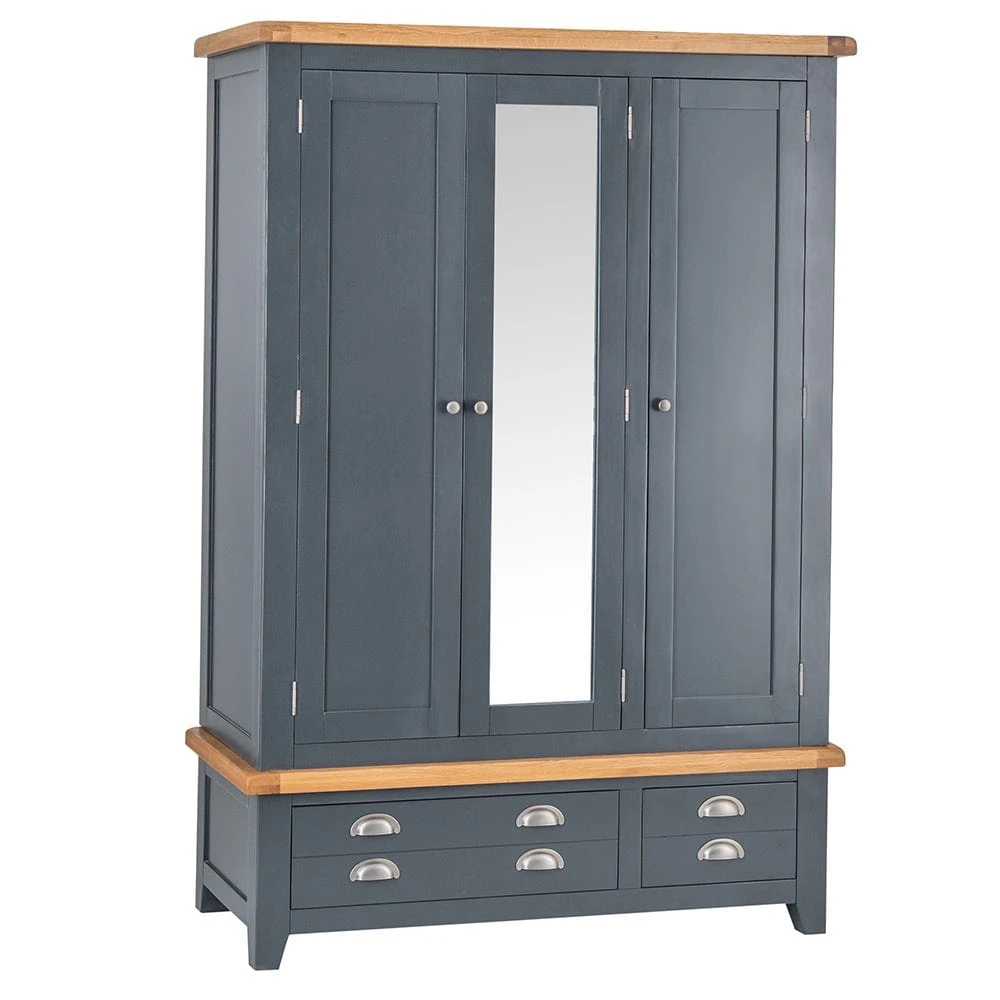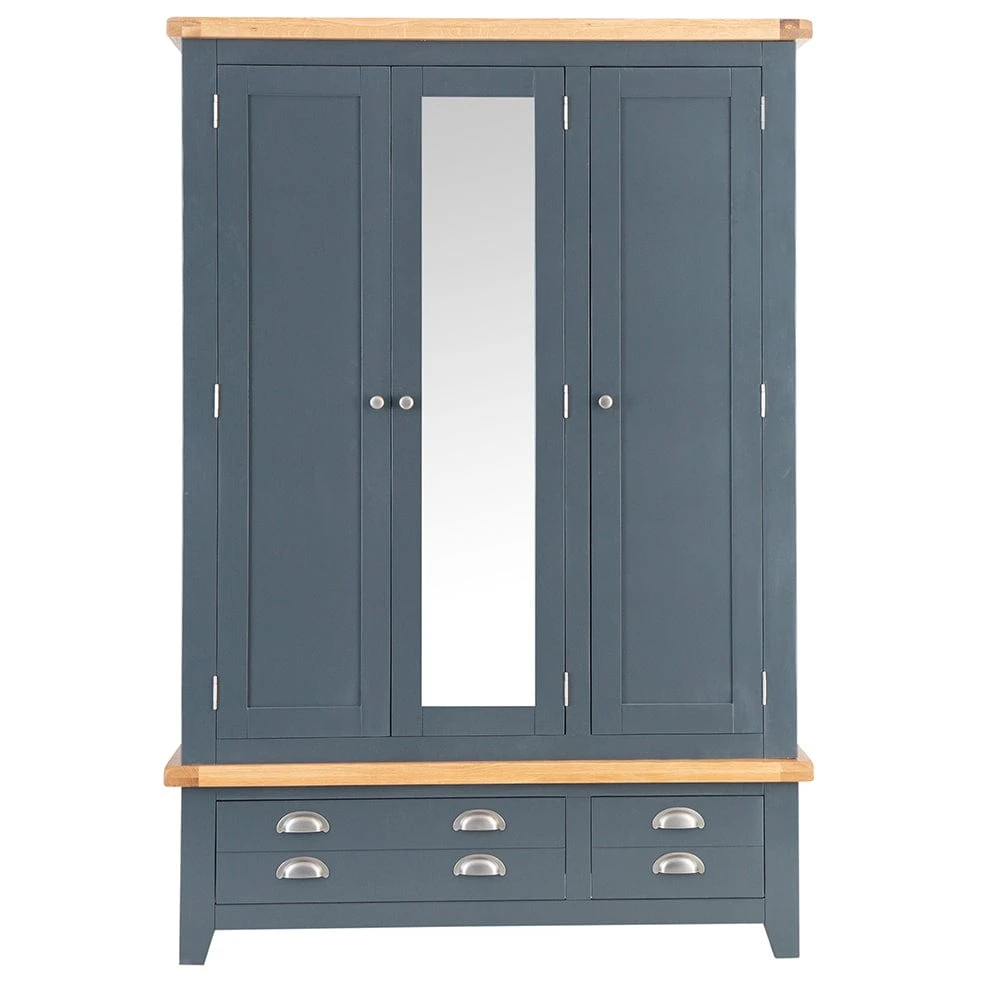 This Hampshire blue painted oak 3-door wardrobe with mirror has 136cm of hanging height for all your favourite frocks and sleekest suits. The two deep drawers at the base are ideal for belts and scarves, or for those essential getting-dressed gadgets like lint rollers, brushes and shoe horns.