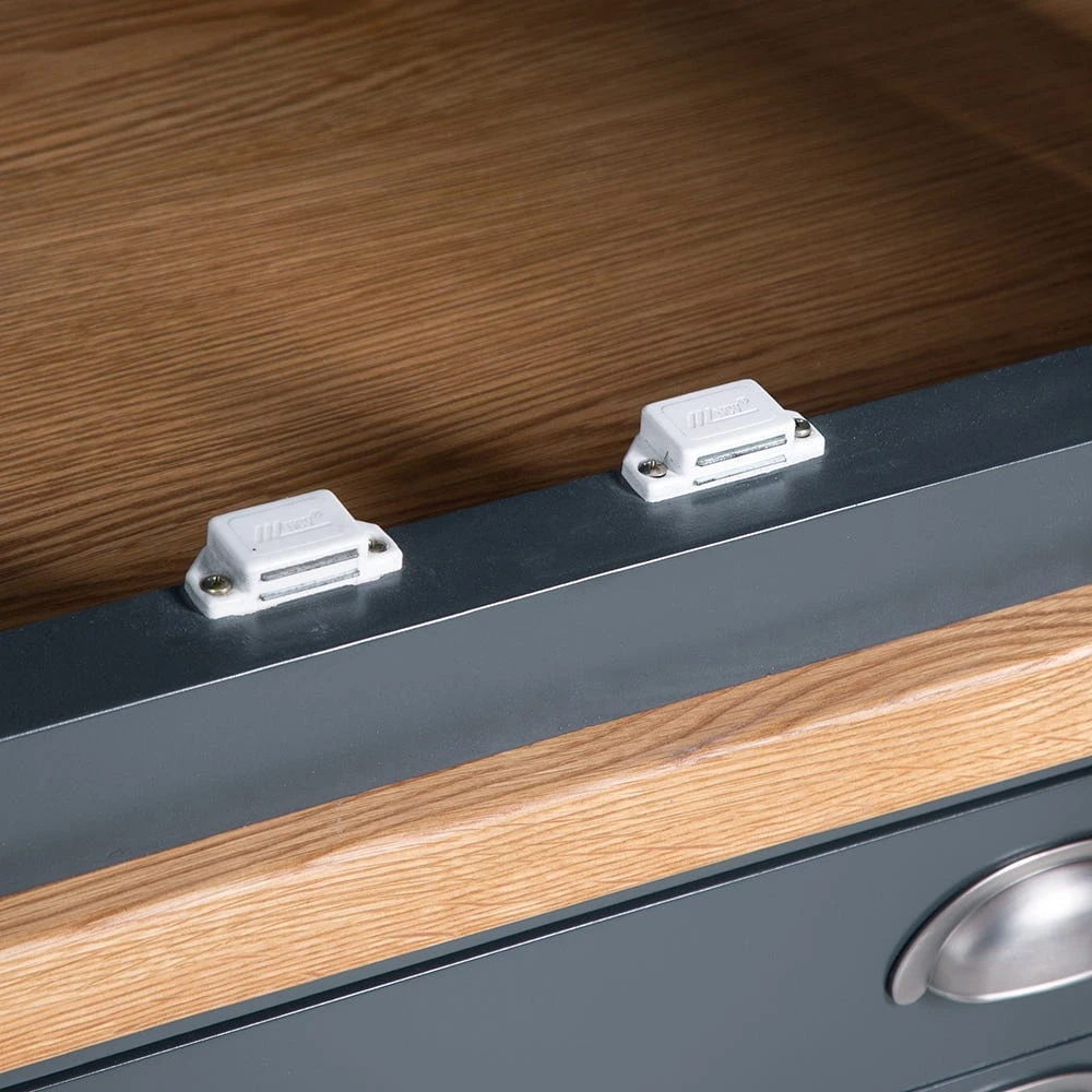 It’s a bit of a looker too, painted in our warm navy, which is complemented by the oak top, hanging rail and trim. It features panelling inside and out, plus false double drawer fronts with chrome cup handles. The tall central mirror lets you admire your OOTD (that’s outfit of the day) in all its glory.