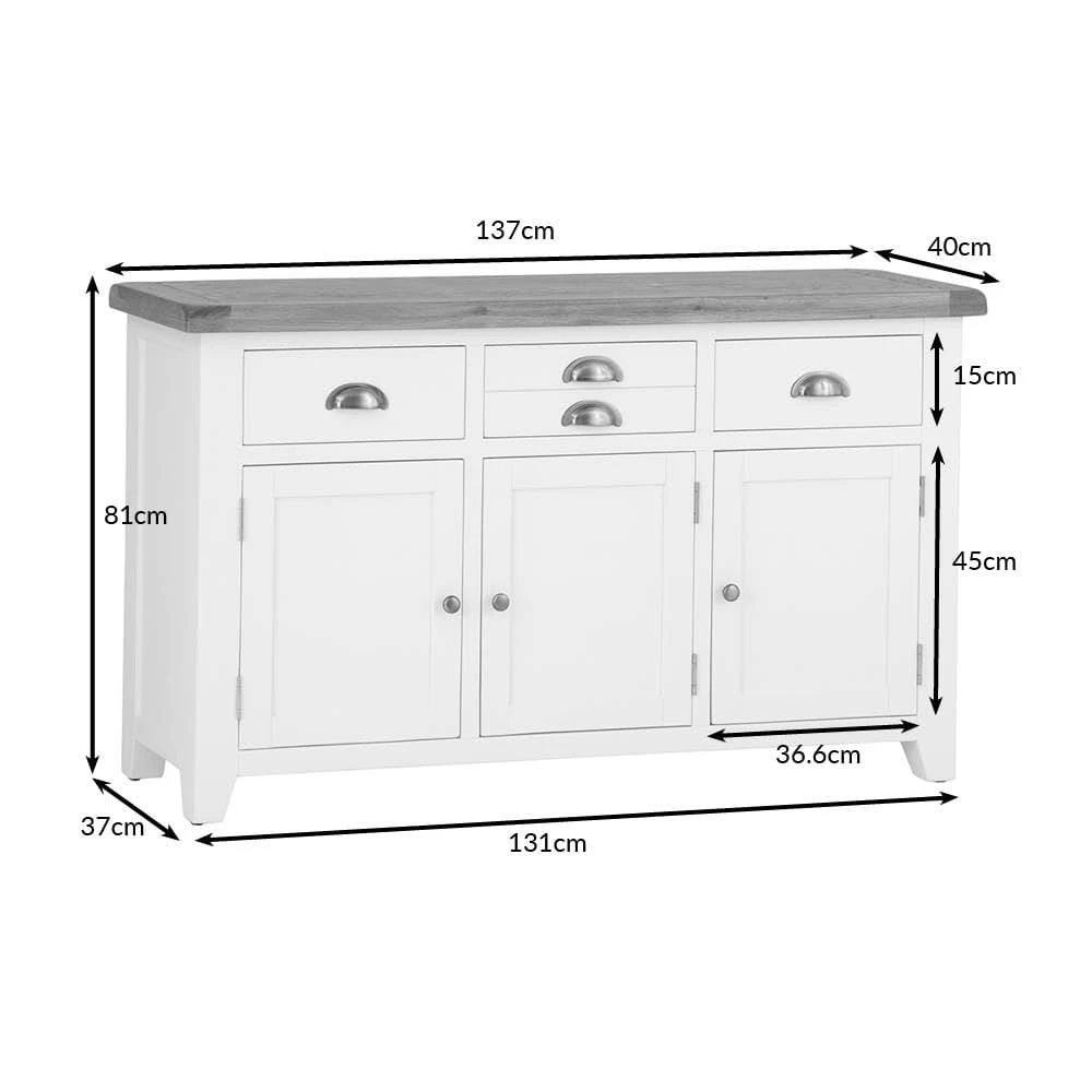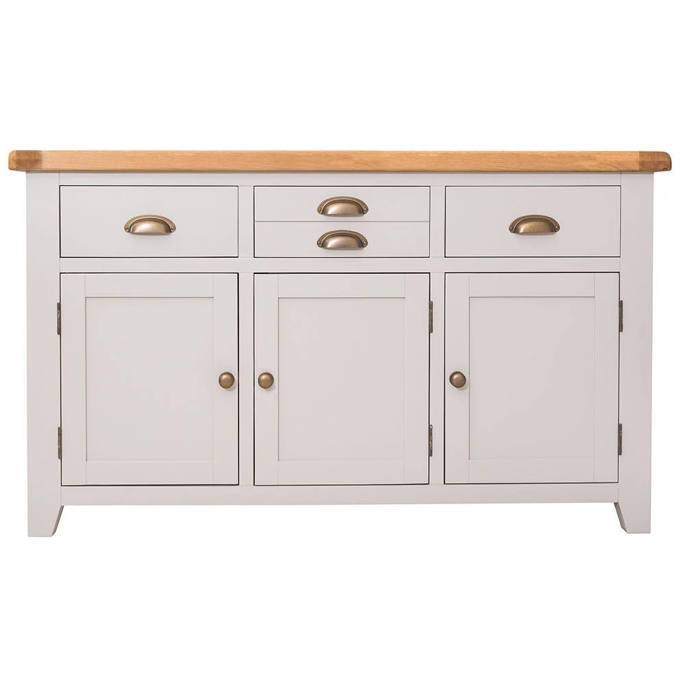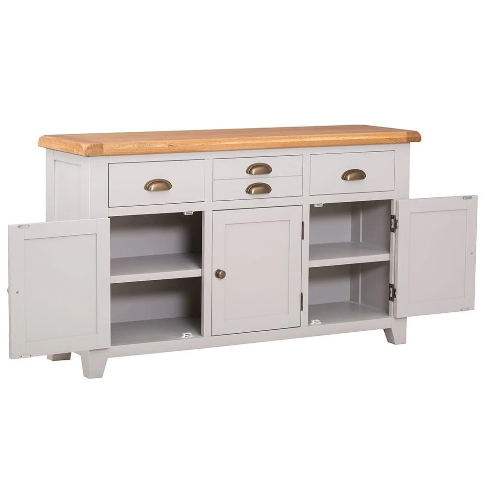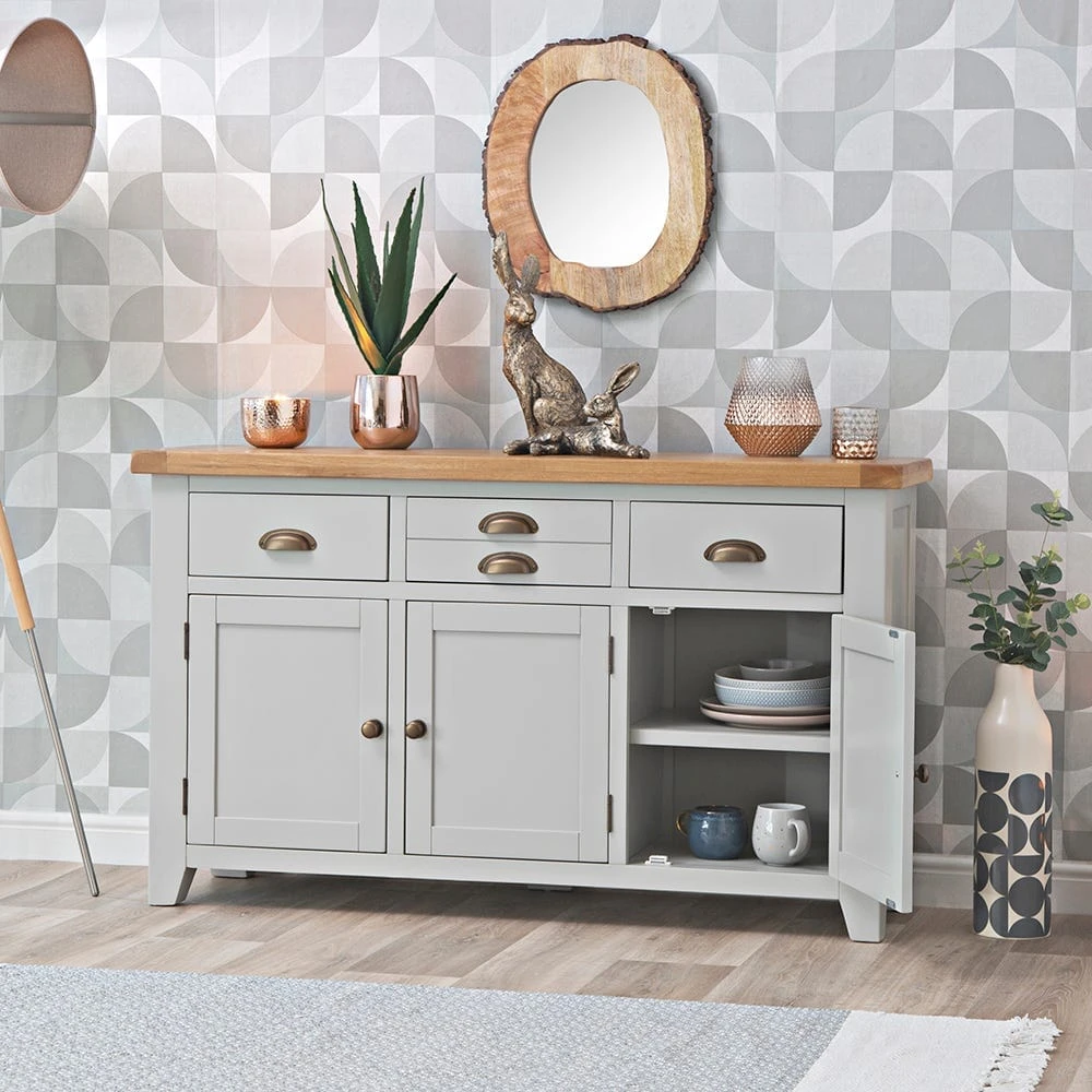 This Hampshire grey painted oak 3-door large sideboard is the ideal addition to your kitchen, dining room or living space. The cupboards have ample space for spare crockery and tableware, and the roomy drawers can hold serving utensils, table linen and cutlery. Alternatively, use it as a family unit for kids’ toys, games and crafting materials.