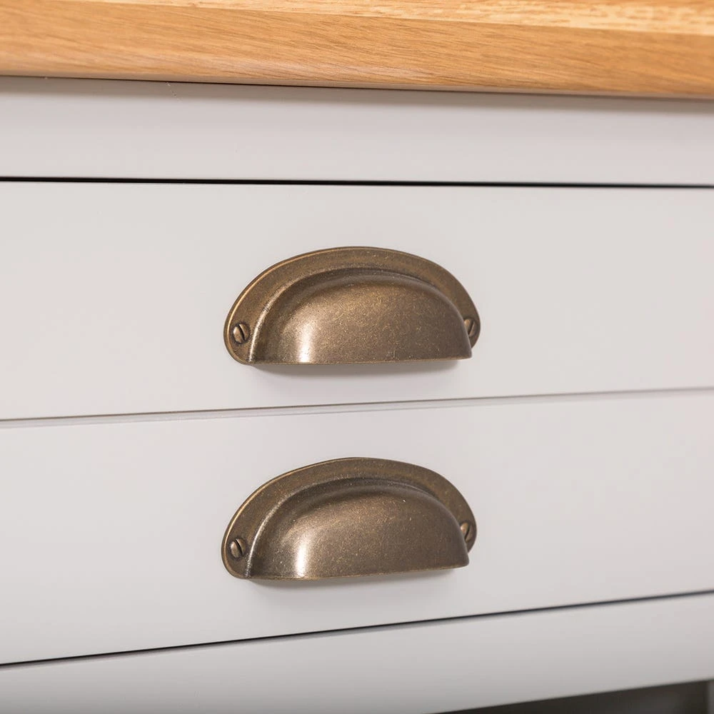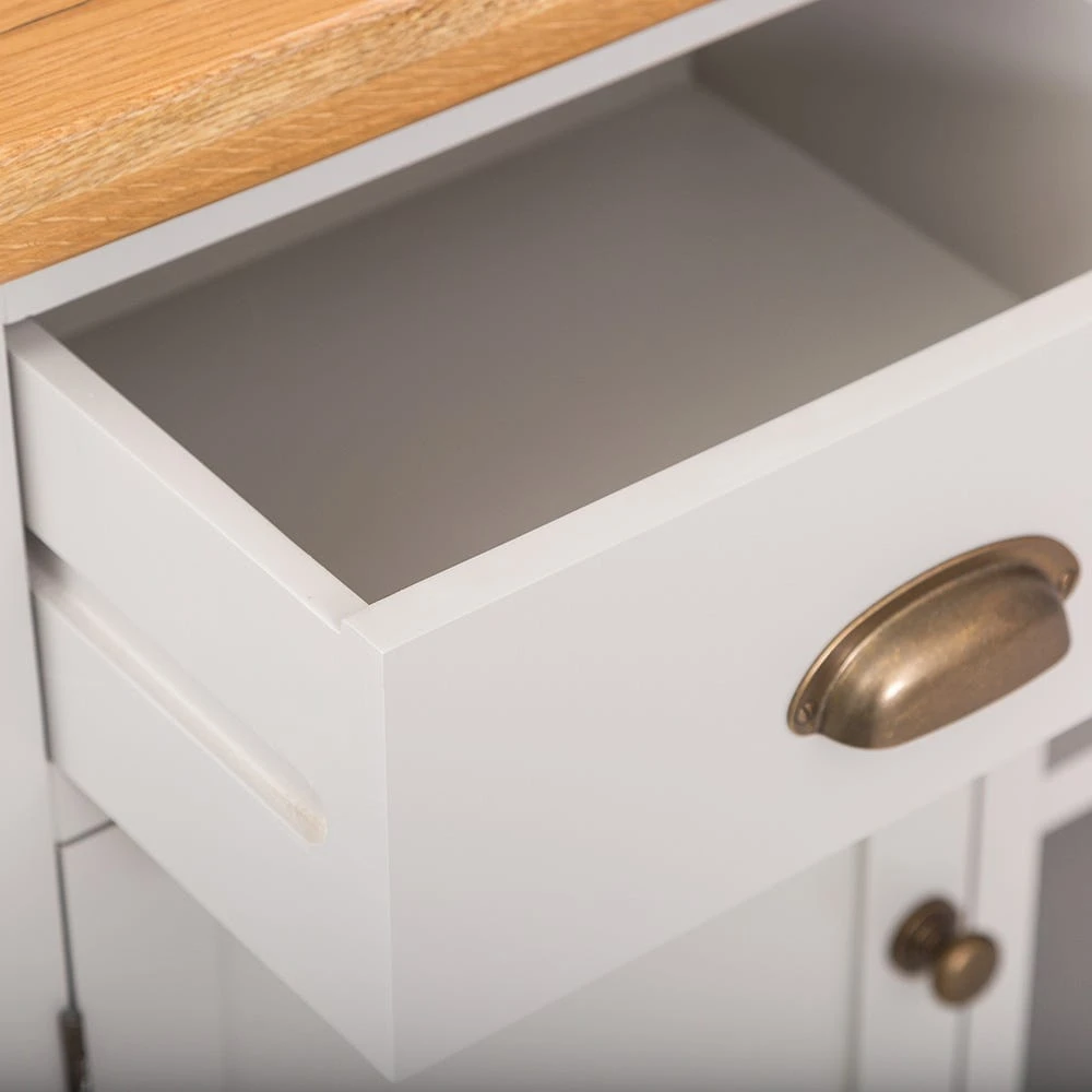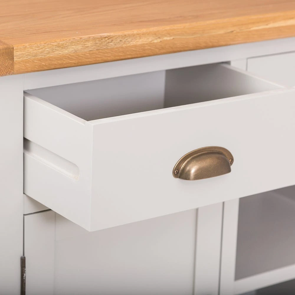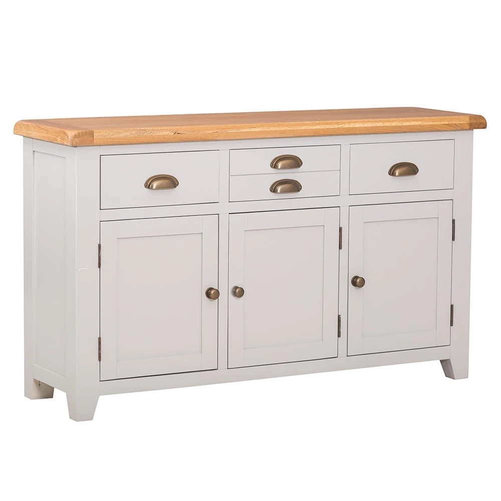 Our timeless grey finish enhances any style of space, and the natural oak top adds a traditional feel. Tapered legs and stylish brass-effect cup handles complete the look. Dress this sideboard with framed prints, ornaments and floral displays to turn it into the focal point of any room.