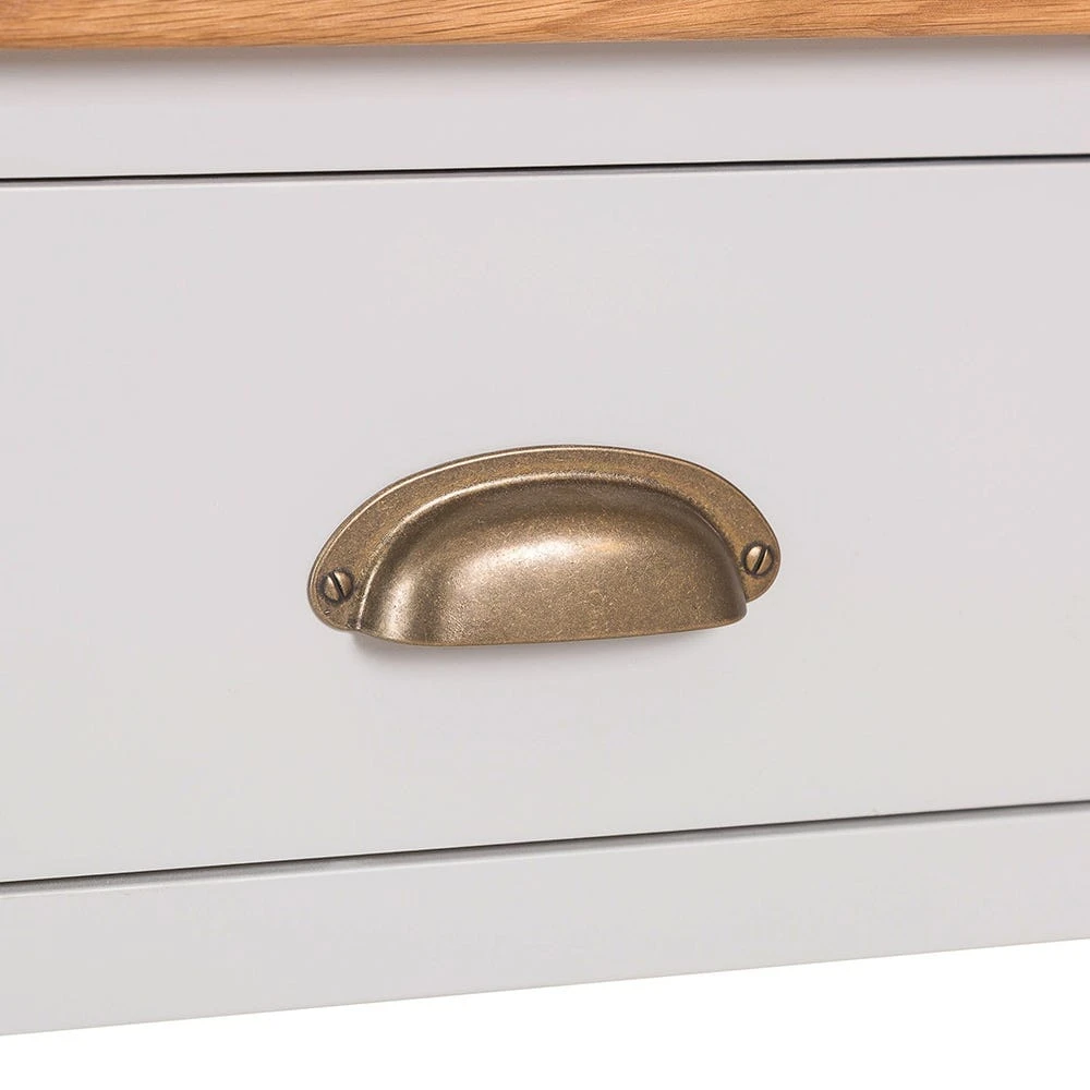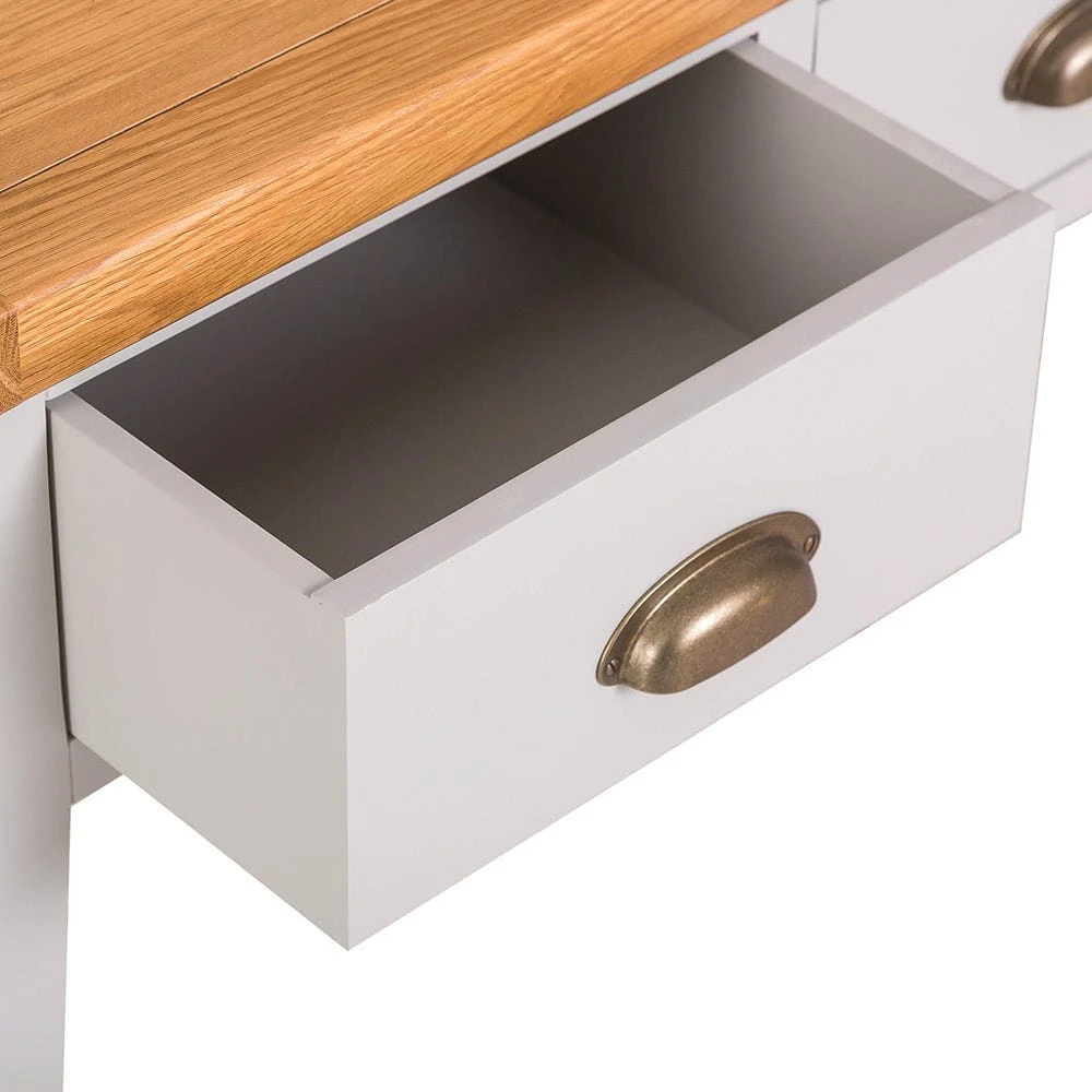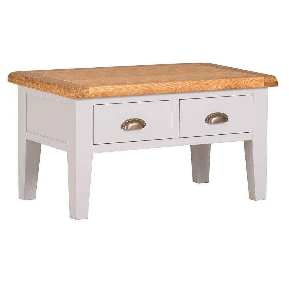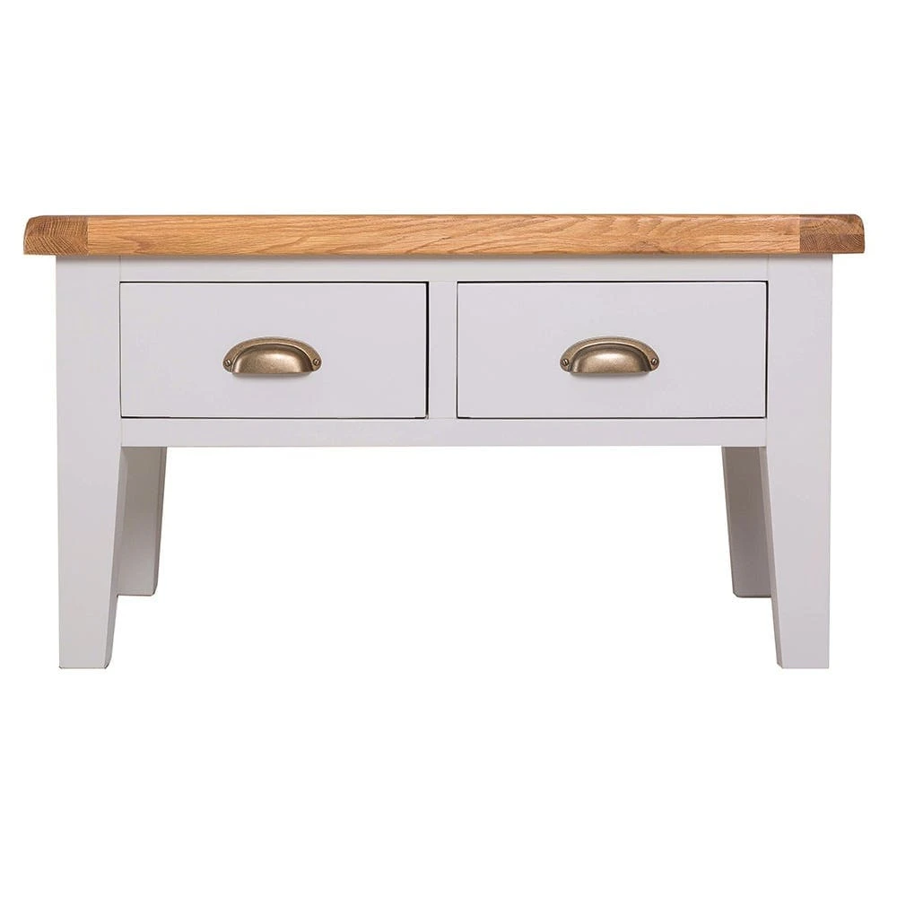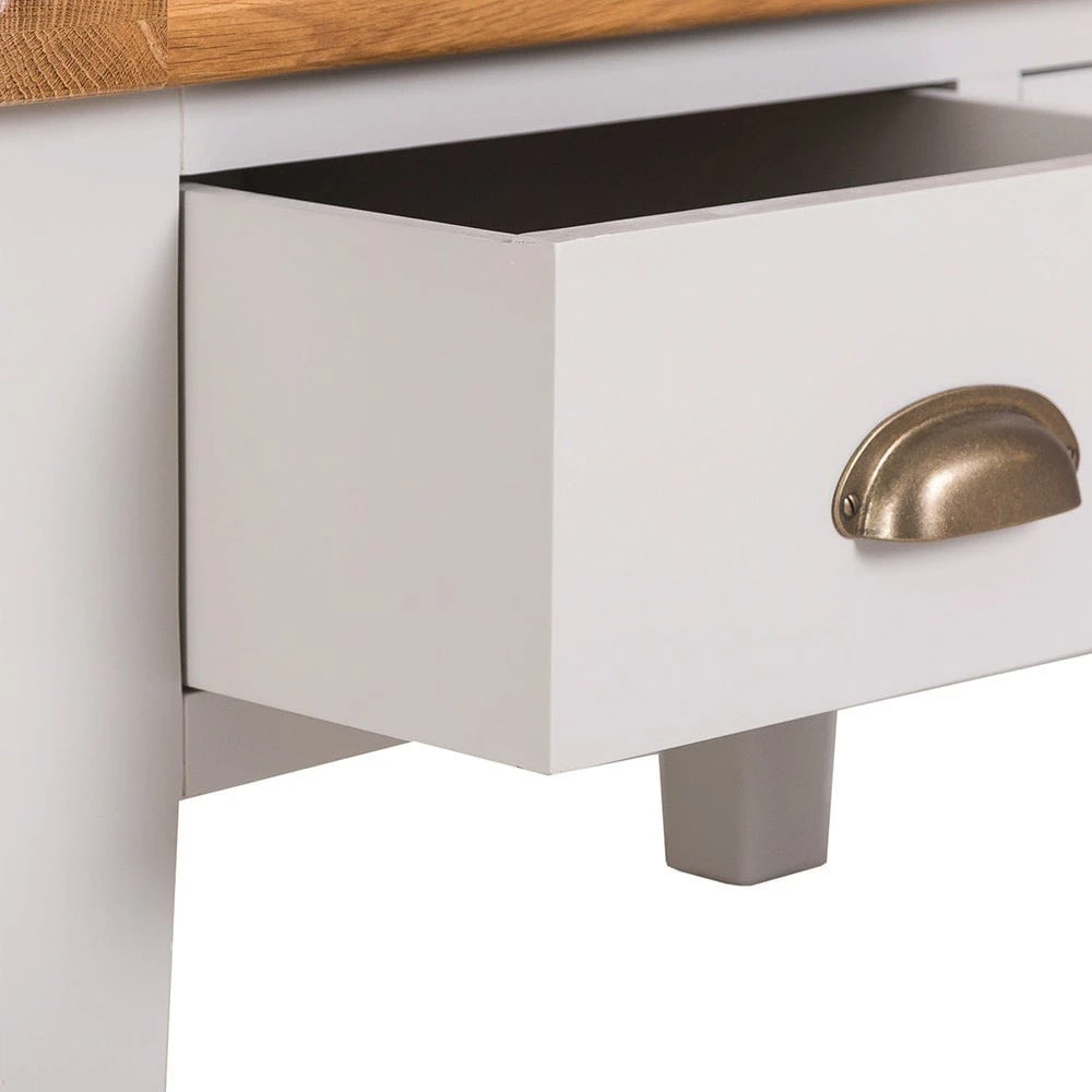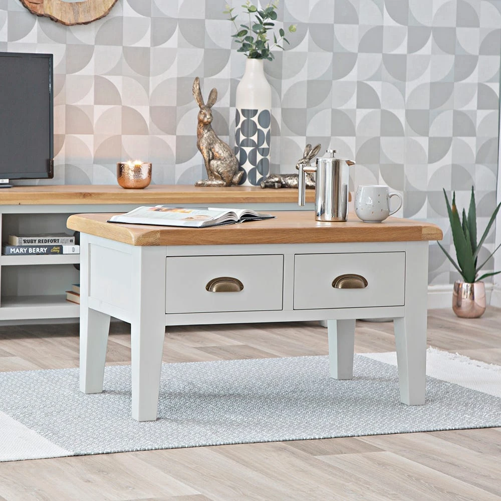Time for a brew? Put your feet up and take a well-earned break with our stylish Hampshire grey painted oak coffee table with drawers. The understated grey finish enhances any space, and the traditional oak top is poised and ready for your hot drink (and a biscuit or two). Stow gadgets and games in the drawer, or use it for that last-minute tidy-up whenever unexpected guests arrive.