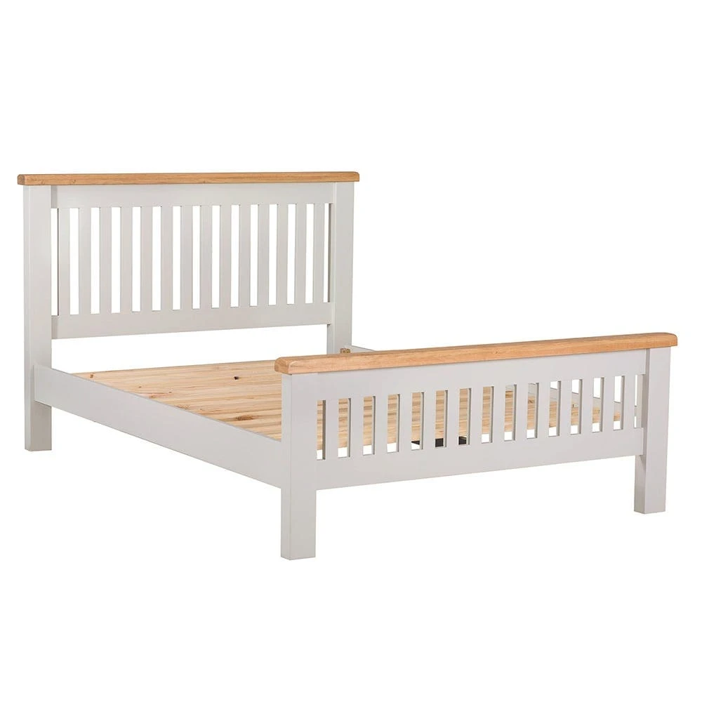 This generous Hampshire painted oak king-size bed frame will keep you cosy and comfortable all night long. Our neutral grey shade works perfectly with fresh white bed linen – or add patterned cushions and printed throws to make it your own.