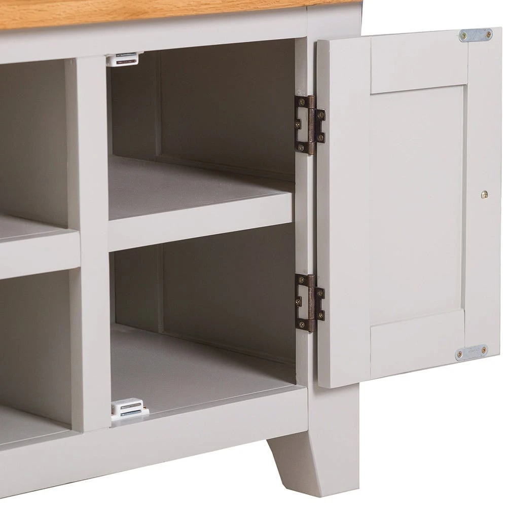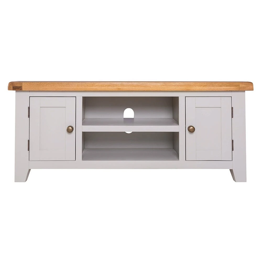 Our natural oak top offers a warm contrast to the light grey paintwork, which is sure to breathe life into your living room. The fixed shelves are ideal for DVD and Blu-ray players, and the pair of holes at the back keeps your cables out of sight. Two spacious cupboards feature eye-catching brass-effect doorknobs.