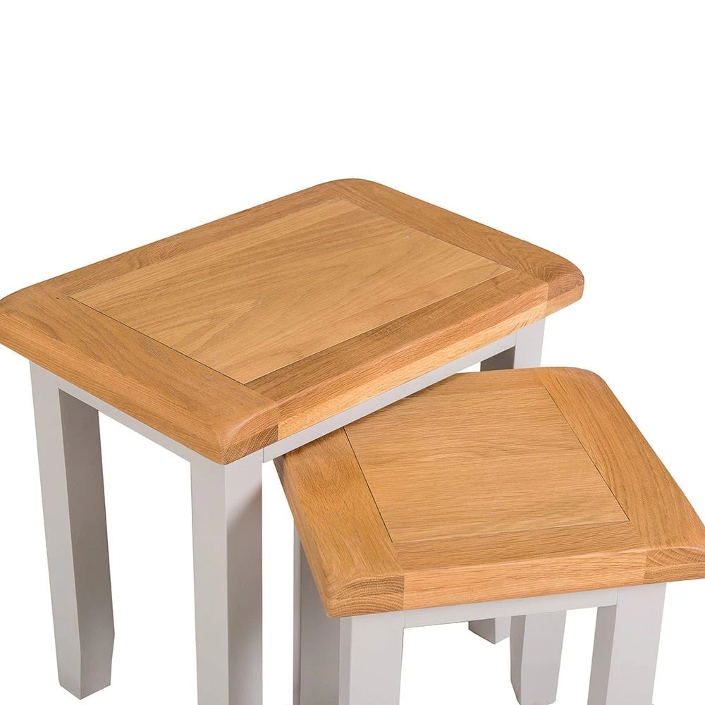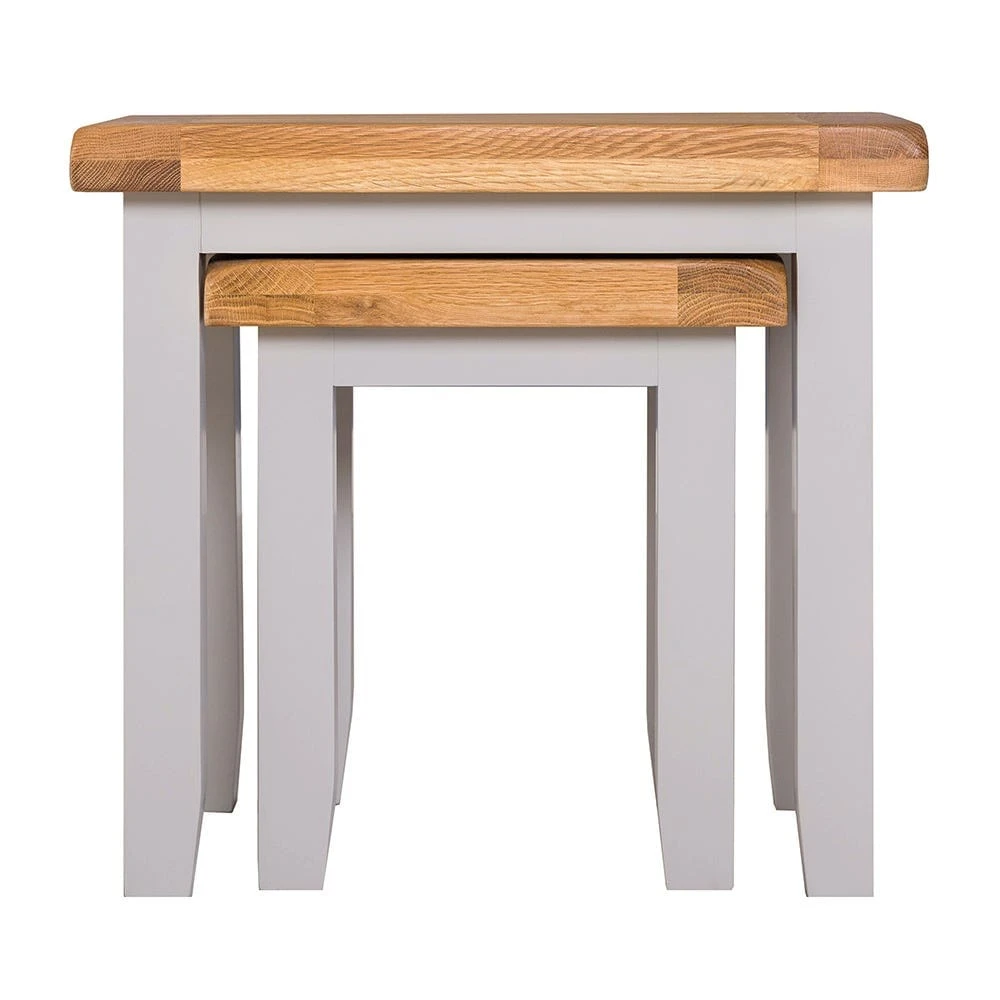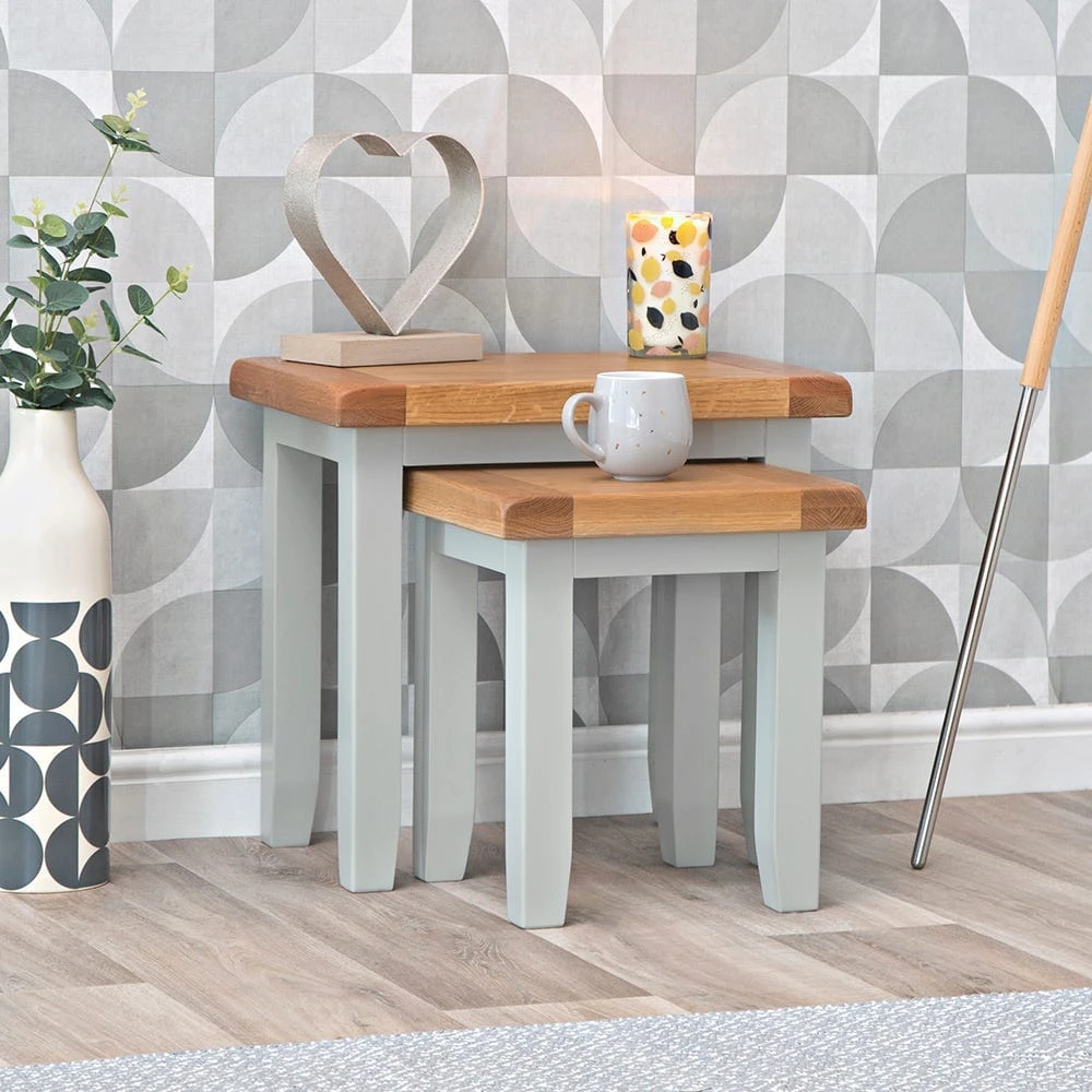 This Hampshire grey painted oak nest of 2 tables makes the perfect double act. Each one is finished in our elegant pale grey, with the natural oak top adding a traditional farmhouse-style touch. Split them up whenever you’re hosting guests to keep drinks and snacks within easy reach of sofas and armchairs. The smaller table slots neatly beneath the larger one, so you can reclaim your floorspace when they’re no longer needed.