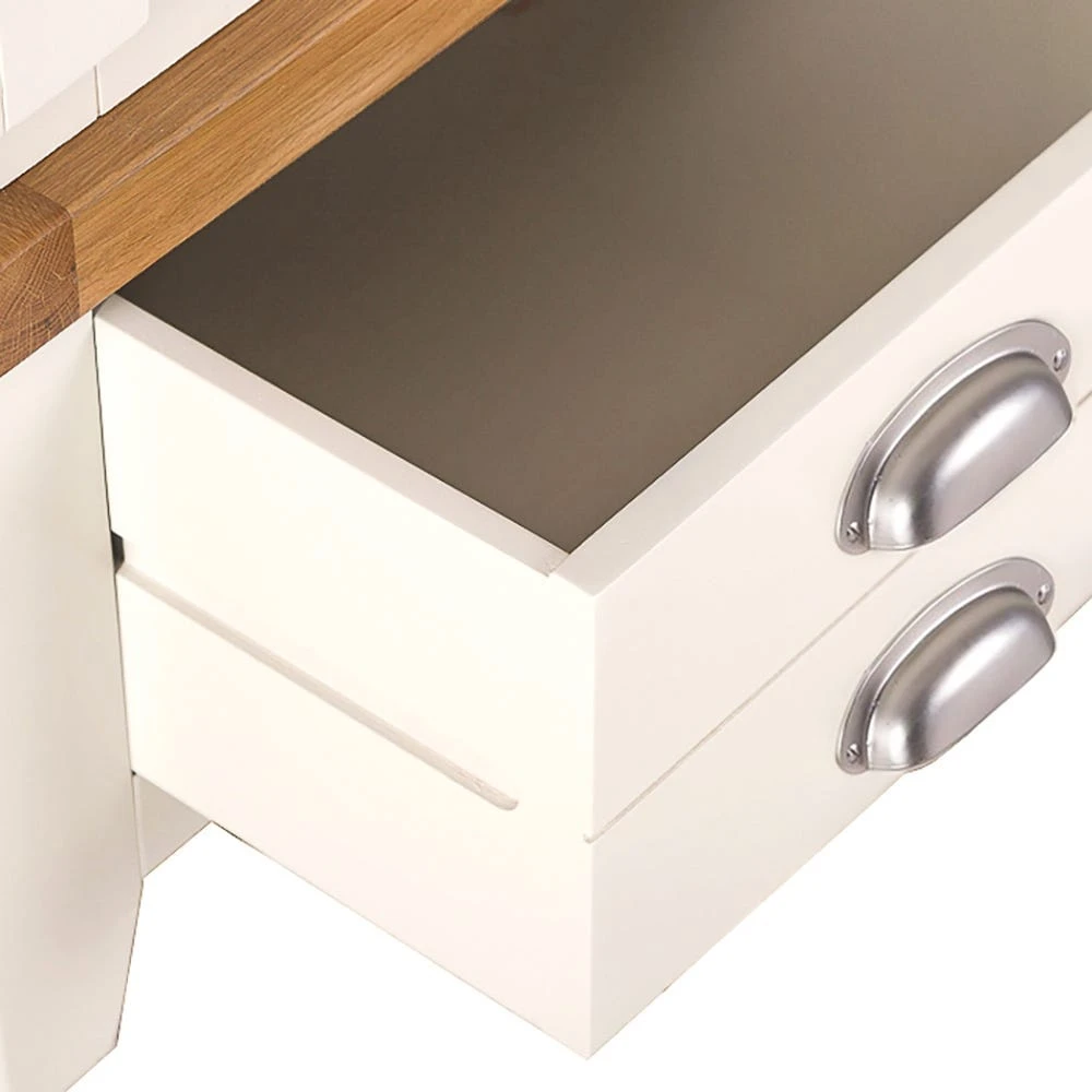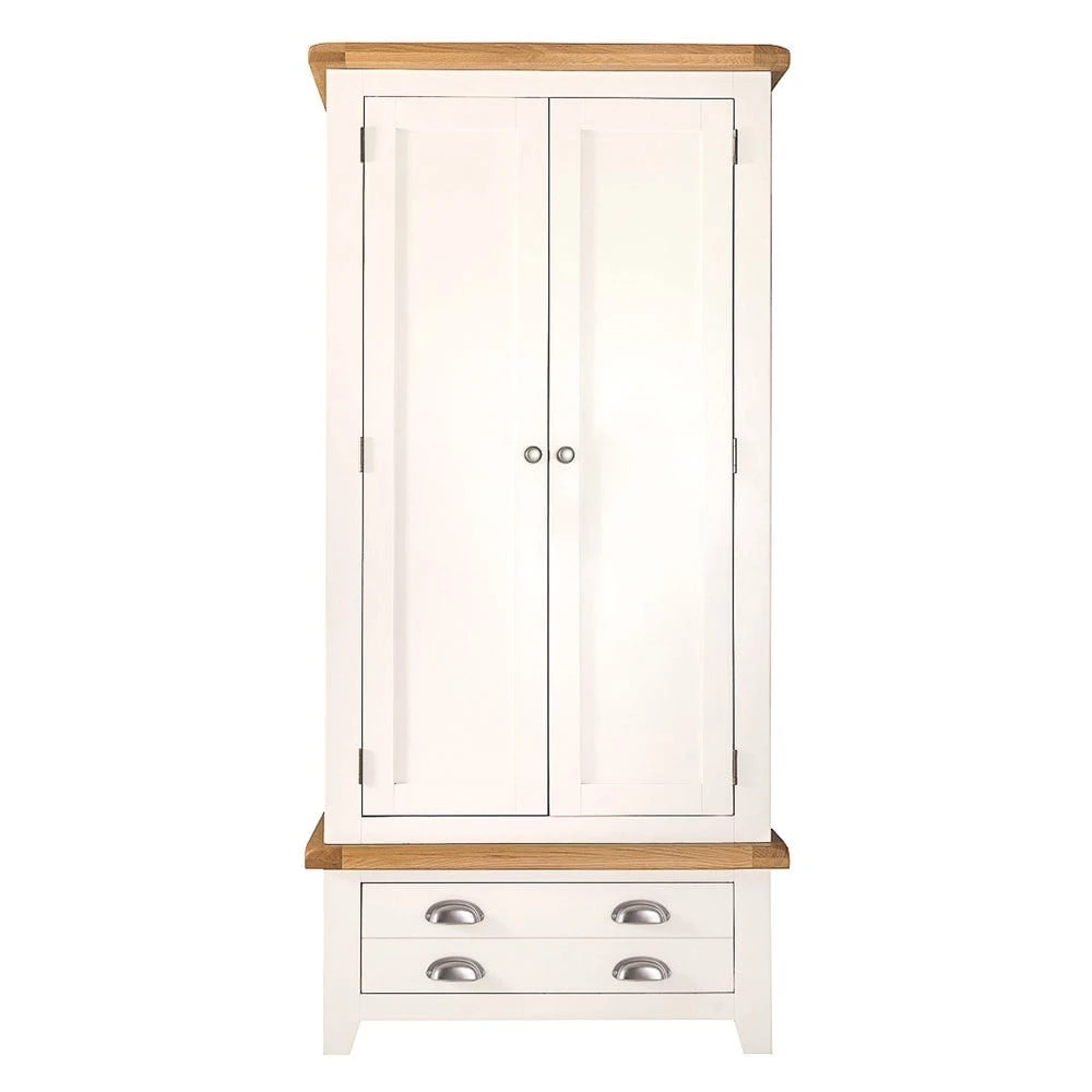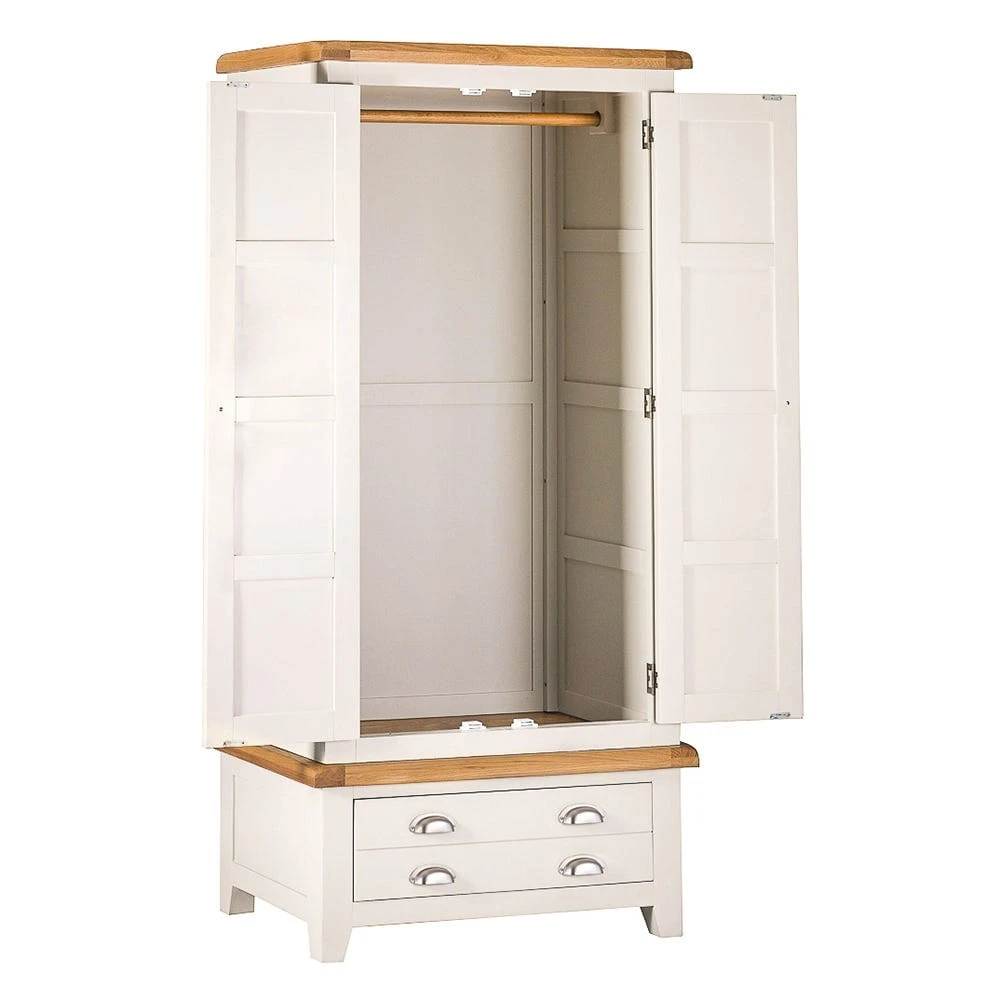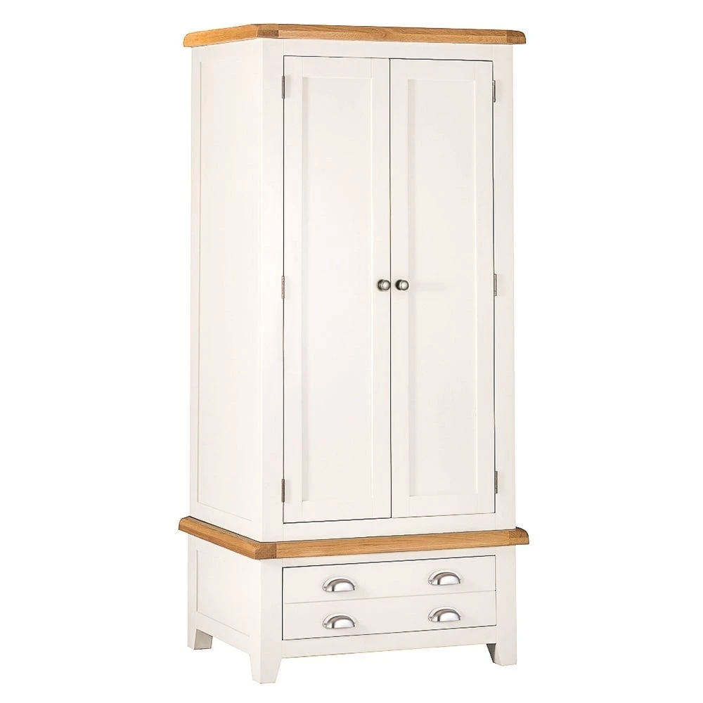 Hello, handsome! This Hampshire ivory painted oak 2-door wardrobe with drawer features plenty of elegant touches, including panelled doors, exposed hinges and chrome cup handles. The warm ivory finish, complemented by the oak top, hanging rail and trim, turns the act of getting dressed into a luxury boutique experience.