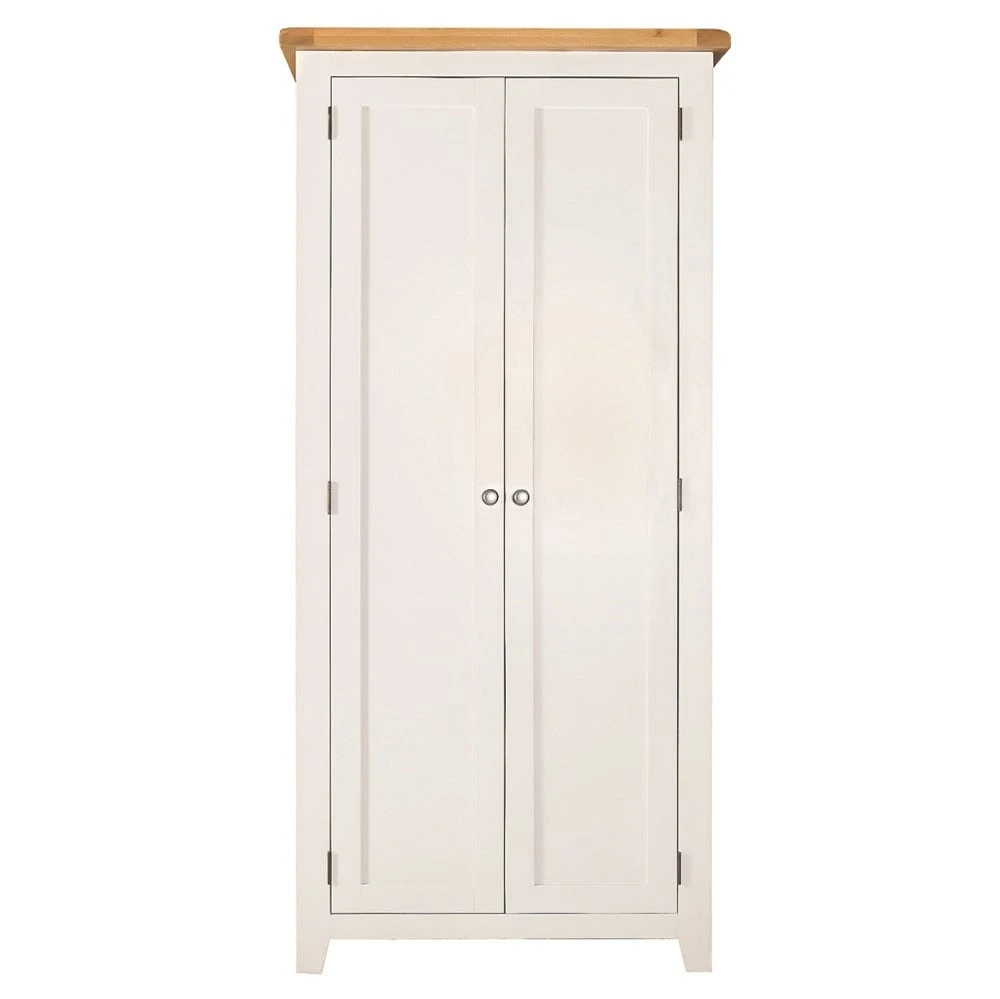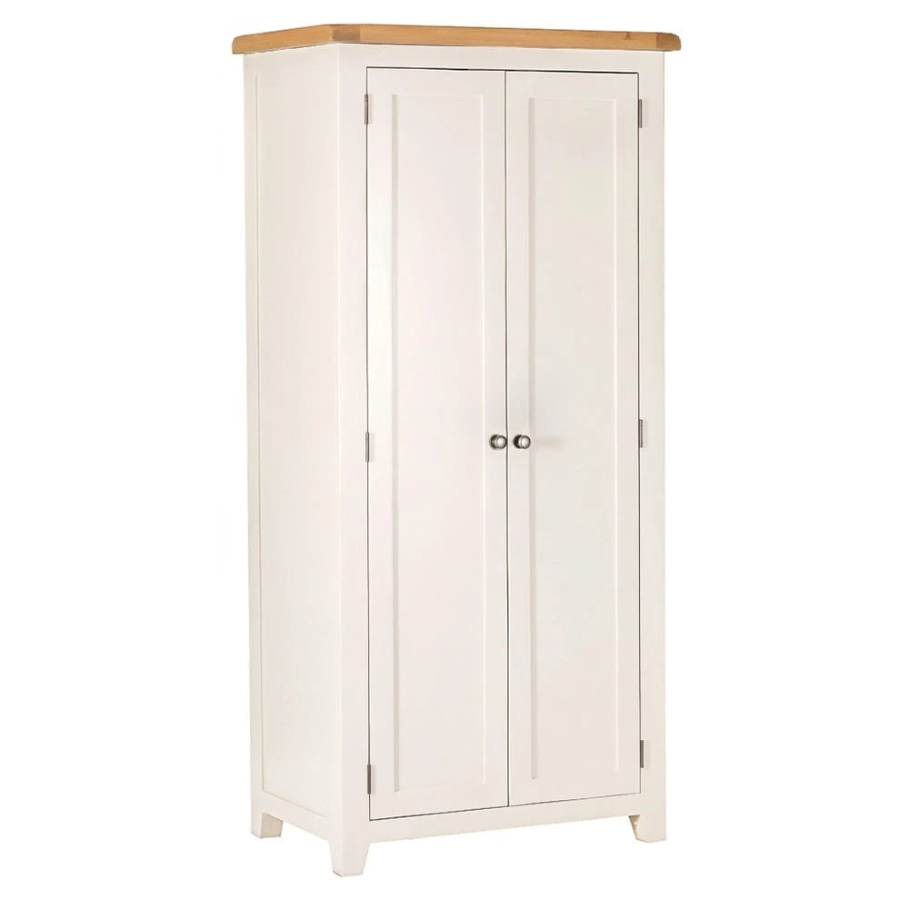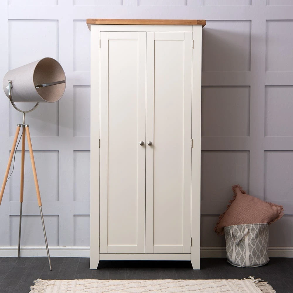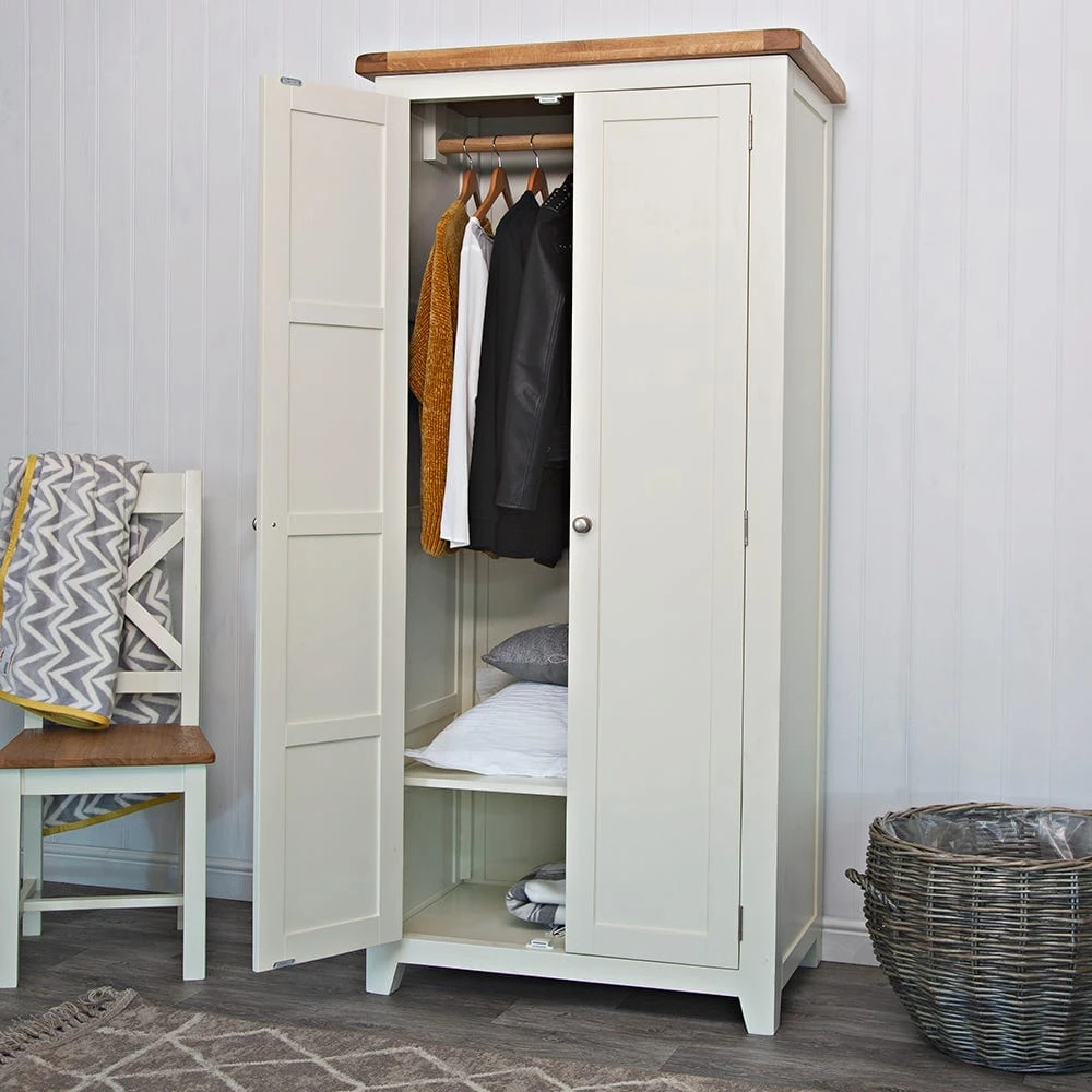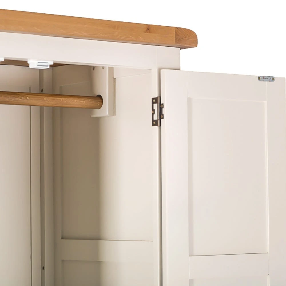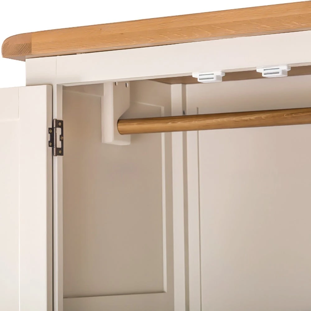 This spacious Hampshire ivory painted oak double wardrobe features a removable lower shelf for keeping shoes and slippers stowed tidily away – or to provide extra space for your clothes. Hang your finest frocks and most stylish suits from the wooden rail: at 190cm tall, this wardrobe lets even floor-length items hang free.