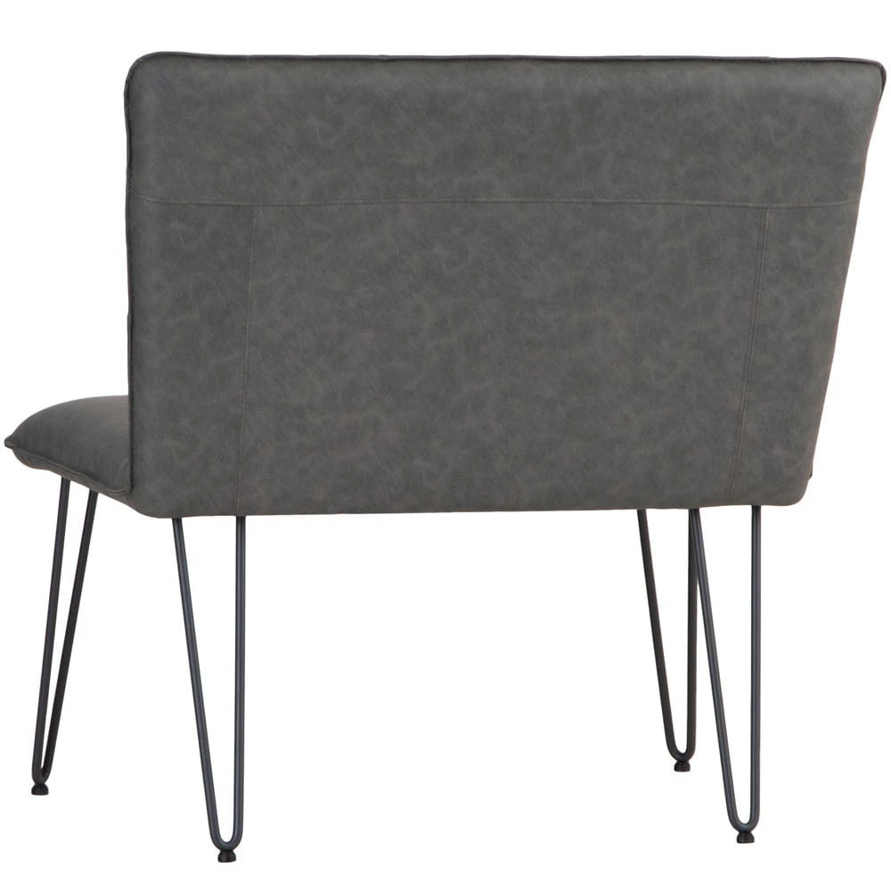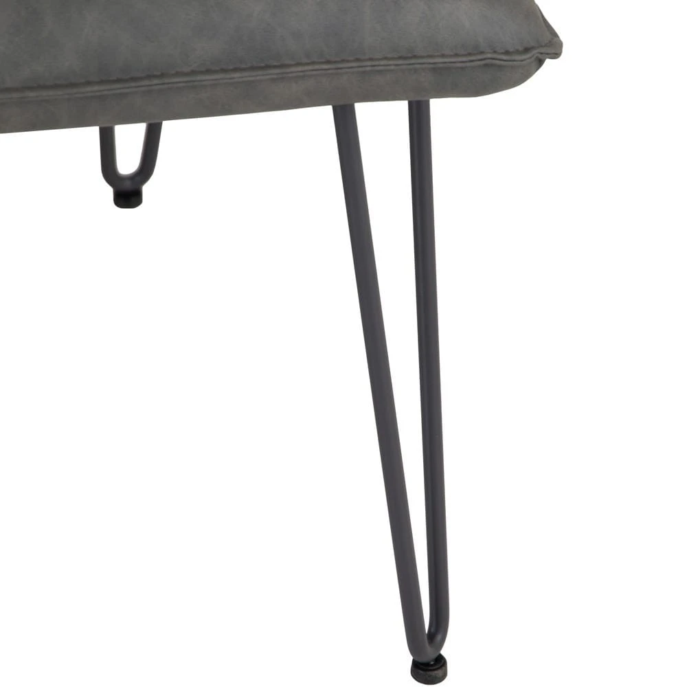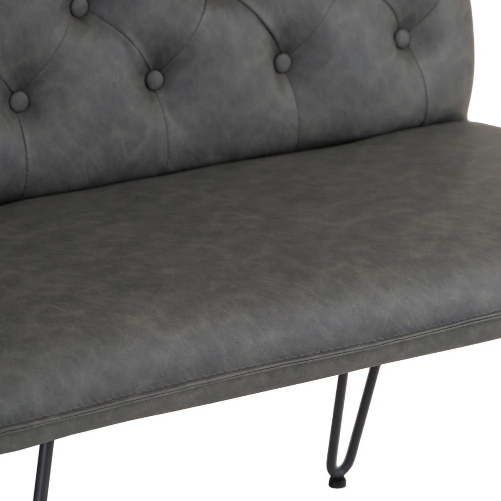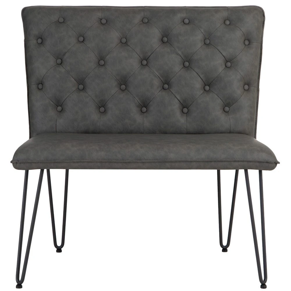 This bench is upholstered in our leather-soft grey fabric, which is both comfortable and high-quality. The black metal pin legs add contrasting style and have discreet floor protectors for extra stability. Diamond-shaped stitching and covered studs on the seat back lend traditional finesse to this modern piece.