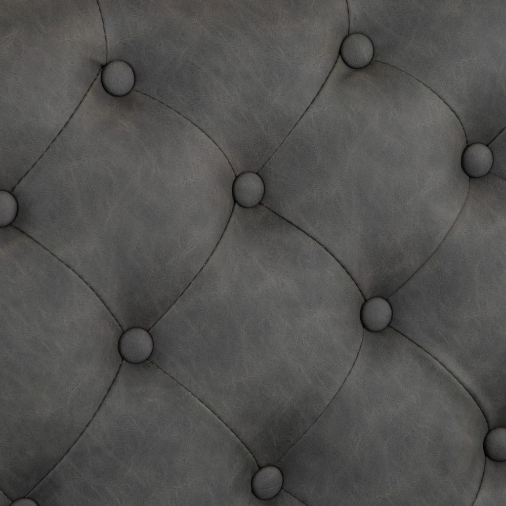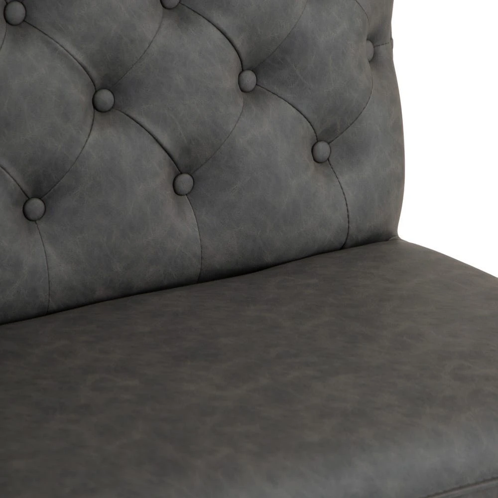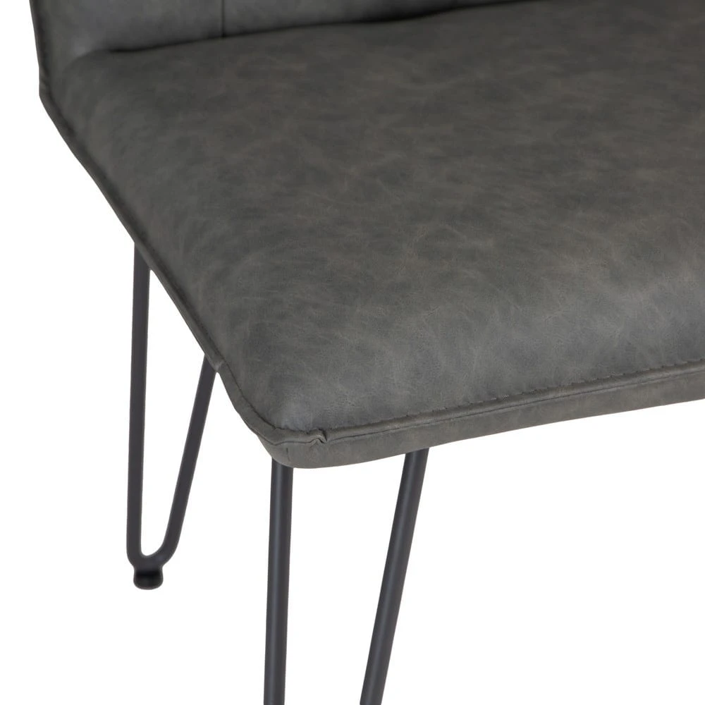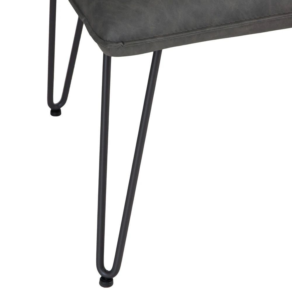 This bench is upholstered in our leather-soft grey fabric, which is both comfortable and high-quality. The black metal pin legs add contrasting style and have discreet floor protectors for extra stability. Diamond-shaped stitching and covered studs on the seat back lend traditional finesse to this modern piece.