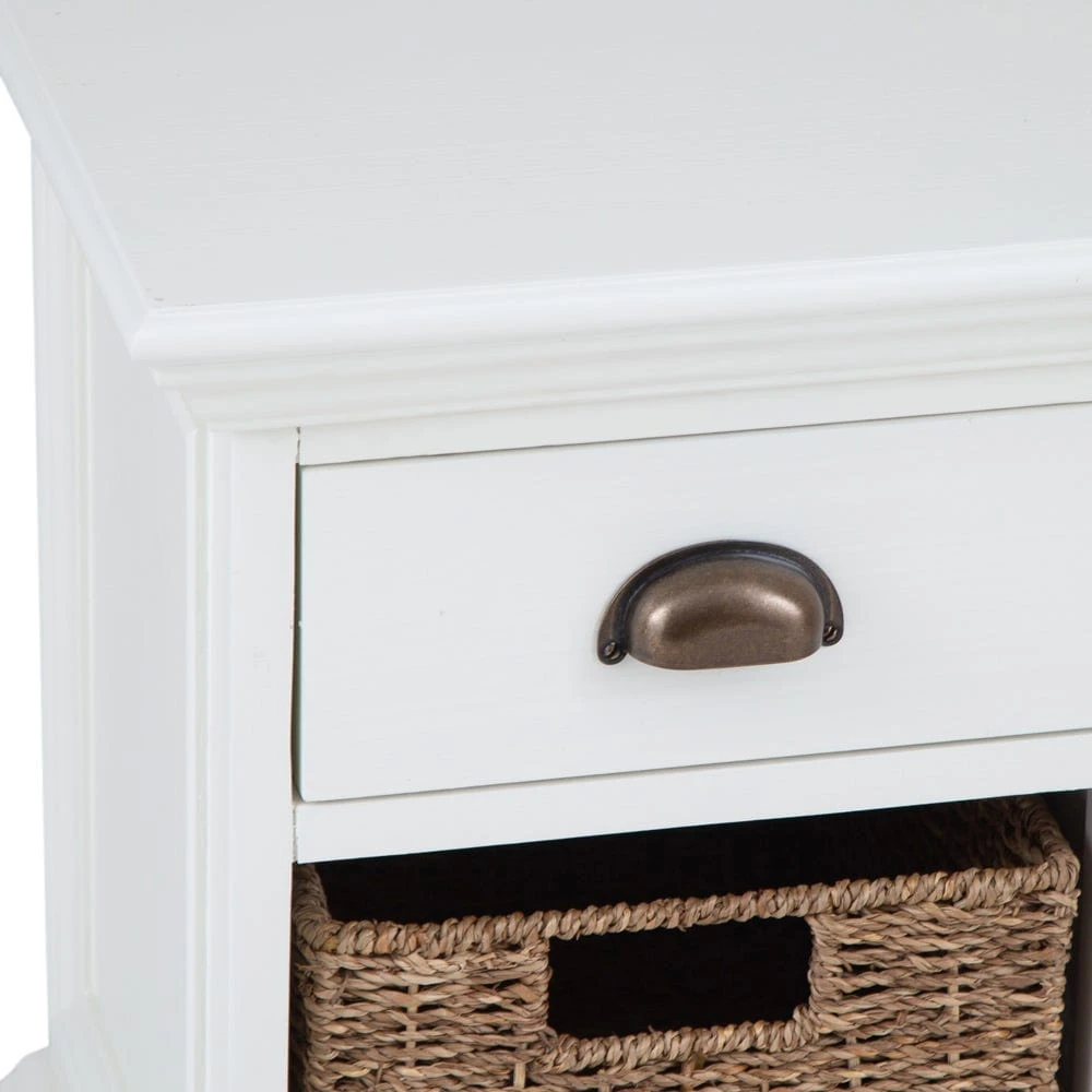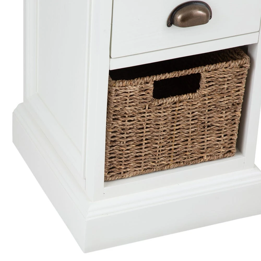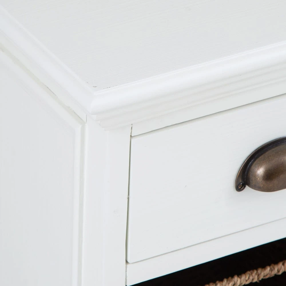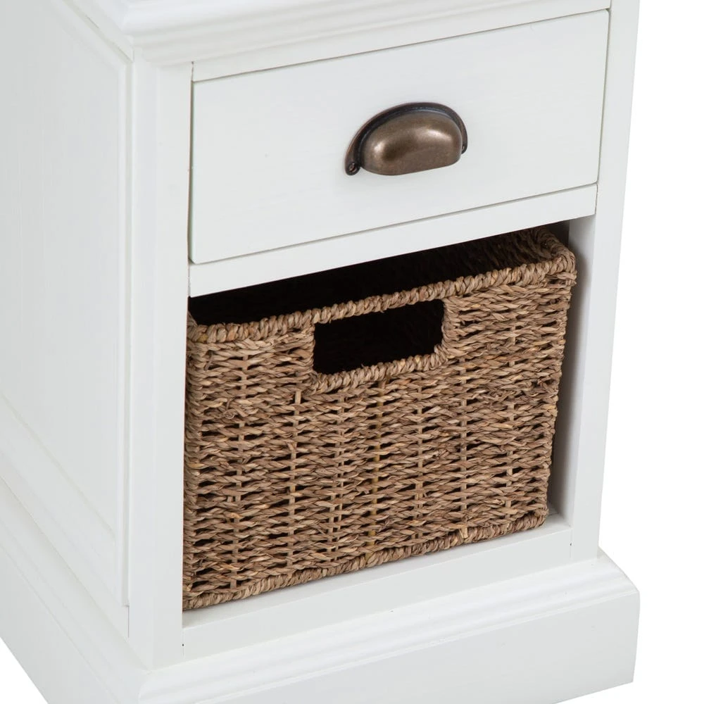 Our stylish Monaco white wicker 1-drawer 1-wicker basket unit is an elegant storage solution for any space. The antique white finish suits both modern and traditional styles of decor, and is offset by our bronze-effect cup handle and seagrass wicker basket. Portico detailing on the side panels and top add a classical flourish.