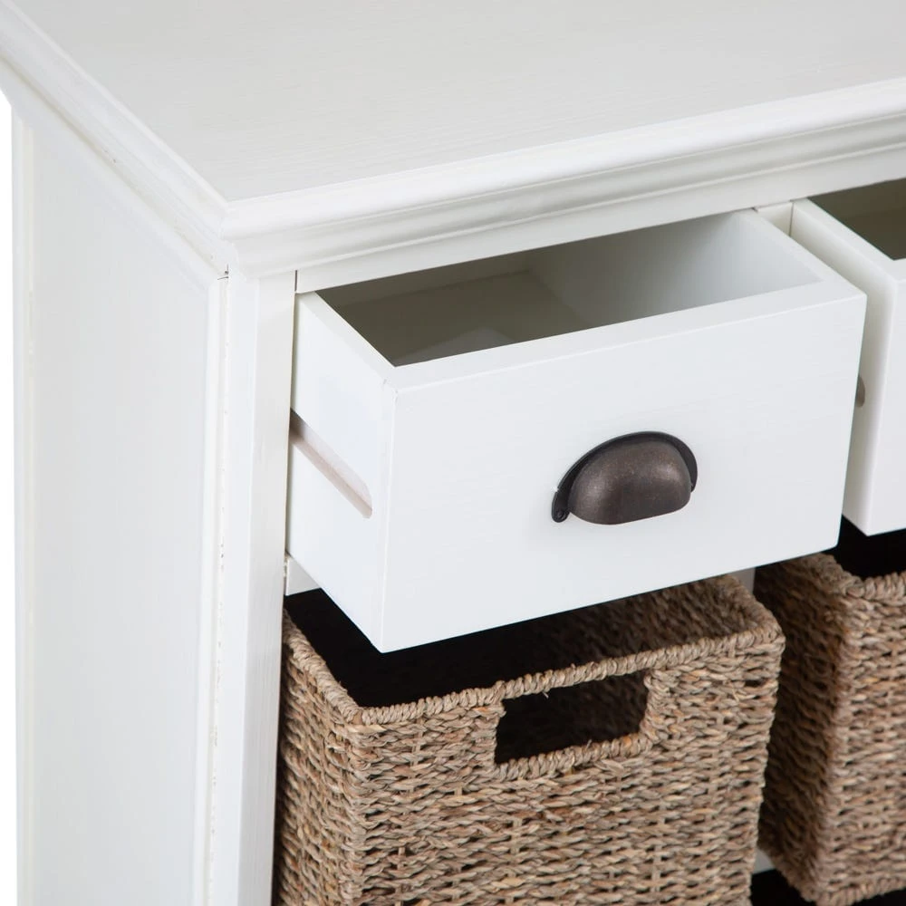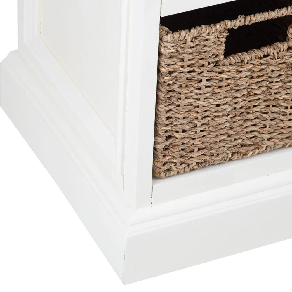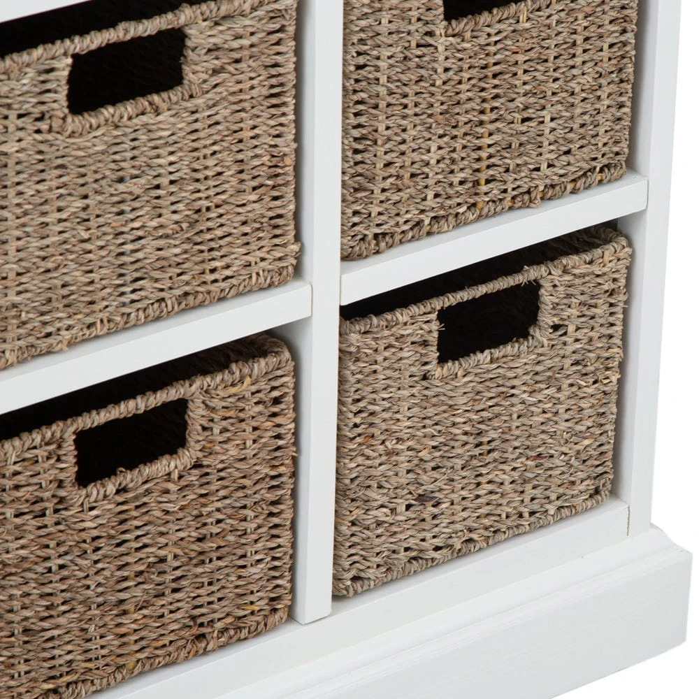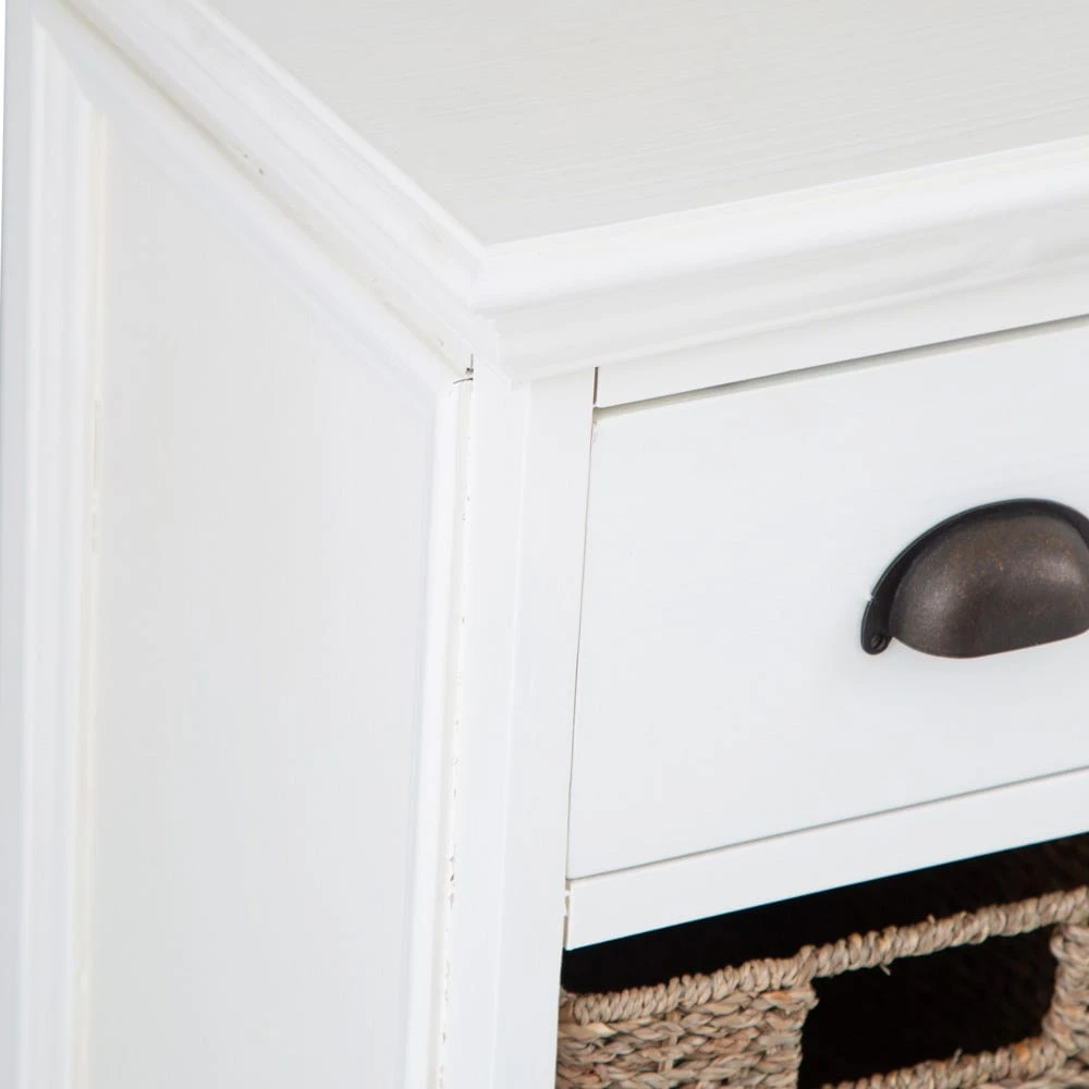 The seagrass wicker baskets add subtle texture to the formal framework, and can be removed for extra convenience. Our breezy antique white finish brings instant elegance to any space in your home. Vintage-looking bronze-effect cup handles complete the fine balance of complementary styles.