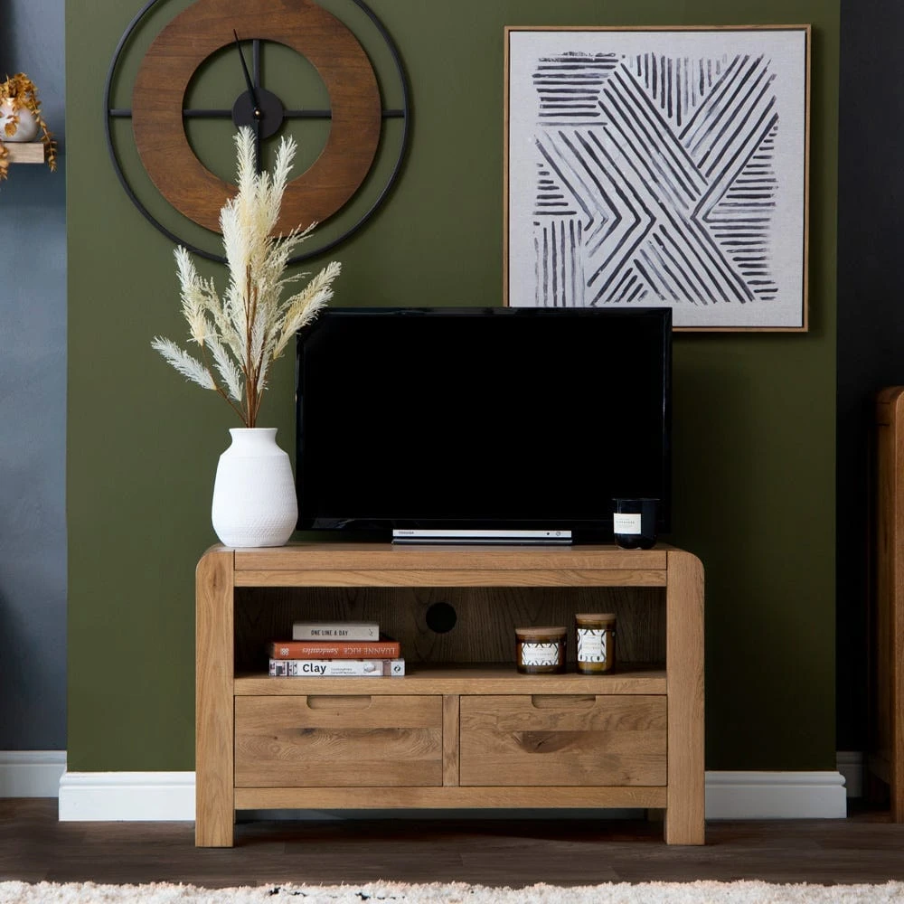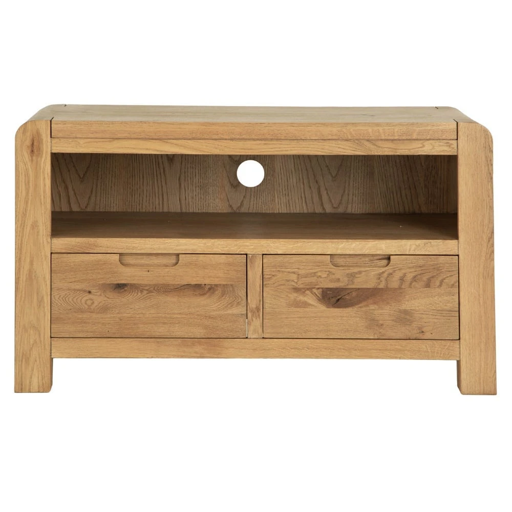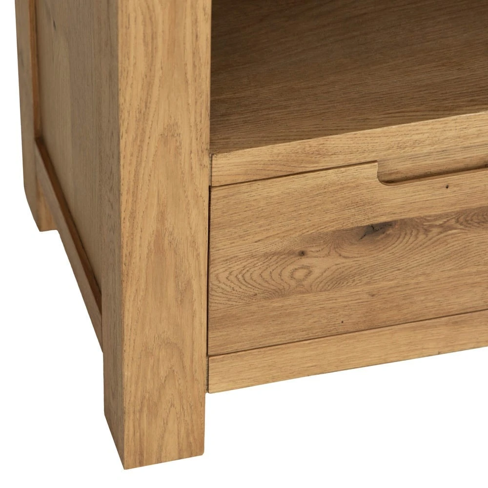 Quiet night in? This Oslo chunky oak TV unit epitomises cosy. At 95cm wide, it can easily accommodate standard 36” TV units, and gives you plenty of extra storage space too. The golden oak finish offsets dark TV screens, and the distinctive rounded corners and chunky square legs add an artisan feel.