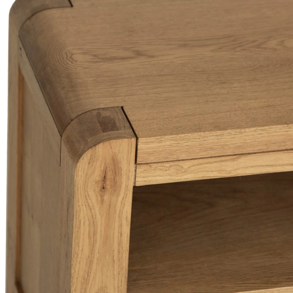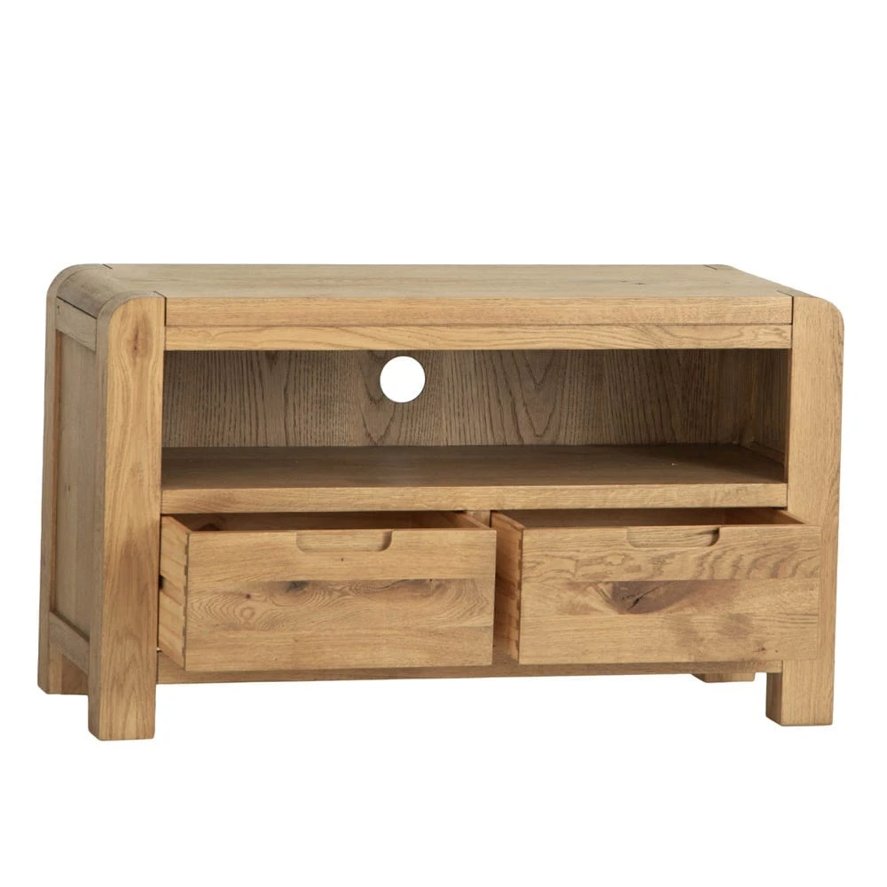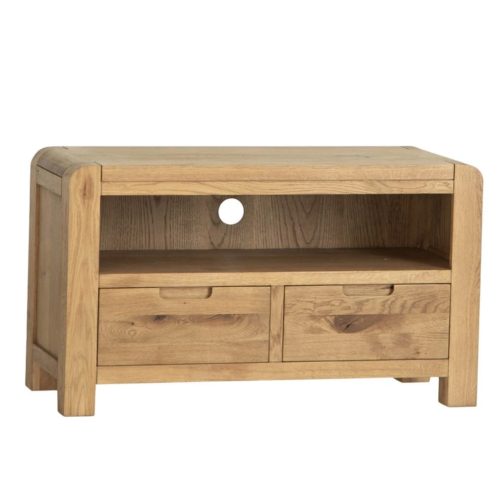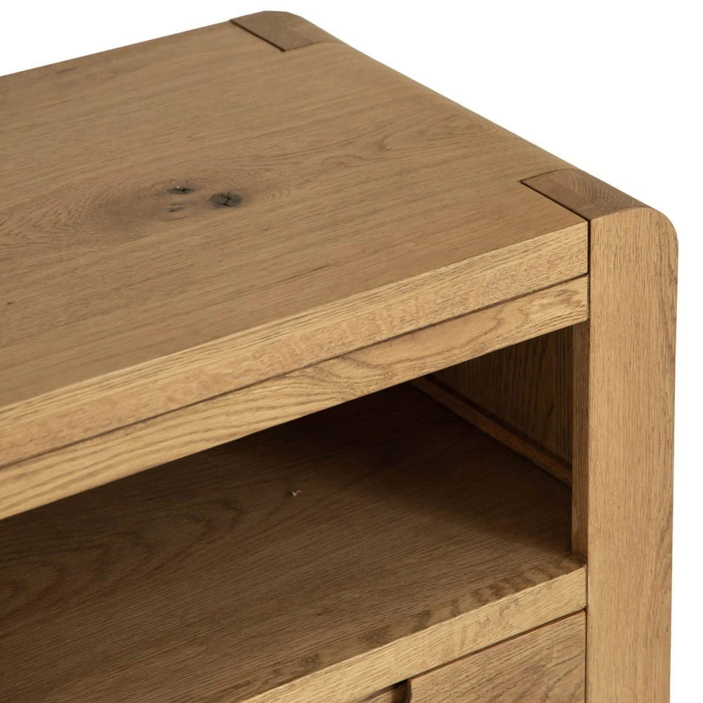 Quiet night in? This Oslo chunky oak TV unit epitomises cosy. At 95cm wide, it can easily accommodate standard 36” TV units, and gives you plenty of extra storage space too. The golden oak finish offsets dark TV screens, and the distinctive rounded corners and chunky square legs add an artisan feel.