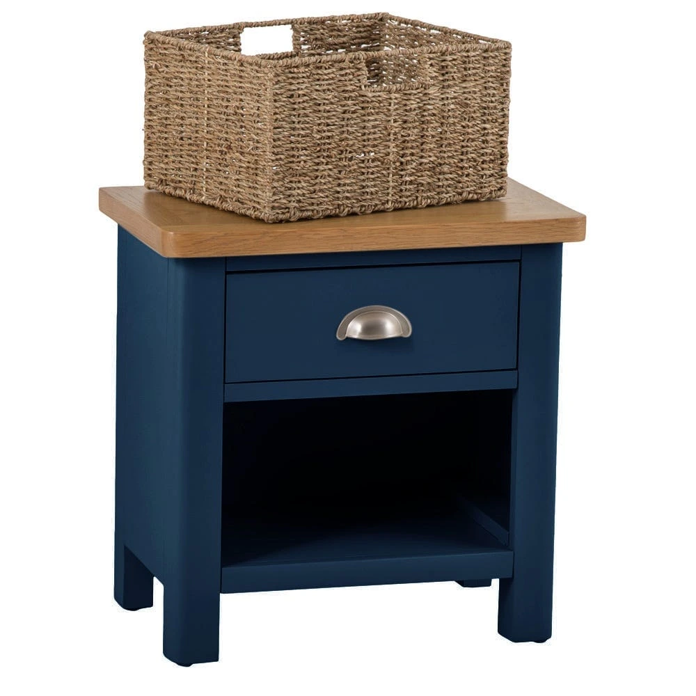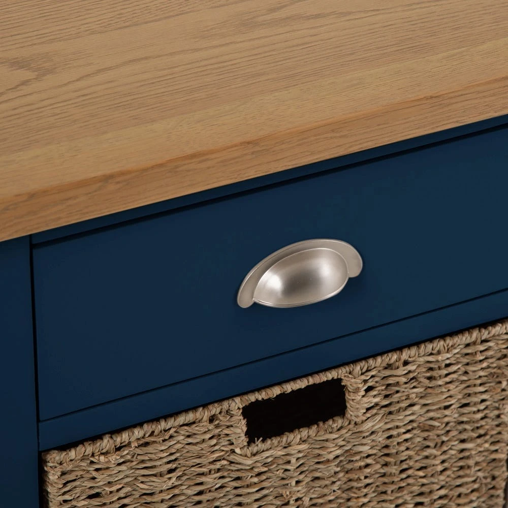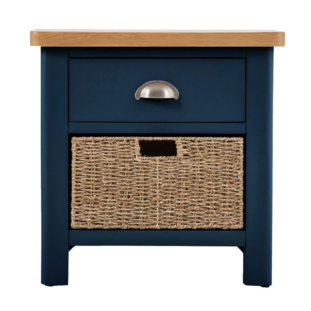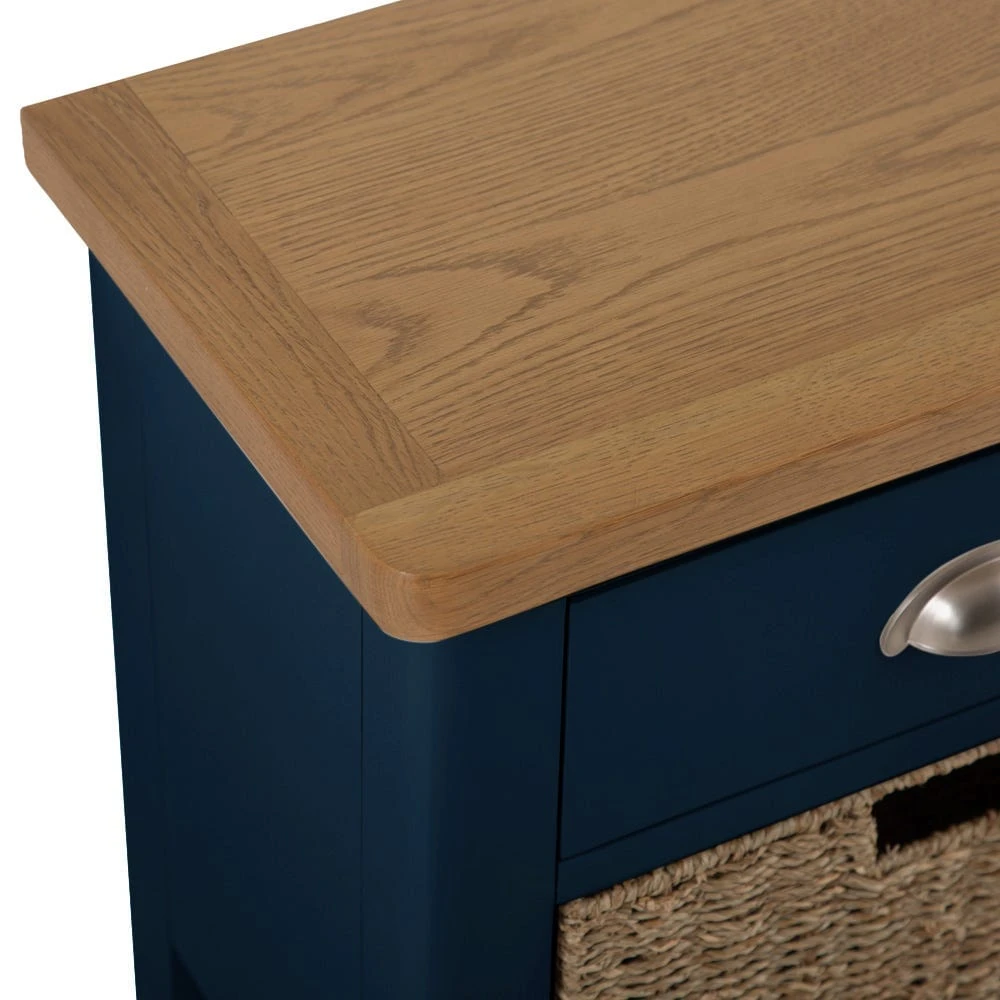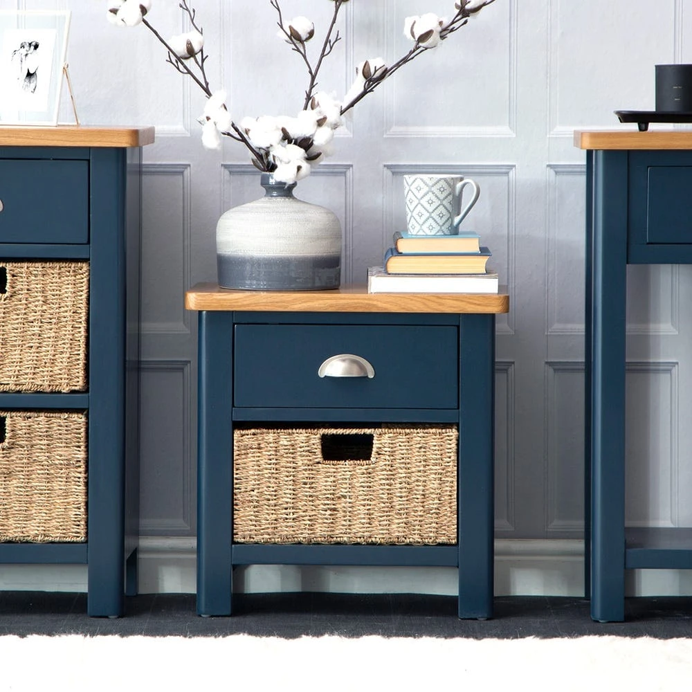 Our Rutland blue painted oak 1-drawer 1-wicker basket cabinet is a storage saviour with oodles of style. This petite piece has a spacious drawer for all your home essentials, and a removable basket for that quick tidy-up when you’re expecting guests.