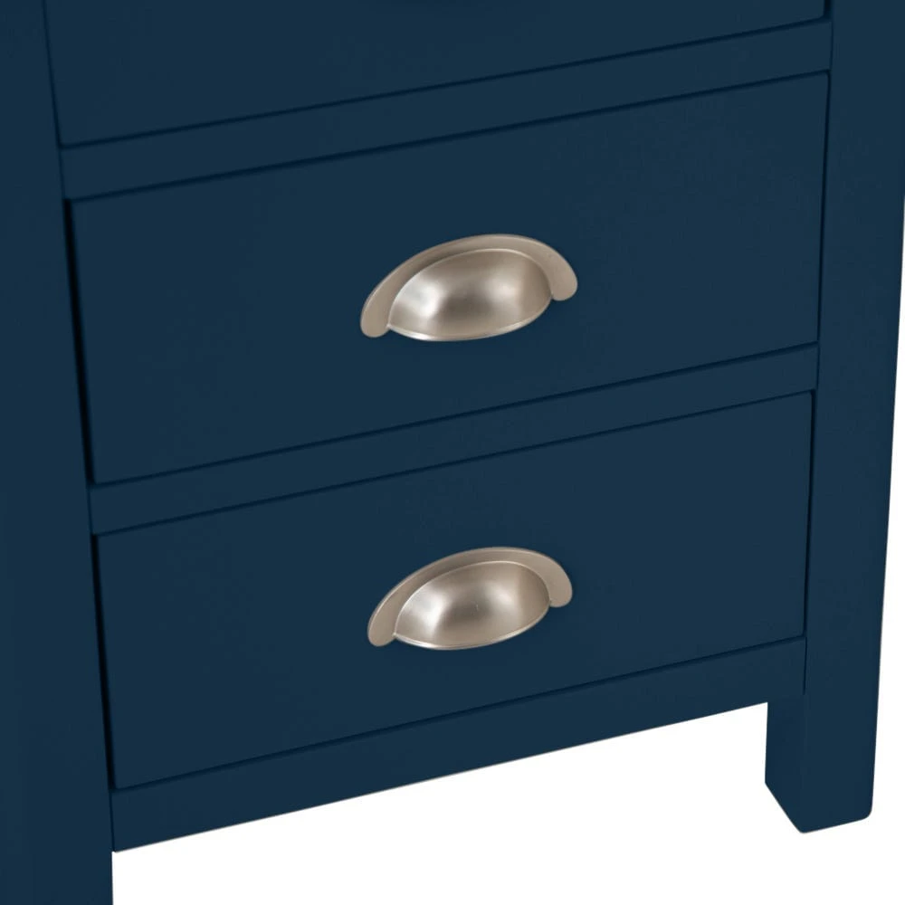 Our Rutland blue painted oak 3-drawer large bedside table makes the ideal companion to a perfectly peaceful bedtime. The midnight blue hue brings sophisticated serenity to any style room, and the natural oak top and rounded corners add a touch of cosiness.