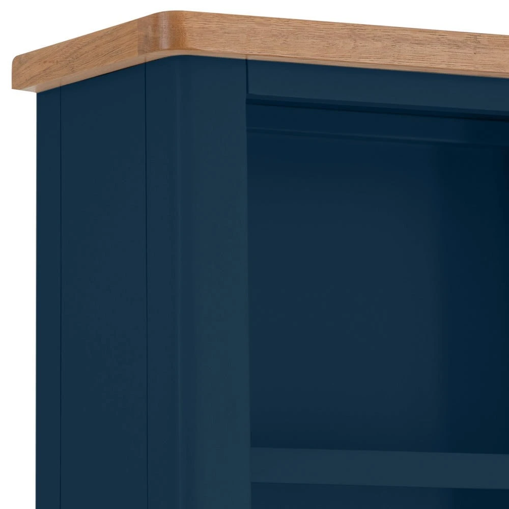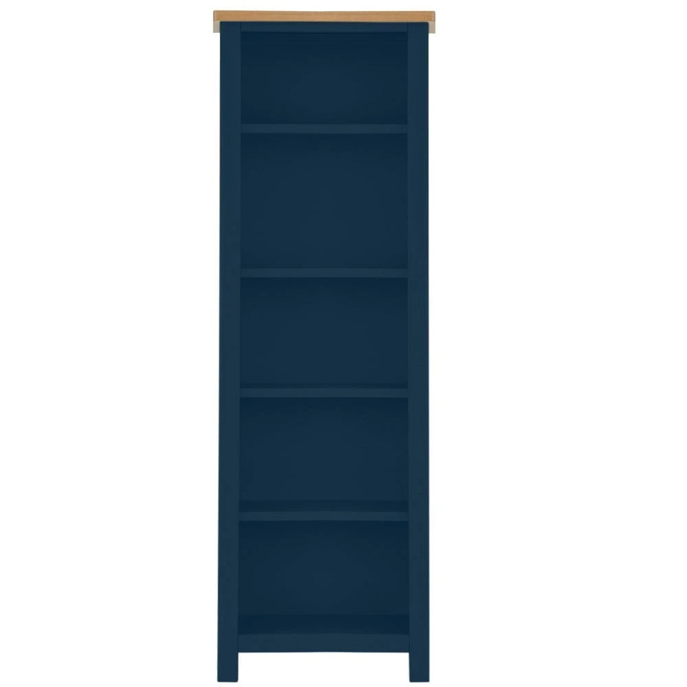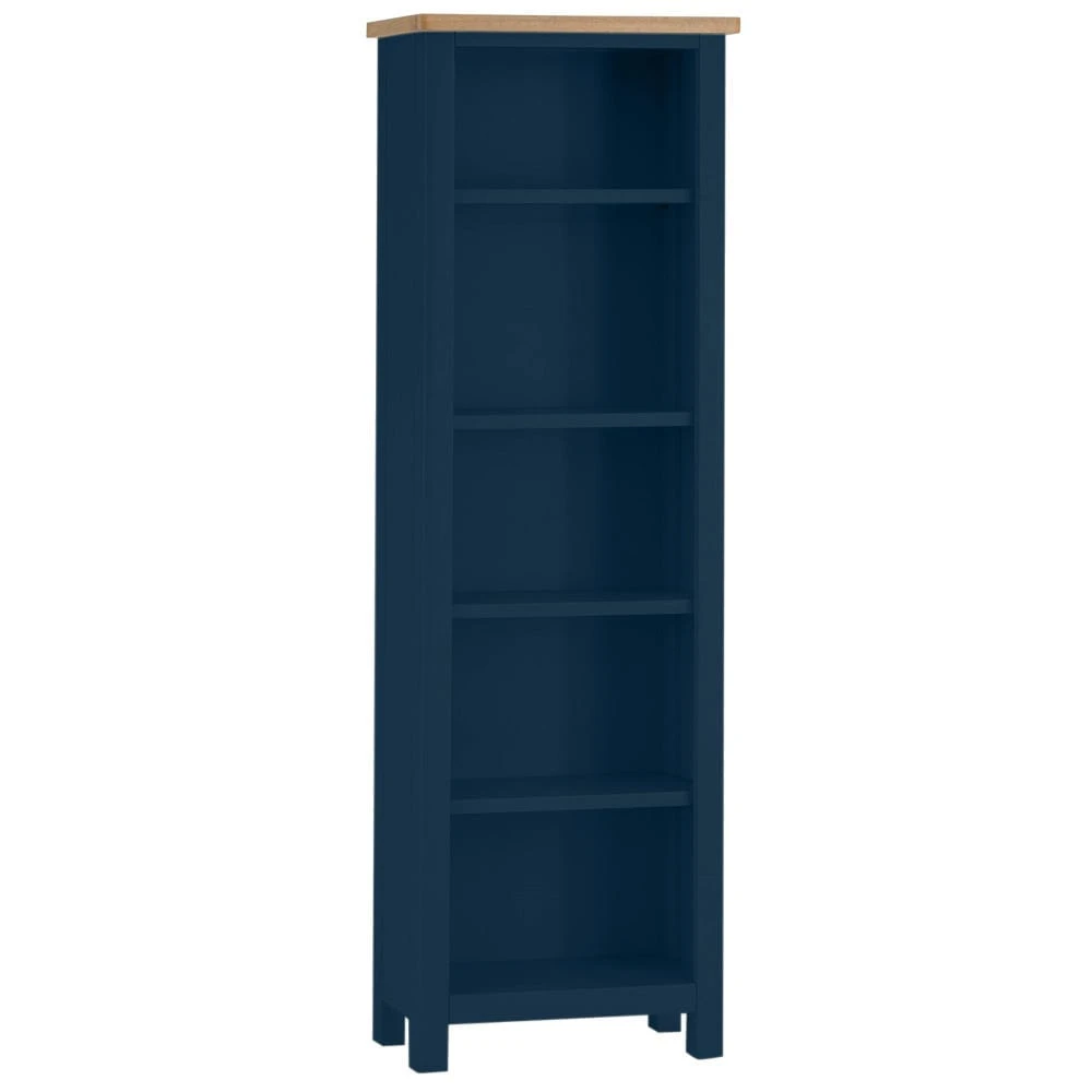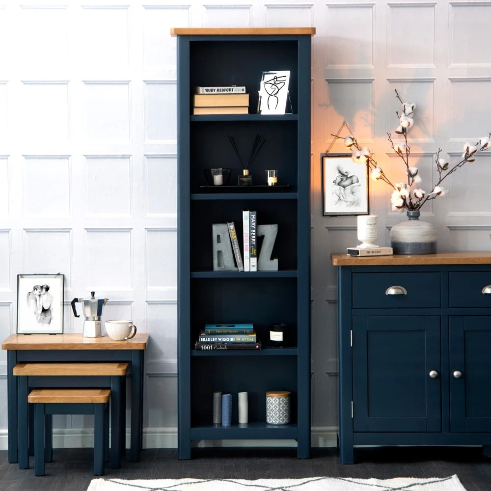 Our Rutland blue painted oak tall narrow bookcase gives you plenty of shelving even when floor space is limited. The five shelves are adjustable to accommodate your choice of contents – from chunky cookbooks to tiny trinkets. Wide vertical edges keep everything neatly in place.
