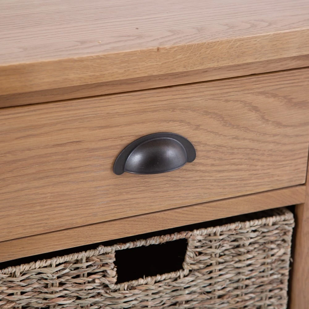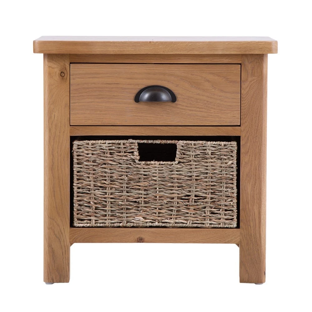 Our Rutland oak 1-drawer 1-wicker basket cabinet is a storage solution with style. Crafted from our honey-hued solid oak and oak veneer, it adds plenty of personality to your home. It has a lacquered finish that makes it easy to keep clean, and rounded corners that add a luxury touch. A single wicker basket lends texture to the smooth wood.