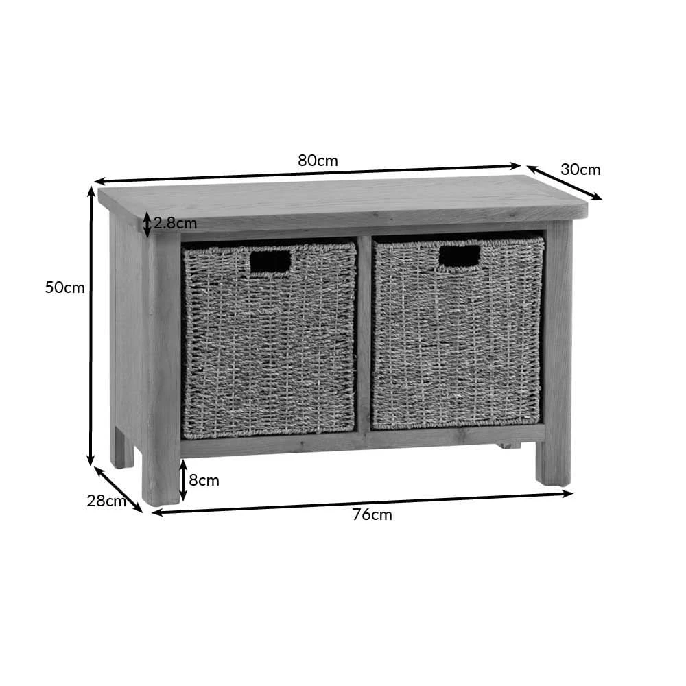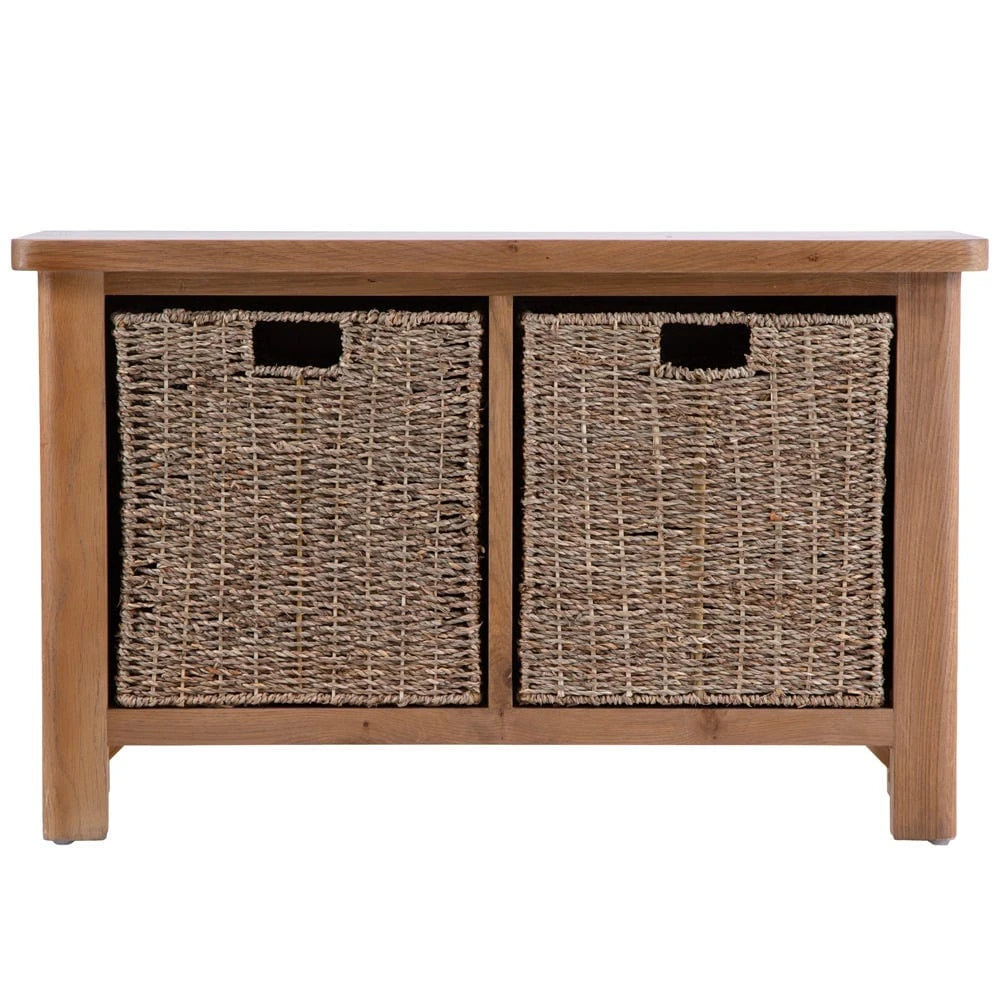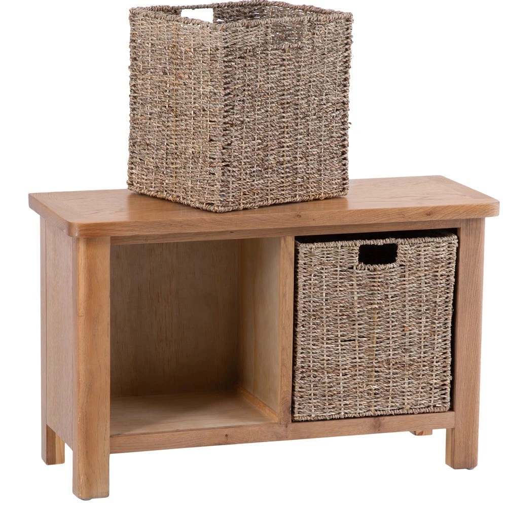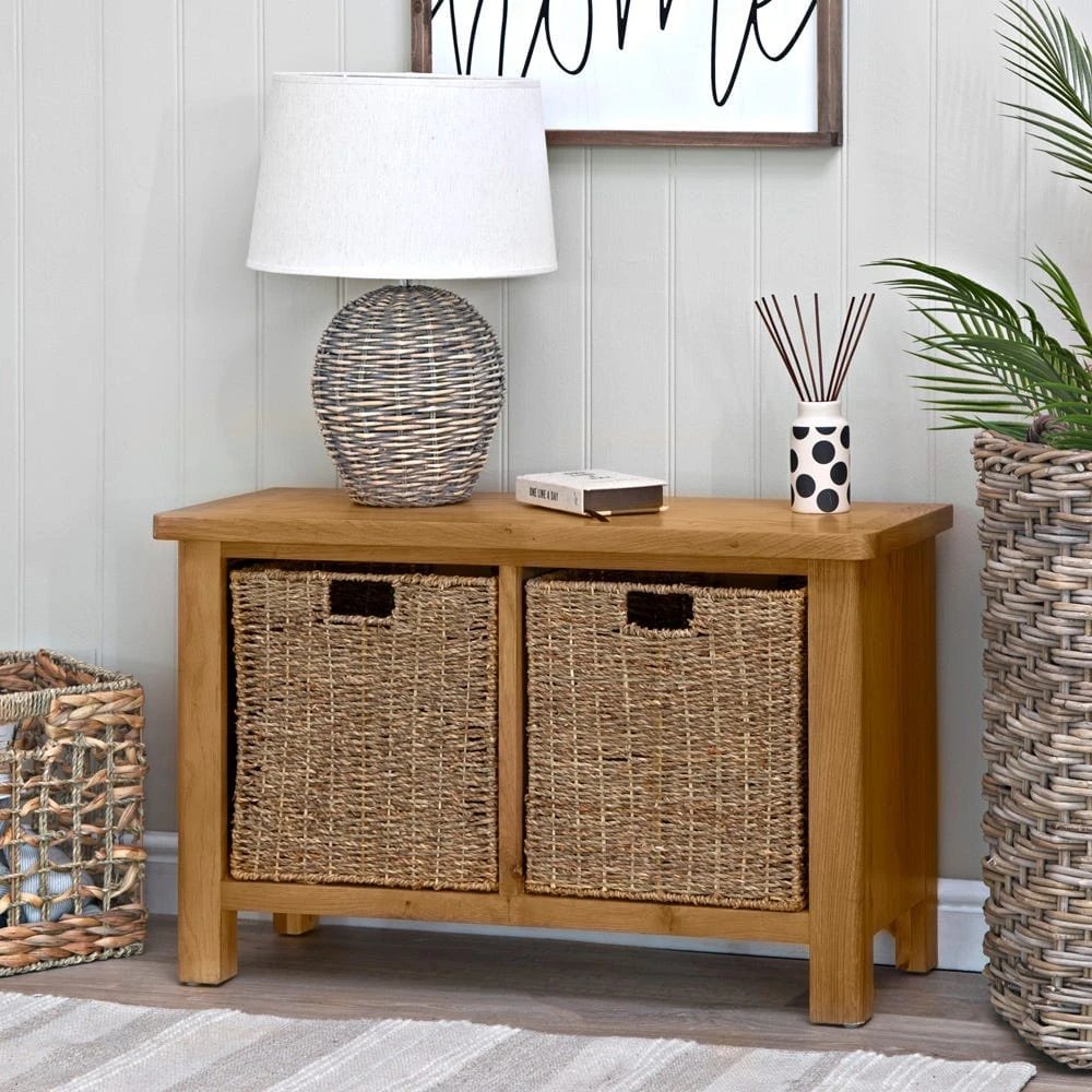 Magic away clutter and mess with our Rutland oak hall bench with wicker baskets. This clever piece combines seating with storage to make the most of the space in your hallway. It has a pair of deep removable baskets for shoes and boots, and the low height lets you perch while you put them on – just add cushions. Alternatively, you can use this bench to show off a warm lamp or your favourite ornaments. Our solid oak and oak veneer composition is perfectly sturdy, and its warm, caramel hue is complemented by our seagrass wicker to enhance any home.