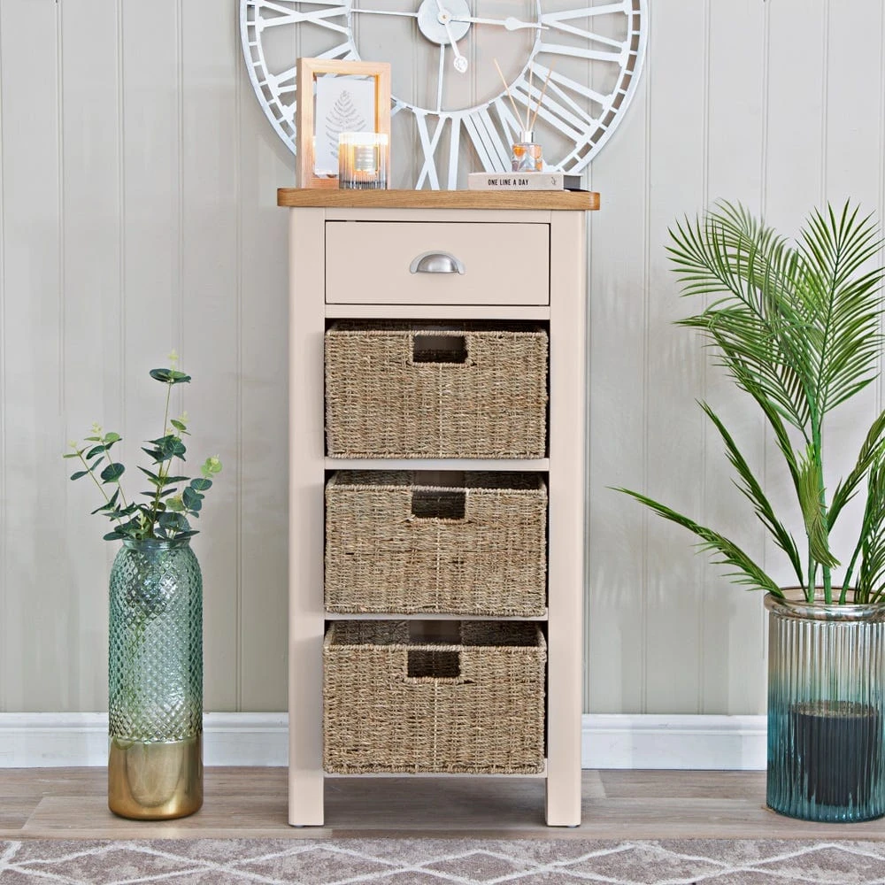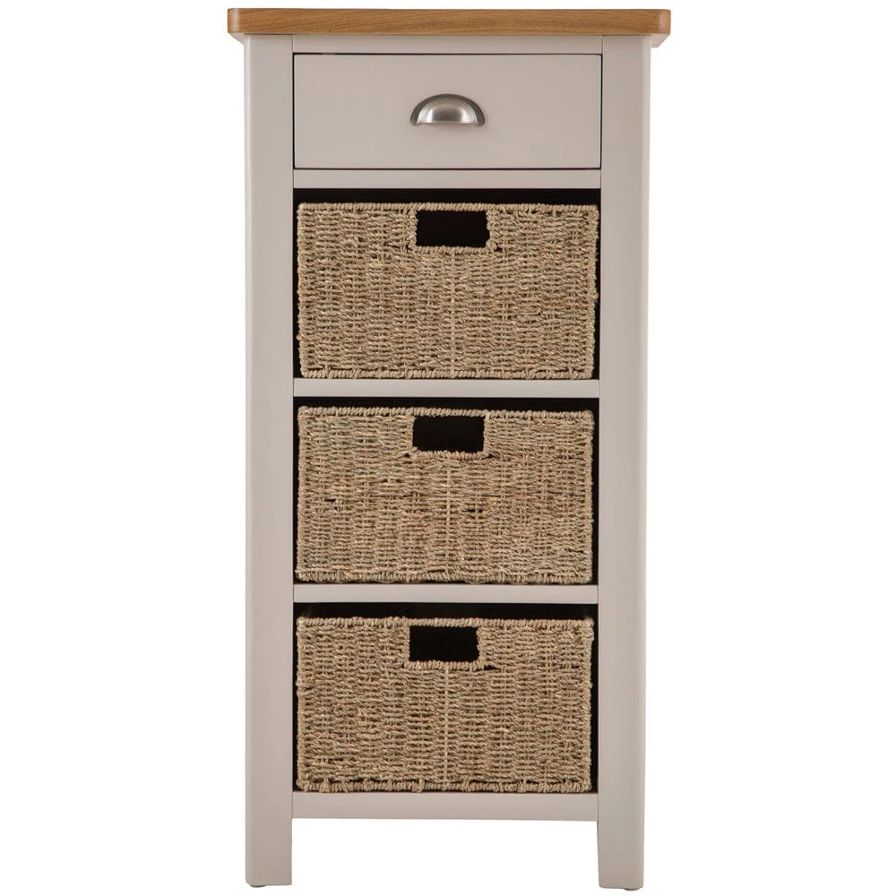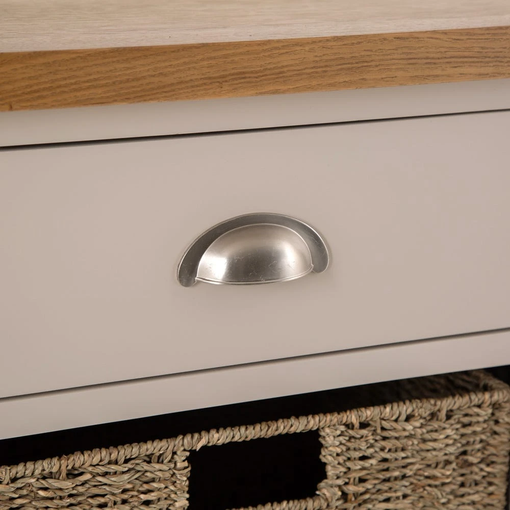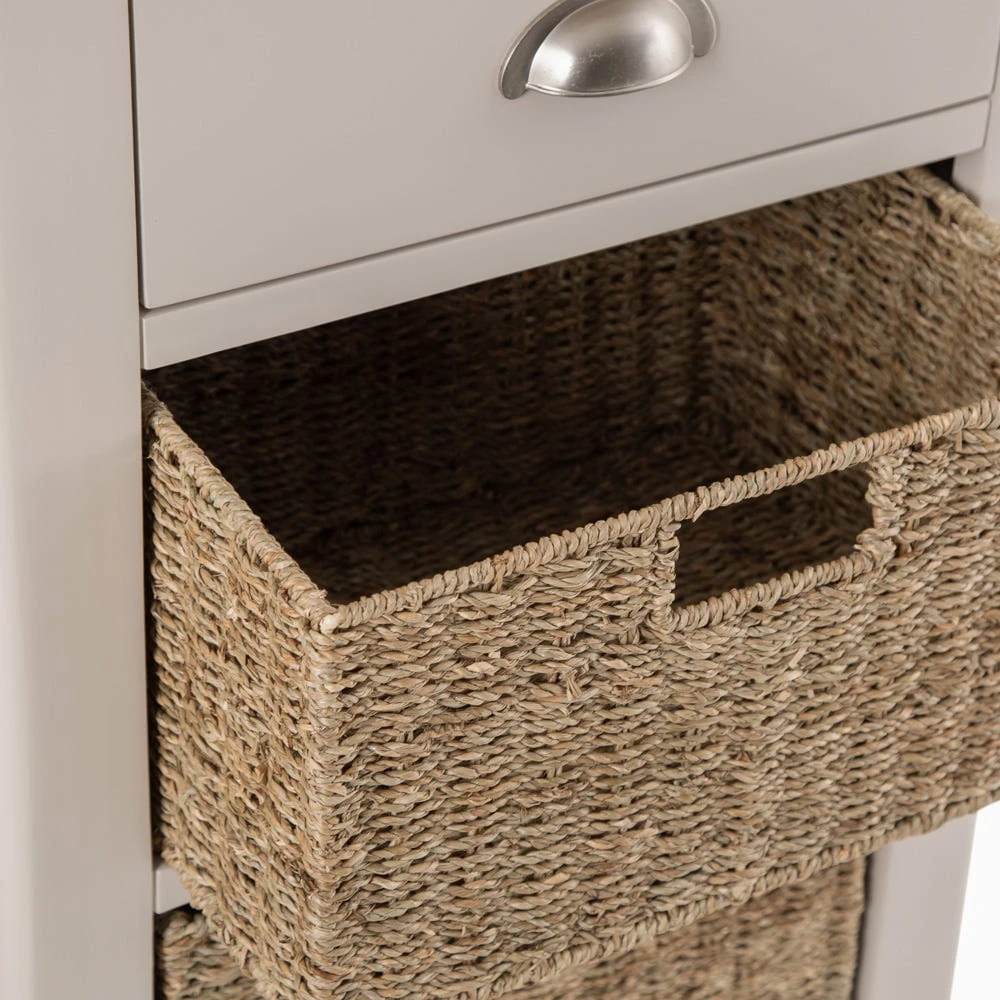 Keep your home organised and clutter-free with our Rutland painted oak 1-drawer 3-wicker basket cabinet. The elegant stone-grey finish complements both modern and traditional rooms, and the seagrass wicker and sturdy oak top add a natural charm. Our stylish chrome cup handle adds a touch of opulence to the neutral hue.