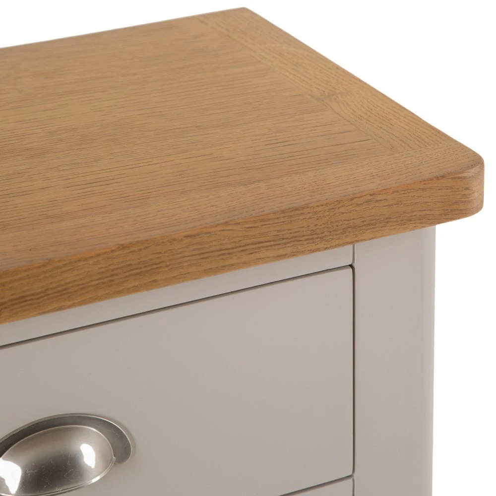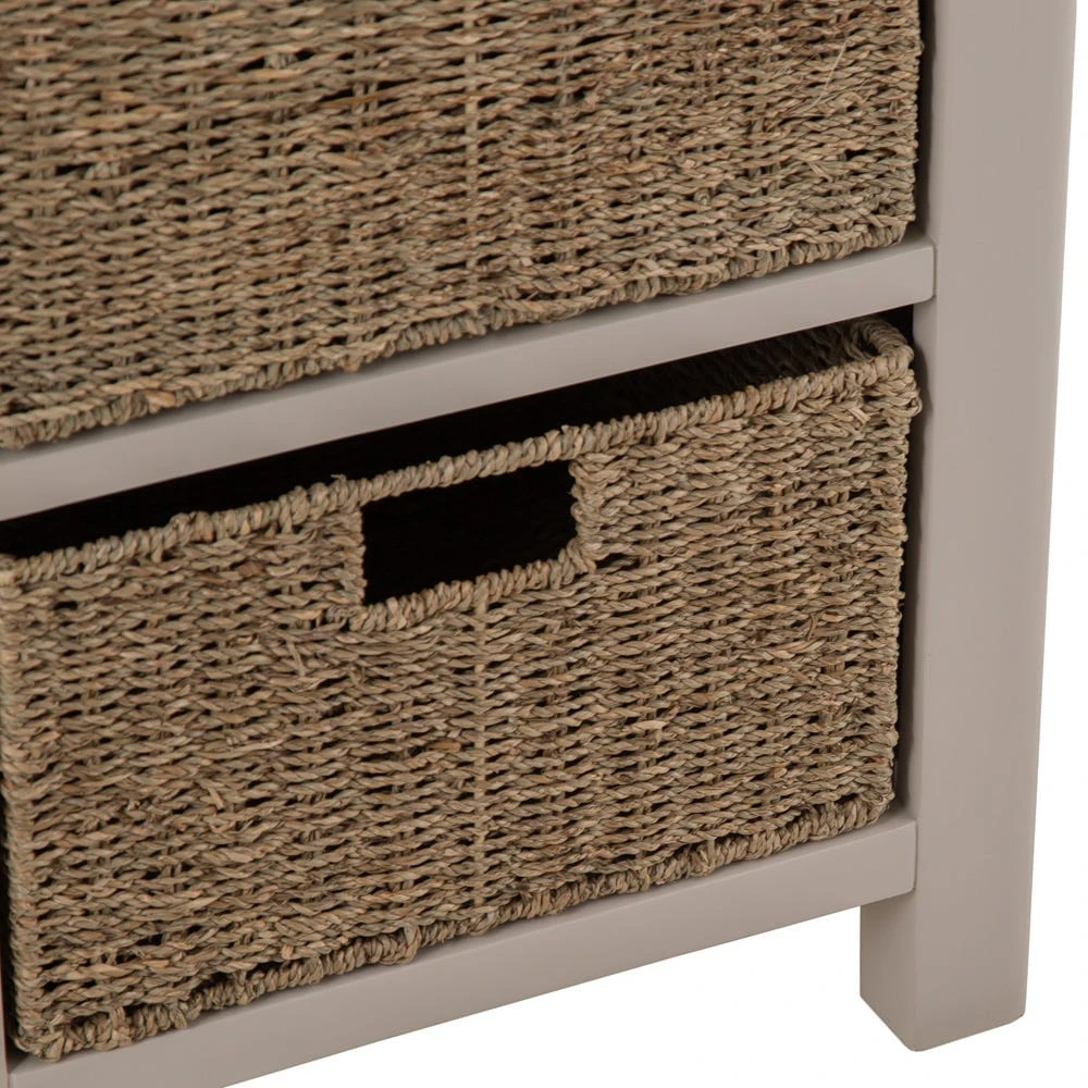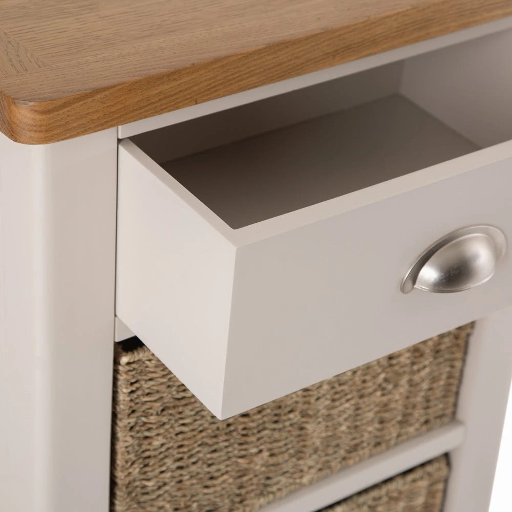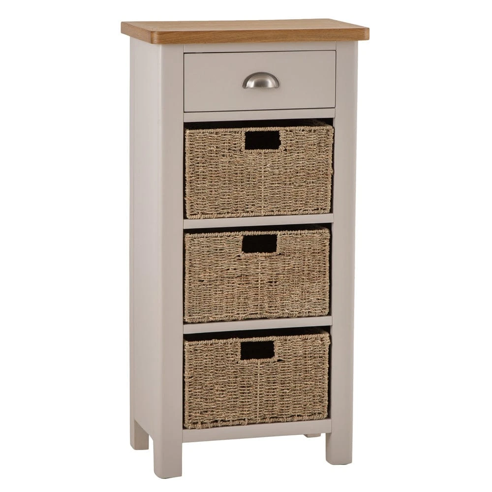 Keep your home organised and clutter-free with our Rutland painted oak 1-drawer 3-wicker basket cabinet. The elegant stone-grey finish complements both modern and traditional rooms, and the seagrass wicker and sturdy oak top add a natural charm. Our stylish chrome cup handle adds a touch of opulence to the neutral hue.