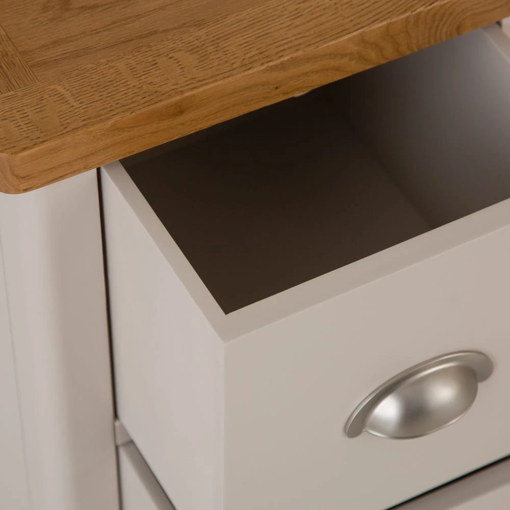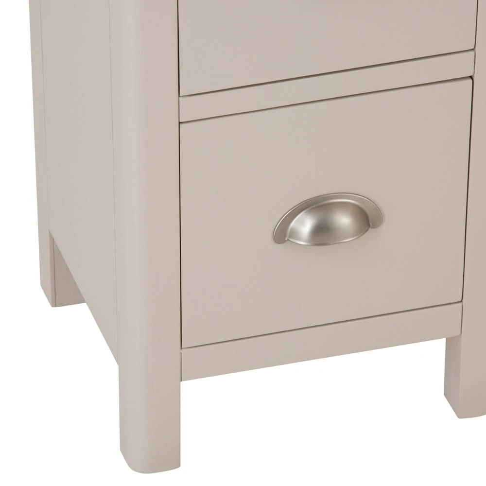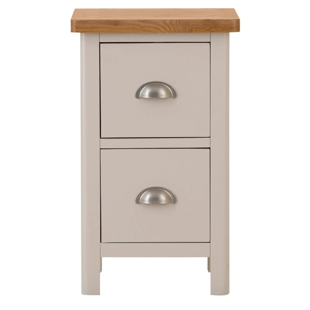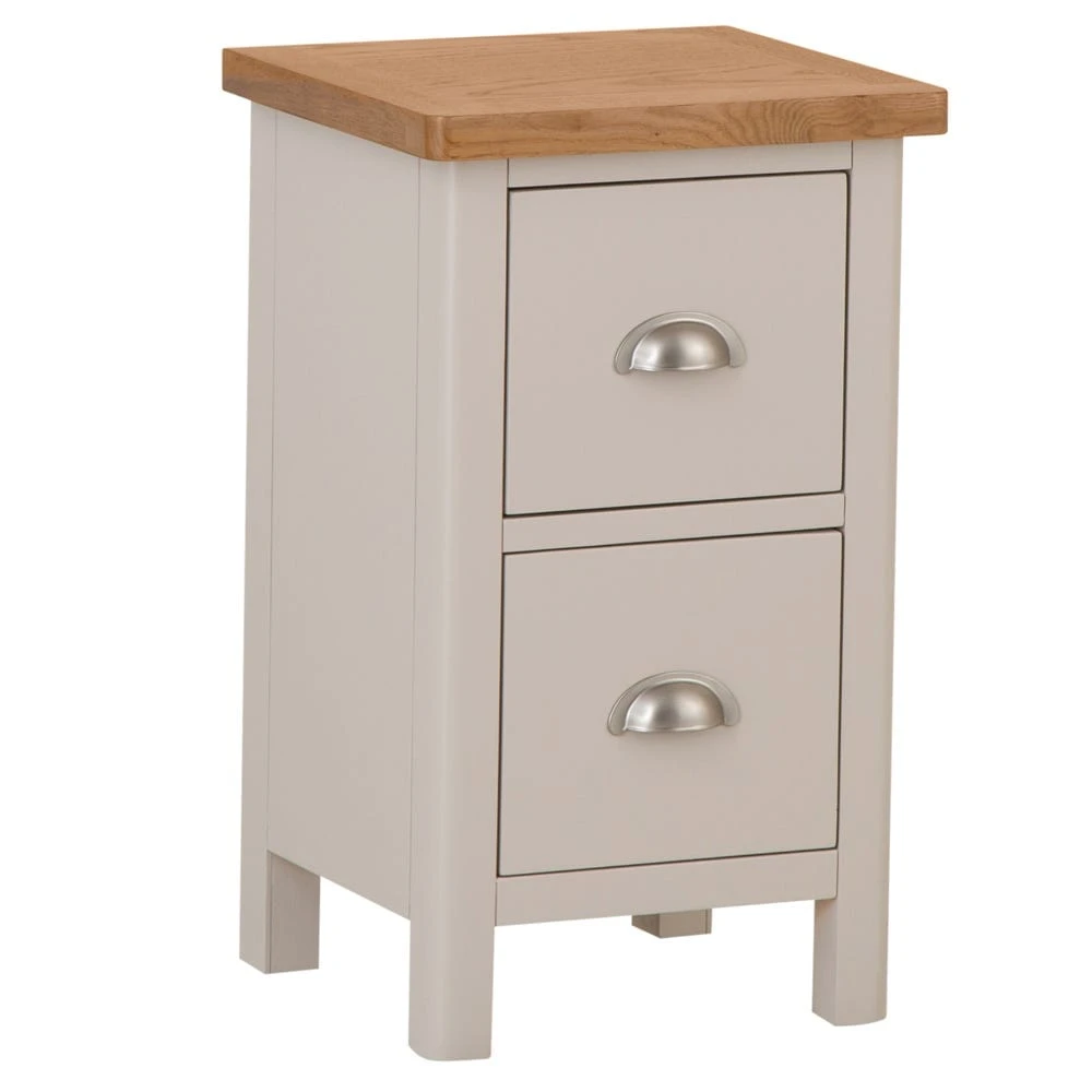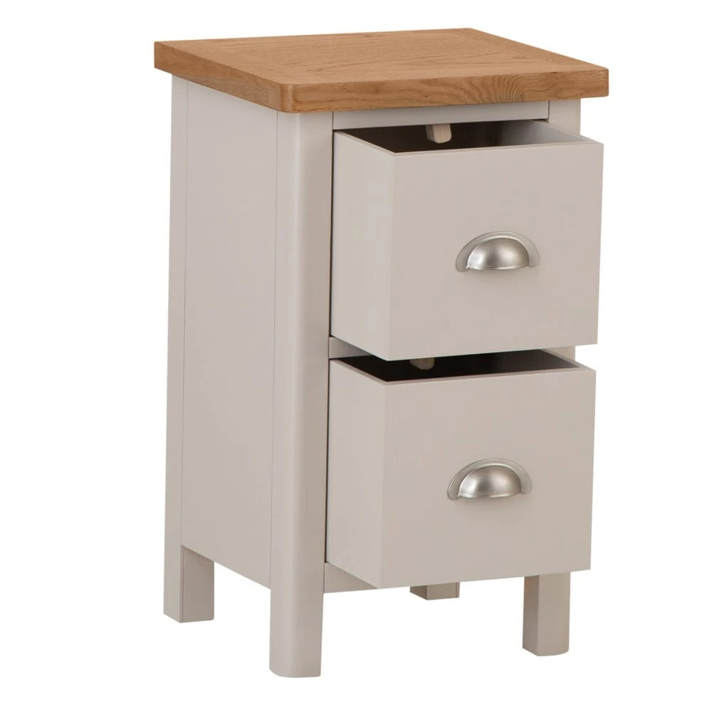 This Rutland painted oak 2-drawer slim bedside table is sure to elevate your bedtime routine. It’s slender enough to slot easily next to your bed while having ample space for a reading lamp and book.