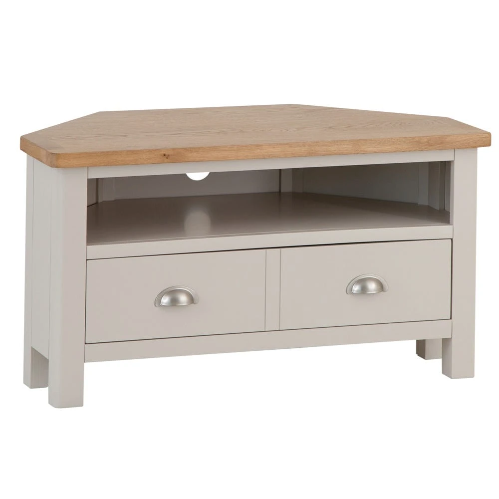Flop in front of a romcom or stay on the edge of your seat for a crime drama with this Rutland painted oak corner TV unit. It’s cleverly D-shaped to fit unobtrusively into corners, so you can enjoy maximum entertainment even when space is minimal.