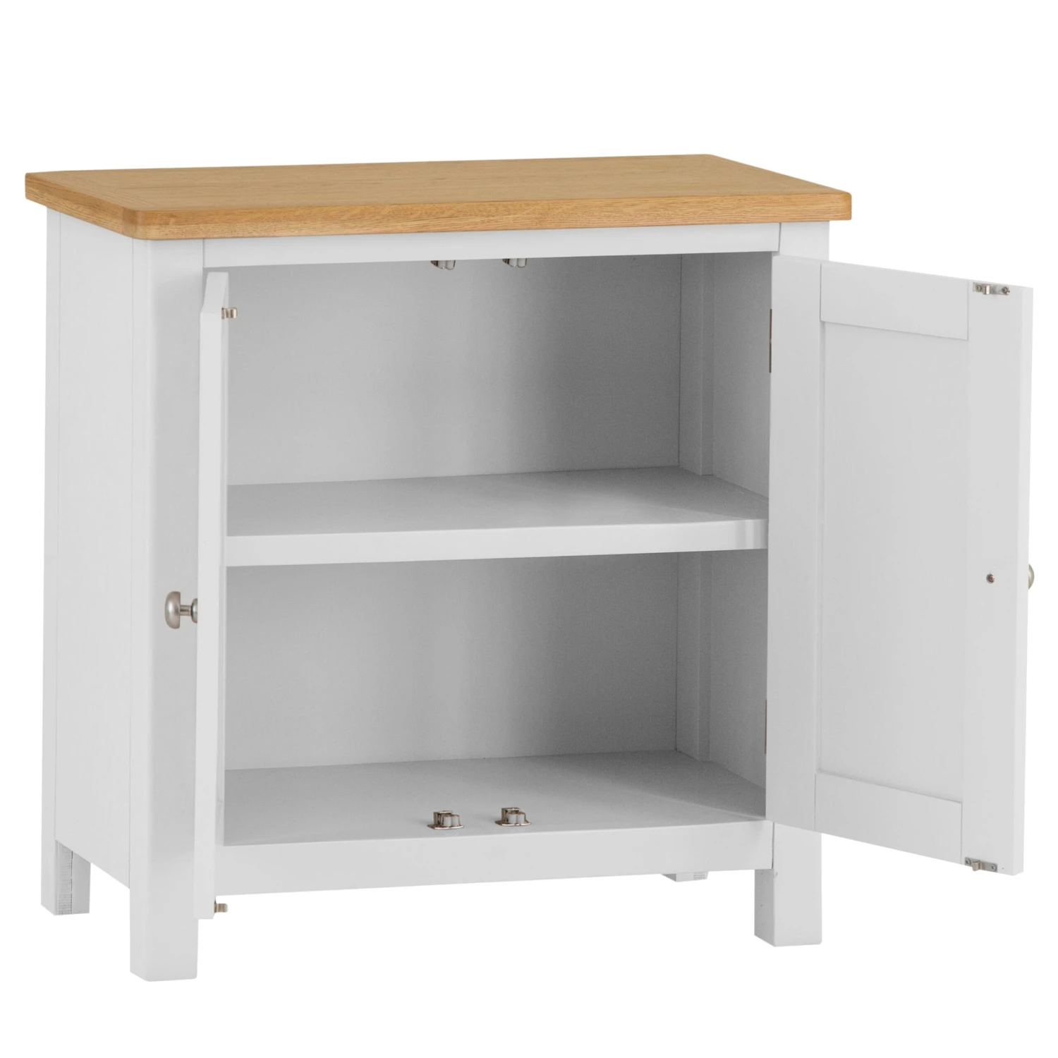 This stylish Rutland White painted oak 2-door cupboard provides handy storage in cosy spots. It’s compact enough to keep in a hallway for footwear or walking gear, and the oak top makes an attractive stand for a warm lamp or a bold floral display. You can also use this versatile cupboard for storing pots, pans and baking equipment to supplement fixed units in your kitchen.