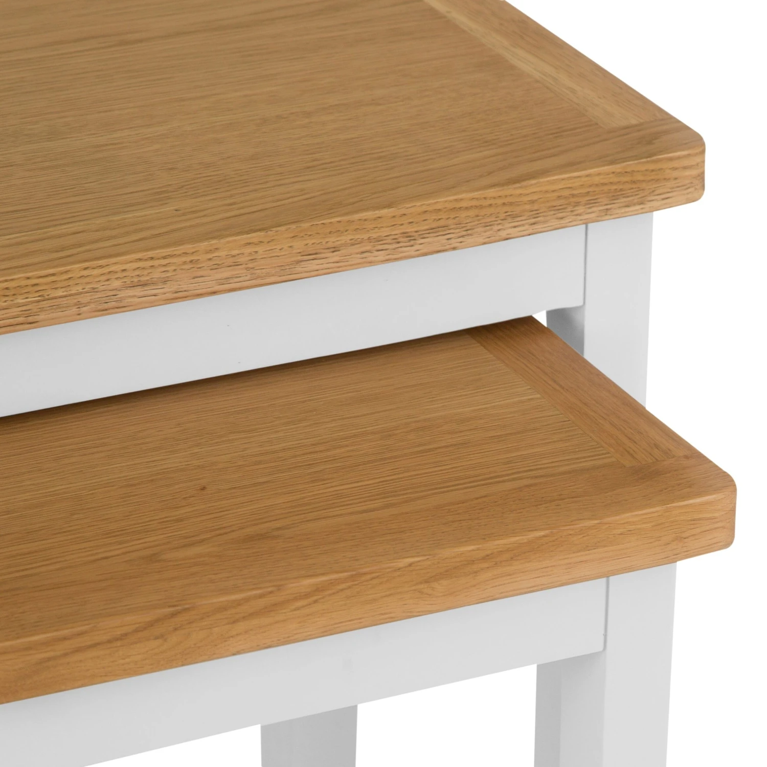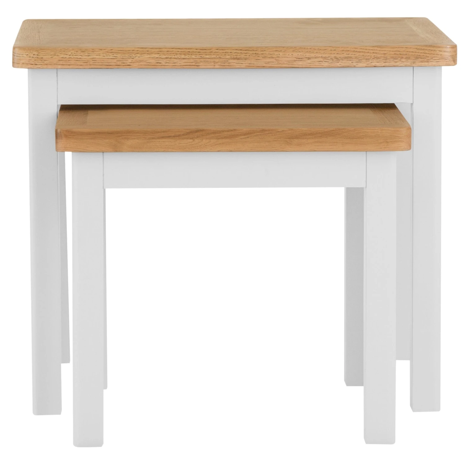 Our Rutland collection’s signature golden oak top complements the White-paintwork on the frame, for a winning colour combination that suits any space. Smooth, rounded corners offset the chunky square legs. This nest of tables also makes an attractive double display stand for your favourite ornaments, candles and framed photos.
