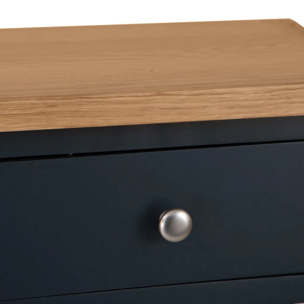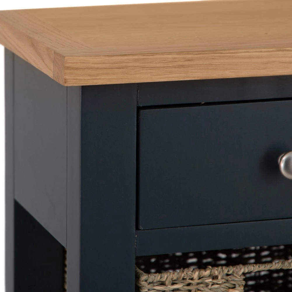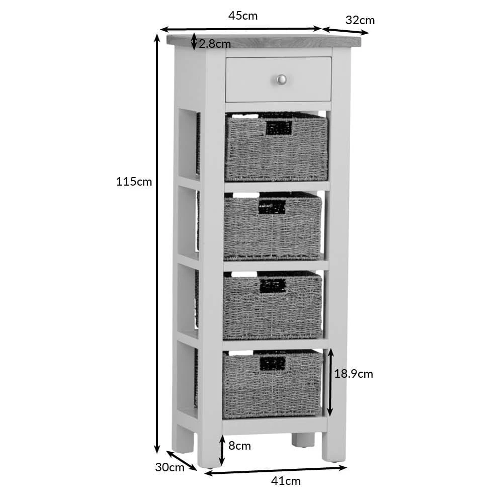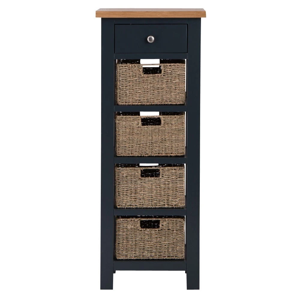 This Salisbury blue painted oak 5-drawer tallboy with wicker baskets combines a single drawer with four large wicker baskets to answer all your storage needs. The topmost fixed drawer is ideal for your favourite accessories or beauty products, while the removable baskets can accommodate clothes, shoes, or sports gear – the choice is yours.