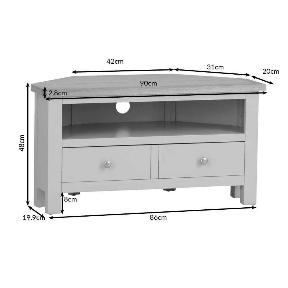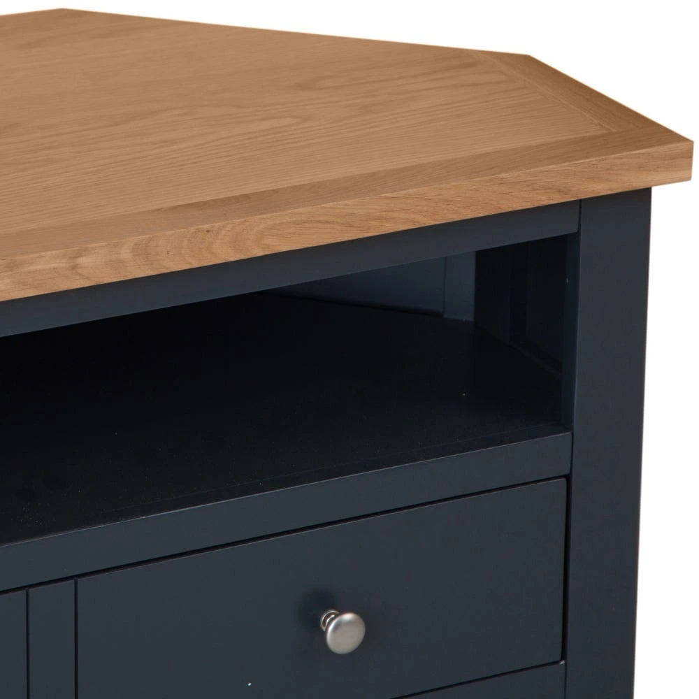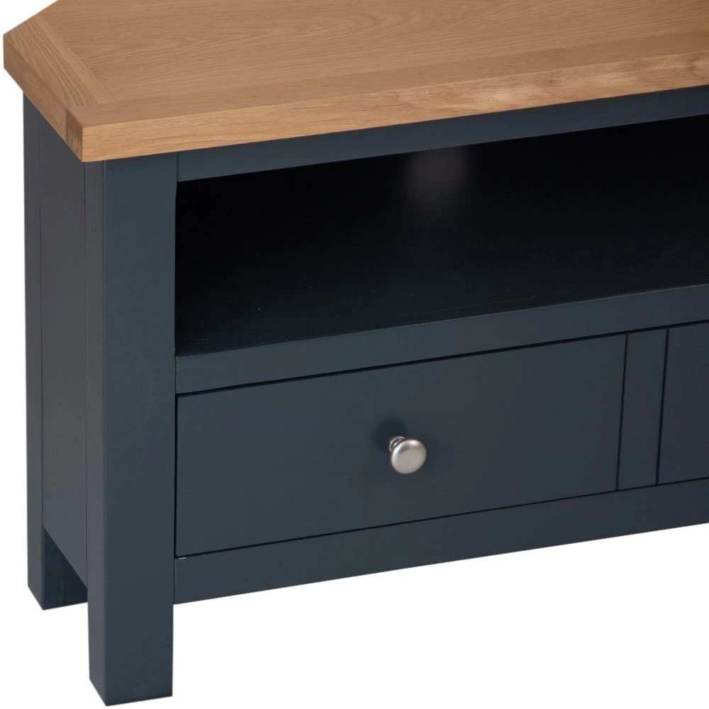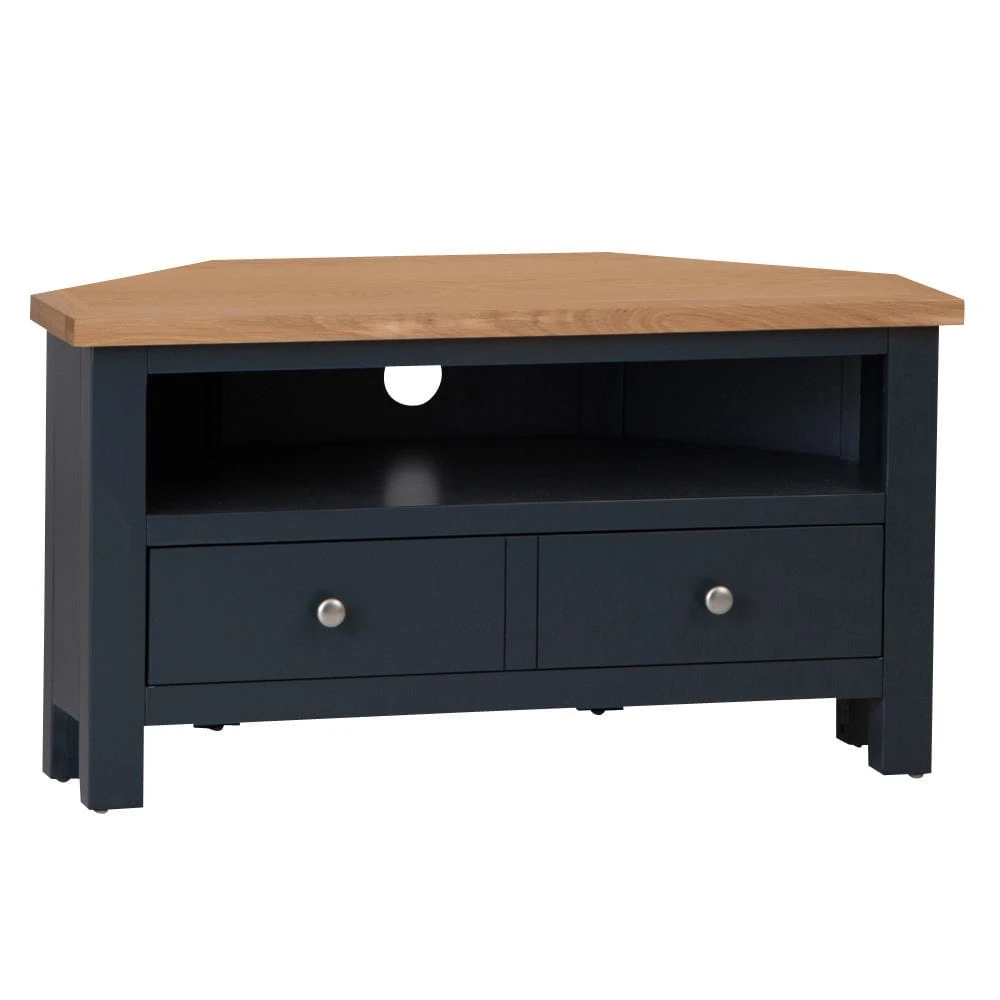 This Salisbury blue painted oak corner TV unit slides neatly into any cosy corner of your living room to serve up entertainment with a side-order of style.